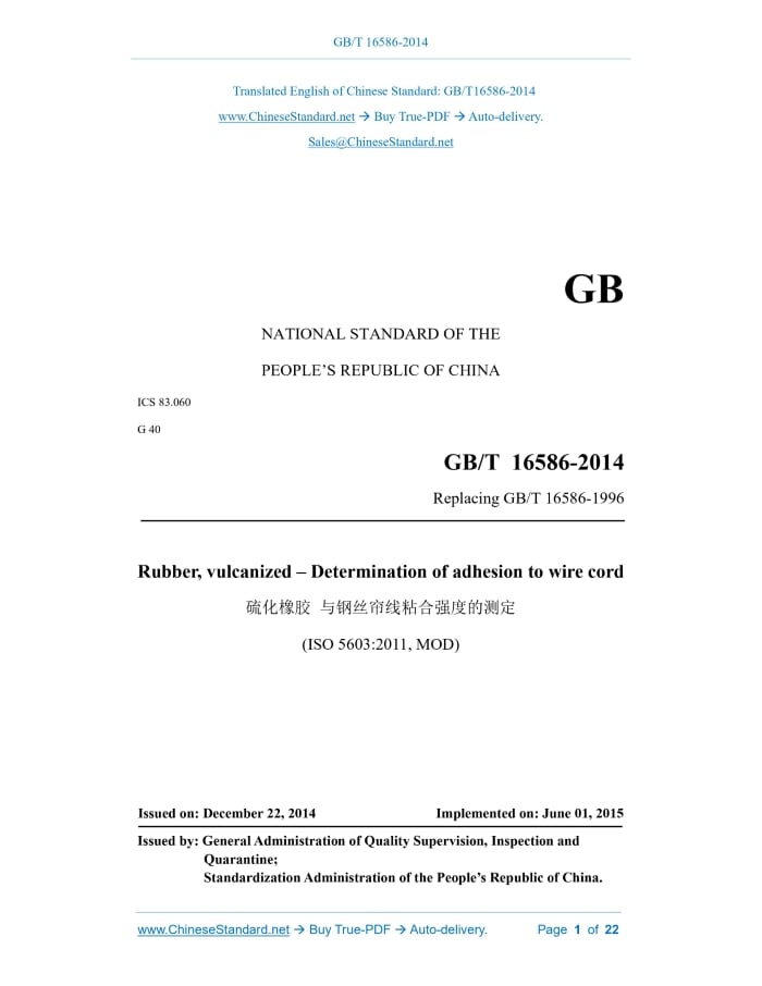 GB/T 16586-2014: Rubber, vulcanized -- Determination of adhesion to wire cord Delivery: 9 seconds. True-PDF full-copy in English & invoice will be downloaded + auto-delivered via email. See step-by-step procedure Status: Valid GB/T 16586: Historical versions