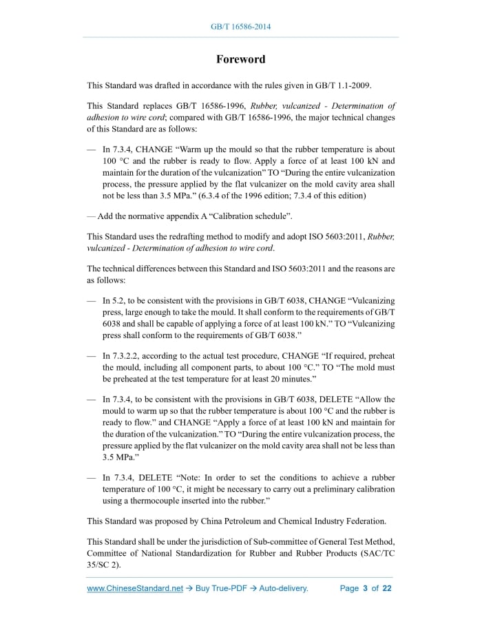 Similar standardsGB/T 16586-2014: Rubber, vulcanized -- Determination of adhesion to wire cord---This is an excerpt. Full copy of true-PDF in English version (including equations, symbols, images, flow-chart, tables, and figures etc.), auto-downloaded/delivered in 9 seconds, can be purchased online: https://www.ChineseStandard.net/PDF.aspx/GBT16586-2014GB NATIONAL STANDARD OF THE PEOPLE’S REPUBLIC OF CHINA ICS 83.060 G 40 Replacing GB/T 16586-1996 Rubber, vulcanized – Determination of adhesion to wire cord (ISO 5603:2011, MOD) ISSUED ON: DECEMBER 22, 2014 IMPLEMENTED ON: JUNE 01, 2015 Issued by: General Administration of Quality Supervision, Inspection and Quarantine; Standardization Administration of the People’s Republic of China. Table of ContentsForeword ... 3 1 Scope ... 5 2 Normative references ... 5 3 Principle ... 5 4 Materials ... 6 5 Apparatus ... 6 6 Calibration ... 14 7 Test piece ... 14 8 Procedure ... 17 9 Expression of results ... 19 10 Test report ... 19 Annex A (normative) Calibration schedule ... 21ForewordThis Standard was drafted in accordance with the rules given in GB/T 1.1-2009. This Standard replaces GB/T 16586-1996, Rubber, vulcanized - Determination of adhesion to wire cord; compared with GB/T 16586-1996, the major technical changes of this Standard are as follows: — In 7.3.4, CHANGE “Warm up the mould so that the rubber temperature is about 100 °C and the rubber is ready to flow. Apply a force of at least 100 kN and maintain for the duration of the vulcanization” TO “During the entire vulcanization process, the pressure applied by the flat vulcanizer on the mold cavity area shall not be less than 3.5 MPa.” (6.3.4 of the 1996 edition; 7.3.4 of this edition) — Add the normative appendix A “Calibration schedule”. This Standard uses the redrafting method to modify and adopt ISO 5603:2011, Rubber, vulcanized - Determination of adhesion to wire cord. The technical differences between this Standard and ISO 5603:2011 and the reasons are as follows: — In 5.2, to be consistent with the provisions in GB/T 6038, CHANGE “Vulcanizing press, large enough to take the mould. It shall conform to the requirements of GB/T 6038 and shall be capable of applying a force of at least 100 kN.” TO “Vulcanizing press shall conform to the requirements of GB/T 6038.” — In 7.3.2.2, according to the actual test procedure, CHANGE “If required, preheat the mould, including all component parts, to about 100 °C.” TO “The mold must be preheated at the test temperature for at least 20 minutes.” — In 7.3.4, to be consistent with the provisions in GB/T 6038, DELETE “Allow the mould to warm up so that the rubber temperature is about 100 °C and the rubber is ready to flow.” and CHANGE “Apply a force of at least 100 kN and maintain for the duration of the vulcanization.” TO “During the entire vulcanization process, the pressure applied by the flat vulcanizer on the mold cavity area shall not be less than 3.5 MPa.” — In 7.3.4, DELETE “Note: In order to set the conditions to achieve a rubber temperature of 100 °C, it might be necessary to carry out a preliminary calibration using a thermocouple inserted into the rubber.” This Standard was proposed by China Petroleum and Chemical Industry Federation. This Standard shall be under the jurisdiction of Sub-committee of General Test Method, Committee of National Standardization for Rubber and Rubber Products (SAC/TC 35/SC 2). Rubber, vulcanized – Determination of adhesion to wire cord1 ScopeThis Standard specifies two methods for determining the adhesion strength of vulcanized rubber to wire cord which is embedded in the rubber: method 1 and method 2. The two methods do not necessarily give the same results. They are applicable primarily to test pieces prepared in the laboratory under standard conditions and used for the development and control of materials and processes utilized in the manufacture of products reinforced with wire cord. Note: This Standard can also be used for single wire, for example bead wire. Method 1 reduces the dependence of the measured adhesion on the modulus and strength properties of the rubber.2 Normative referencesThe following referenced documents are indispensable for the application of this document. For dated references, only the edition cited applies. For undated references, the latest edition of the referenced document (including any amendments) applies. GB/T 2941, Rubber - General procedures for preparing and conditioning test pieces for physical test methods (GB/T 2941-2006, ISO 23529:2004, IDT) GB/T 6038, Rubber test mixes - Preparation, mixing and vulcanization - Equipment and procedures (GB/T 6038-2006, ISO 2393:1994, MOD) GB/T 17200-2008, Technical specification for tensile compression and flexural testing machines for rubber and plastics (constant rate of traverse) (ISO 5893:2002, IDT) GB/T 25269-2010, Rubber - Guide to the calibration of test equipment (ISO 18899:2004, IDT)3 PrincipleThe adhesion strength is determined by measuring the force required to pull out a single cord from the surrounding rubber of a prepared test piece. The force is directed along the axis of the cord, using a test jig containing a suitably chosen circular- or square- shaped hole to ensure uniformity of stress. The test piece preparation procedure follows that of method 1, except that the mould spacers and the reinforcement strips are omitted, and that test piece construction prior to vulcanization is carried out on a special building rack similar to the mould (see Figure 4). The unvulcanized formed test pieces shall be carefully removed from the building rack by pressing uniformly from the rear, placed in a desiccated container and stored at standard laboratory temperature (see GB/T 2941) until vulcanization. Test pieces shall be vulcanized within a maximum of 12 h. 7.3.4 Vulcanization of test piece Place the made-up mould in the press already set at the vulcanization temperat