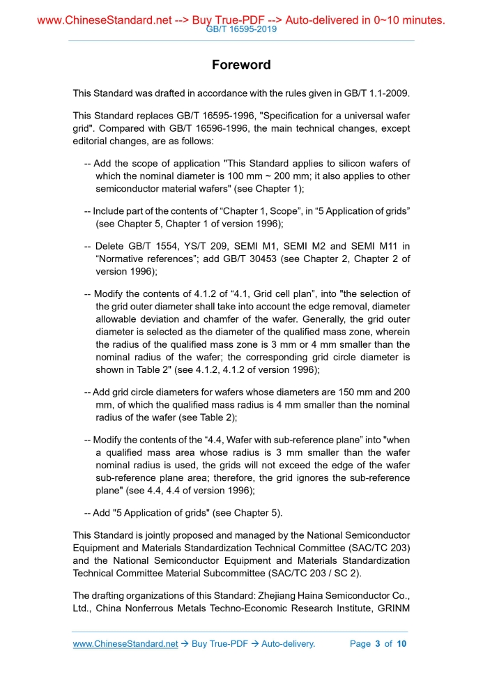Similar standardsGB/T 16595-2019: Specification for a Universal Wafer Grid---This is an excerpt. Full copy of true-PDF in English version (including equations, symbols, images, flow-chart, tables, and figures etc.), auto-downloaded/delivered in 9 seconds, can be purchased online: https://www.ChineseStandard.net/PDF.aspx/GBT16595-2019NATIONAL STANDARD OF THE PEOPLE’S REPUBLIC OF CHINA ICS 29.045 H 80 Replacing GB/T 16595-1996 Specification for a Universal Wafer Grid ISSUED ON: MARCH 25, 2019 IMPLEMENTED ON: FEBRUARY 01, 2020 Issued by: State Administration for Market Regulation; Standardization Administration of the People’s Republic of China. Table of ContentsForeword ... 3 1 Scope ... 5 2 Normative references ... 5 3 Terms and definitions ... 5 4 Grid cell layout ... 5 5 Application of grids ... 10ForewordThis Standard was drafted in accordance with the rules given in GB/T 1.1-2009. This Standard replaces GB/T 16595-1996, "Specification for a universal wafer grid". Compared with GB/T 16596-1996, the main technical changes, except editorial changes, are as follows: -- Add the scope of application "This Standard applies to silicon wafers of which the nominal diameter is 100 mm ~ 200 mm; it also applies to other semiconductor material wafers" (see Chapter 1); -- Include part of the contents of “Chapter 1, Scope”, in “5 Application of grids” (see Chapter 5, Chapter 1 of version 1996); -- Delete GB/T 1554, YS/T 209, SEMI M1, SEMI M2 and SEMI M11 in “Normative references”; add GB/T 30453 (see Chapter 2, Chapter 2 of version 1996); -- Modify the contents of 4.1.2 of “4.1, Grid cell plan”, into "the selection of the grid outer diameter shall take into account the edge removal, diameter allowable deviation and chamfer of the wafer. Generally, the grid outer diameter is selected as the diameter of the qualified mass zone, wherein the radius of the qualified mass zone is 3 mm or 4 mm smaller than the nominal radius of the wafer; the corresponding grid circle diameter is shown in Table 2" (see 4.1.2, 4.1.2 of version 1996); -- Add grid circle diameters for wafers whose diameters are 150 mm and 200 mm, of which the qualified mass radius is 4 mm smaller than the nominal radius of the wafer (see Table 2); -- Modify the contents of the “4.4, Wafer with sub-reference plane” into "when a qualified mass area whose radius is 3 mm smaller than the wafer nominal radius is used, the grids will not exceed the edge of the wafer sub-reference plane area; therefore, the grid ignores the sub-reference plane" (see 4.4, 4.4 of version 1996); -- Add "5 Application of grids" (see Chapter 5). This Standard is jointly proposed and managed by the National Semiconductor Equipment and Materials Standardization Technical Committee (SAC/TC 203) and the National Semiconductor Equipment and Materials Standardization Technical Committee Material Subcommittee (SAC/TC 203 / SC 2). The drafting organizations of this Standard: Zhejiang Haina Semiconductor Co., Ltd., China Nonferrous Metals Techno-Economic Research Institute, GRINM Specification for a Universal Wafer Grid1 ScopeThis Standard specifies grid patterns that can be used to quantitatively describe surface defects on a circular semiconductor wafer. This Standard applies to silicon wafers of which the nominal diameter is 100 mm ~ 200 mm; it also applies to other semiconductor material wafers2 Normative referencesThe following documents are indispensable for the application of this document. For dated references, only the dated version applies to this document. For undated references, the latest edition (including all amendments) applies to this document. GB/T 6624, Standard method for measuring the surface quality of polished silicon slices by visual inspection GB/T 12964, Monocrystalline silicon polished wafers GB/T 14139, Silicon epitaxial wafers GB/T 14142, Test method for crystallographic perfection of epitaxial layers in silicon. Etching technique GB/T 14264, Semiconductor materials. Terms and definitions GB/T 30453, Metallographs collection for original defects of crystalline silicon3 Terms and definitionsTerms and definitions determined by GB/T 14264 are applicable to this document.4 Grid cell layout4.1 Grid cell plan 4.1.1 The grid, which is positioned by the wafer center, defines two grids: one for the wafer without main reference plane (that is, the main positioning Figure 1 -- Grid diagram without main reference plane wafer 4.2 Wafer without main reference plane 4.2.1 The grid pattern without main reference plane wafer is shown in Figure 1. The grid pattern is drawn by concentric circles and radial division cells from the relative diameters that are specified in Table 1. 4.2.2 In Table 1, column 1 shows the circle numbers, 01~18; column 2 shows the division cell numbers on the outermost ring of the numbered circle; column 3 shows the division line angle; column 4 shows the total division cell number of the corresponding numbered circle; column 5 shows the area ratio that is included in the circle of corresponding serial number, the value of which is the total number of division cells that are contained in the circle divided by the total number of division cells of the grid 1 000; column 6 shows the relative diameter, the value of which is the square root of the included area ratio. 4.3 Wafer with main reference plane 4.3.1 For wafers with main reference plane, use the standard included angle of 43.2° as the central angle that corresponds to the intersection of all the arcs of the wafer and the horizontal chord. The standard angle is chosen because the angle is between the maximum and minimum central angles corresponding to the main reference surface chords that are specified in the nominal diameters of 100 mm, 125 mm, 150 mm and 200 mm which are specified in GB/T 12964, as shown in Figure 2. If a qualified mass area whose radius is 3 mm (or 4 mm) less than the nominal radius of the wafer is used, in no case will the grid exceed the edge o