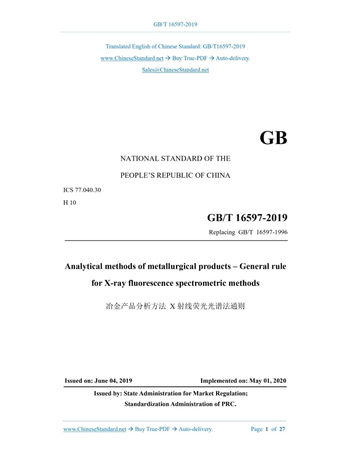 GB/T 16597-2019: Analytical methods of metallurgical products - General rule for X-ray fluorescence spectrometric methods Delivery: 9 seconds. True-PDF full-copy in English & invoice will be downloaded + auto-delivered via email. See step-by-step procedure Status: Valid GB/T 16597: Historical versions
