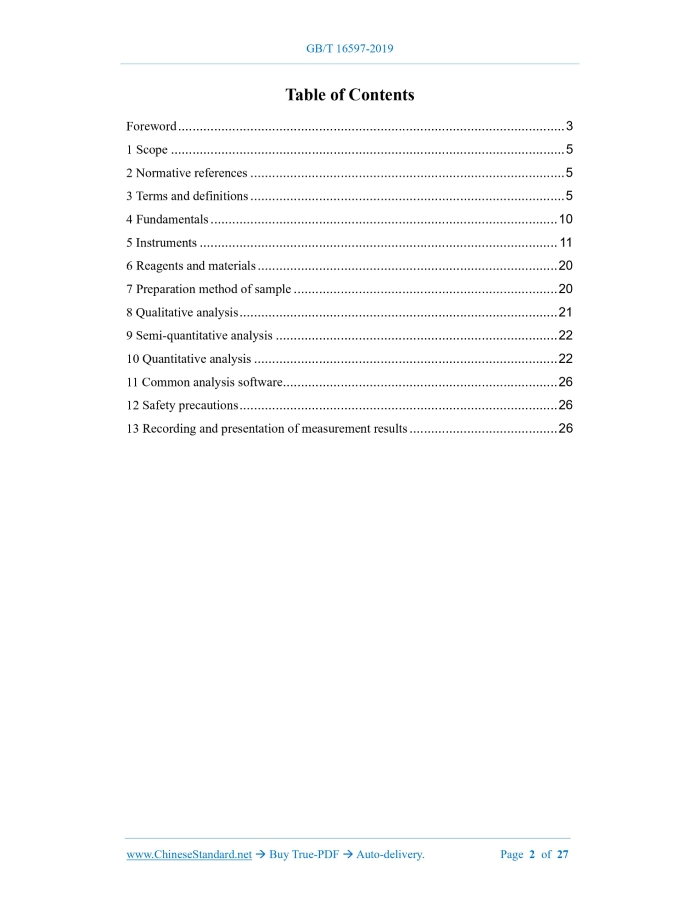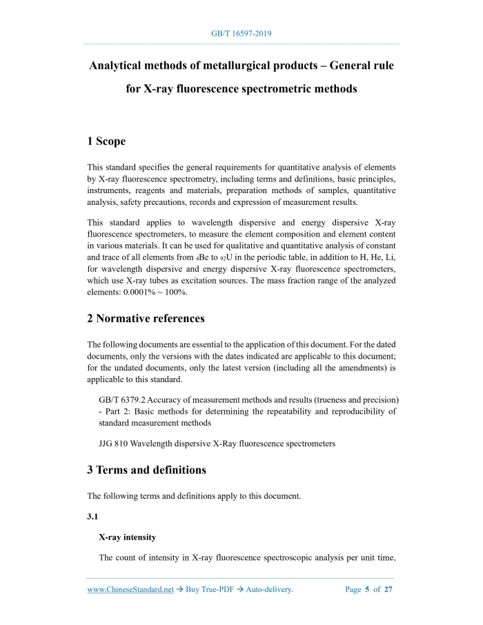 Similar standardsGB/T 16597-2019: Analytical methods of metallurgical products - General rule for X-ray fluorescence spectrometric methods---This is an excerpt. Full copy of true-PDF in English version (including equations, symbols, images, flow-chart, tables, and figures etc.), auto-downloaded/delivered in 9 seconds, can be purchased online: https://www.ChineseStandard.net/PDF.aspx/GBT16597-2019 GB NATIONAL STANDARD OF THE PEOPLE’S REPUBLIC OF CHINA ICS 77.040.30 H 10 Replacing GB/T 16597-1996 Analytical methods of metallurgical products – General rule for X-ray fluorescence spectrometric methods Issued on. JUNE 04, 2019 Implemented on. MAY 01, 2020 Issued by. State Administration for Market Regulation; Standardization Administration of PRC. Table of ContentsForeword... 3 1 Scope... 5 2 Normative references... 5 3 Terms and definitions... 5 4 Fundamentals... 10 5 Instruments... 11 6 Reagents and materials... 20 7 Preparation method of sample... 20 8 Qualitative analysis... 21 9 Semi-quantitative analysis... 22 10 Quantitative analysis... 22 11 Common analysis software... 26 12 Safety precautions... 26 13 Recording and presentation of measurement results... 261 ScopeThis standard specifies the general requirements for quantitative analysis of elements by X-ray fluorescence spectrometry, including terms and definitions, basic principles, instruments, reagents and materials, preparation methods of samples, quantitative analysis, safety precautions, records and expression of measurement results. This standard applies to wavelength dispersive and energy dispersive X-ray fluorescence spectrometers, to measure the element composition and element content in various materials. It can be used for qualitative and quantitative analysis of constant and trace of all elements from 4Be to 92U in the periodic table, in addition to H, He, Li, for wavelength dispersive and energy dispersive X-ray fluorescence spectrometers, which use X-ray tubes as excitation sources. The mass fraction range of the analyzed elements. 0.0001% ~ 100%.2 Normative referencesThe following documents are essential to the application of this document. For the dated documents, only the versions with the dates indicated are applicable to this document; for the undated documents, only the latest version (including all the amendments) is applicable to this standard. GB/T 6379.2 Accuracy of measurement methods and results (trueness and precision) - Part 2.Basic methods for determining the repeatability and reproducibility of standard measurement methods JJG 810 Wavelength dispersive X-Ray fluorescence spectrometers3 Terms and definitionsThe following terms and definitions apply to this document. 3.1 X-ray intensity The count of intensity in X-ray fluorescence spectroscopic analysis per unit time, usually represented by I. 3.2 Energy resolution The ratio -- of the half height width of the pulse height distribution TO the average pulse height, expressed as a percentage. 3.3 Background The continuum superimposed on the analytical line, which is mainly due to the scattering of incident radiation by the sample. 3.4 Analytical line The characteristic spectral line, whose intensity needs to be measured to determine the content of the analyzed element accordingly. Note. In X-ray fluorescence spectroscopic analysis, the characteristic spectral lines with high intensity, less interference, low background are generally selected as the analytical lines. 3.5 Interference line Spectral line, that overlaps or partially overlaps with the analytical line, thereby affecting the accurate measurement of the analytical line intensity.4 Fundamentals4.1 Basic principles of wavelength dispersive X-ray fluorescence spectroscopy The atoms of elements are excited by high-energy radiation, to cause the transition of electrons in the inner shell, at the same time emit X-rays with a certain characteristic wavelength. 4.2 Basic principles of energy dispersive X-ray fluorescence spectroscopy The analysis sample is excited by the excitation source, to emit characteristic X-rays. An X-ray detector, which has a certain energy resolution, is used to detect various energy characteristic X-rays, which are emitted by the sample.5 Instruments5.1 Composition of instrument 5.1.1 Wavelength dispersive X-ray fluorescence spectrometer The schematic diagram of the wavelength dispersive X-ray fluorescence spectrometer is as shown in Figure 2. 5.1.2 Energy dispersive X-ray fluorescence spectrometer 5.1.2.1 Instrument composition. The composition of the energy dispersive X-ray fluorescence spectrometer is as shown in Figure 3; the whole set consists of four parts. Gas replacement device Cooling device High voltage power supply 5.1.3 X-ray generator The X-ray generator is composed of X-ray tube, high-voltage power supply, and controller. 5.1.5 X-ray analysis target 5.1.5.1 Commonly used targets for wavelength dispersive X-ray fluorescence analyzers 5.1.7 Counting-recording systems Select the desired pulses from the output pulses of the detector to count; display and record it. It is composed of a pre-positioned amplifier, a single-channel wave height analyzer, a scaler, a timer, and a counting rate meter. The functions of each part are as follows. 5.1.8 Data processing system The computer and its software are used to correct the X-ray intensity AND convert it into the content of the analyzed elements. 5.1.9 Ventilation mechanism In order to reduce the absorption of long-wave X-rays by the atmosphere, there shall be a vacuum system or a helium replacement system, as well as a device to maintain its pressure stably. 5.2 Selection of instrument parameters 5.2.1 Optical path medium It is divided into three different optical path media. air, vacuum, helium. Light elements shall be measured in vacuum media. Liquid and wet powder samples shall be measured in a helium system, because of the evaporation of water; however, only elements after fluorine can be measured. 5.2.3 Commonly used a