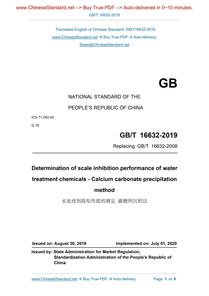 GB/T 16632-2019: Determination of scale inhibition performance of water treatment chemicals - Calcium carbonate precipitation method Delivery: 9 seconds. True-PDF full-copy in English & invoice will be downloaded + auto-delivered via email. See step-by-step procedure Status: Valid GB/T 16632: Historical versions