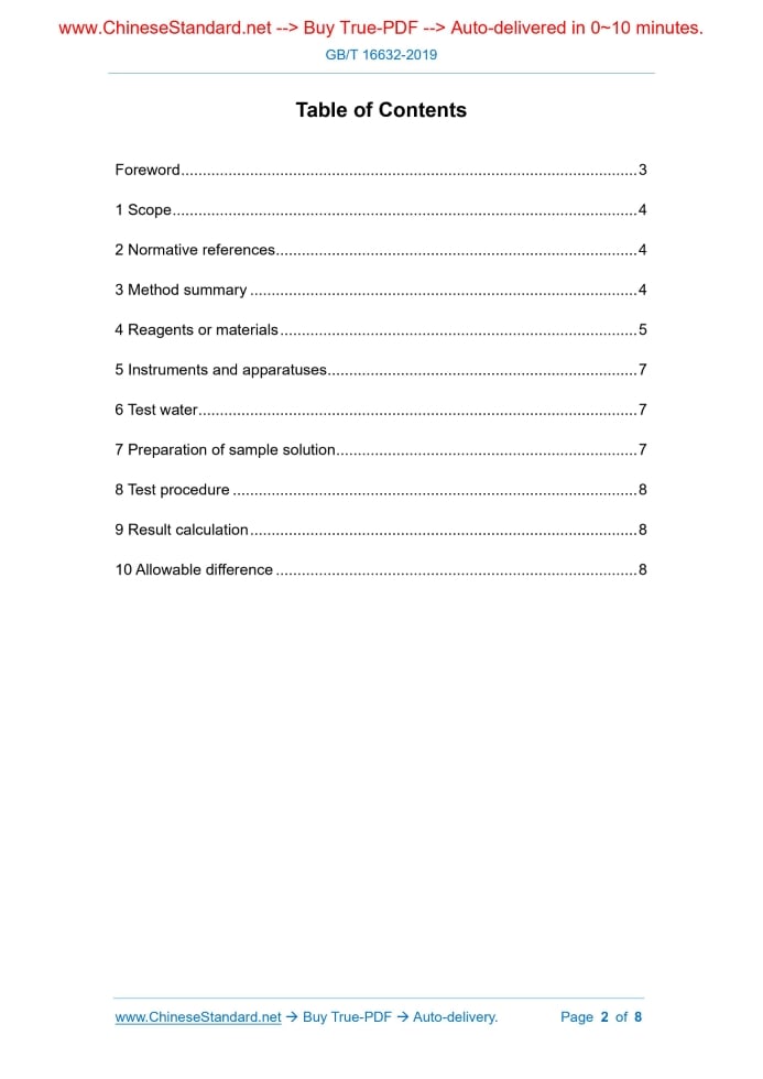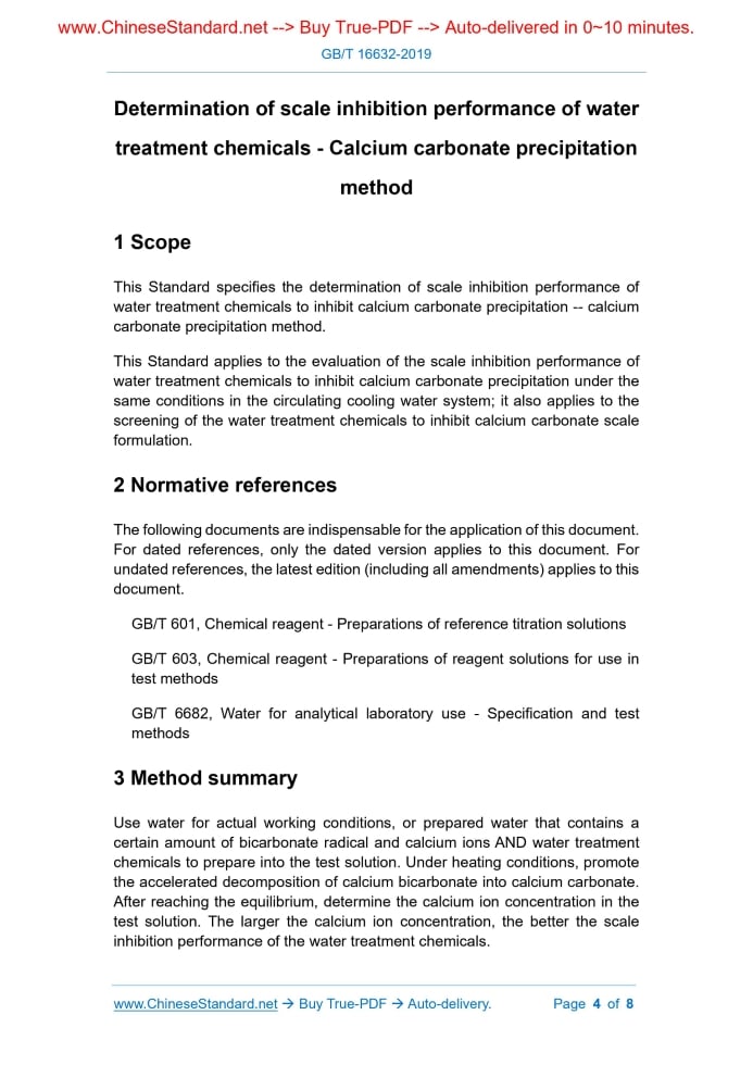 Similar standardsGB/T 16632-2019: Determination of scale inhibition performance of water treatment chemicals - Calcium carbonate precipitation method---This is an excerpt. Full copy of true-PDF in English version (including equations, symbols, images, flow-chart, tables, and figures etc.), auto-downloaded/delivered in 9 seconds, can be purchased online: https://www.ChineseStandard.net/PDF.aspx/GBT16632-2019 GB NATIONAL STANDARD OF THE PEOPLE’S REPUBLIC OF CHINA ICS 71.040.40 G 76 Replacing GB/T 16632-2008 Determination of scale inhibition performance of water treatment chemicals - Calcium carbonate precipitation method Issued on. AUGUST 30, 2019 Implemented on. JULY 01, 2020 Issued by. State Administration for Market Regulation; Standardization Administration of the People’s Republic of China. Table of ContentsForeword... 3 1 Scope... 4 2 Normative references... 4 3 Method summary... 4 4 Reagents or materials... 5 5 Instruments and apparatuses... 7 6 Test water... 7 7 Preparation of sample solution... 7 8 Test procedure... 8 9 Result calculation... 8 10 Allowable difference... 8ForewordThis Standard was drafted in accordance with the rules given in GB/T 1.1-2009. This Standard replaces GB/T 16632-2008, Determination of scale inhibition performance of water treatment agents - Calcium carbonate precipitation method; compared with GB/T 16632-2008, the main technical changes, except editorial changes, are as follows. -- Change the sodium bicarbonate standard solution to prepare when needed (see 4.4; 4.7 of version 2008); -- Add the requirement of using water for actual working conditions as test water (see Chapter 6); -- Change the addition of water treatment chemicals from “5.0 mL” to “a certain amount” (see 7.1.2, 7.1.3; 6.1 of version 2008); -- In the test procedure, change filter “after cooling to room temperature” to filter “while hot” (see Chapter 8; Chapter 7 of version 2008). This Standard was proposed by China Petroleum and Chemical Industry Federation. This Standard shall be under the jurisdiction of National Standardization Technical Committee of Chemical (SAC/TC 63). The drafting organizations of this Standard. Henan Qing Shui Yuan Technology Co., Ltd., Guangzhou Special Pressure Equipment Inspection and Research Institute, Hangzhou Special Equipment Testing and Research Institute, Nanjing Yushui Science & Technology Co., Ltd., Shenzhen ZhunNuo Test Technology Co., Ltd., Shandong Taihe Water Treatment Technologies Co., Ltd., Suzhou Branch of Special Equipment Safety Supervision Inspection Institute of Jiangsu Province, CenerTech Tianjin Chemical Research and Design Institute Co., Ltd., Jiashan Green Environmentally Friendly Materials Plant, Hangzhou Mingzhu Water Treatment Technology Co., Ltd., Tianjin Zhengda Science & Technology Co., Ltd. The drafters of this Standard. Jing Yuanyuan, Xie Haiyuan, Xiong Weidong, Chen Wei, Li Haitian, Wang Ningning, Yan Hao, Li Lin, Zhu Chunlian, Du Hao, Hu Sanmu, Shao Hongqian. The previous versions of the standards which are replaced by this Standard are. -- GB/T 16632-1996, GB/T 16632-2008. Determination of scale inhibition performance of water treatment chemicals - Calcium carbonate precipitation method1 ScopeThis Standard specifies the determination of scale inhibition performance of water treatment chemicals to inhibit calcium carbonate precipitation -- calcium carbonate precipitation method. This Standard applies to the evaluation of the scale inhibition performance of water treatment chemicals to inhibit calcium carbonate precipitation under the same conditions in the circulating cooling water system; it also applies to the screening of the water treatment chemicals to inhibit calcium carbonate scale formulation.2 Normative referencesThe following documents are indispensable for the application of this document. For dated references, only the dated version applies to this document. For undated references, the latest edition (including all amendments) applies to this document. GB/T 601, Chemical reagent - Preparations of reference titration solutions GB/T 603, Chemical reagent - Preparations of reagent solutions for use in test methods GB/T 6682, Water for analytical laboratory use - Specification and test methods3 Method summaryUse water for actual working conditions, or prepared water that contains a certain amount of bicarbonate radical and calcium ions AND water treatment chemicals to prepare into the test solution. Under heating conditions, promote the accelerated decomposition of calcium bicarbonate into calcium carbonate.4 Reagents or materials4.1 The reagents and water that are used in this standard, unless otherwise specified, shall be analytical reagents and grade-3 water that complies with the provisions of GB/T 6682. 4.2 Potassium hydroxide solution. 200 g/L. 4.3 Borax buffer solution. pH ≈ 9; weigh 3.80 g of sodium tetraborate decahydrate (Na2B4O7·10H2O) to dissolve in water; dilute to 1 L. 4.4 Sodium bicarbonate standard solution. 1 mL contains about 18.3 mg of HCO3-; prepare and calibrate according to the following steps. 4.5 Calcium chloride standard solution. 1 mL contains about 6.0 mg of Ca2+; prepare and calibrate according to the following steps. 4.6 Hydrochloric acid standard titration solution. c(HCl) is about 0.1 mol/L. 4.7 Ethylene Diamine Tetraacetic Acid standard titration solution. c (EDTA) is about 0.01 mol/L. 4.8 Bromocresol green-methyl red indicator solution5 Instruments and apparatuses5.1 Constant-temperature water bath. with stirring device; the temperature can be controlled at (80 ± 1) °C. 5.2 Conical flask. 500 mL; equipped with a rubber stopper for installing a glass tube whose diameter is 5 mm ~ 10 mm and length is about 300 mm.6 Test waterTest water sample. prepared water or water for actual working conditions.7 Preparation of sample solution7.1 Preparation of test solution 7.1.1 Water treatment chemical sample solution. 1.00 mL contains 0.500 mg of water treatment chemicals (o