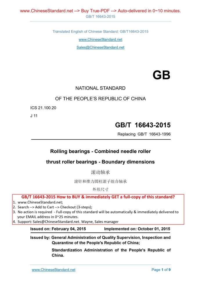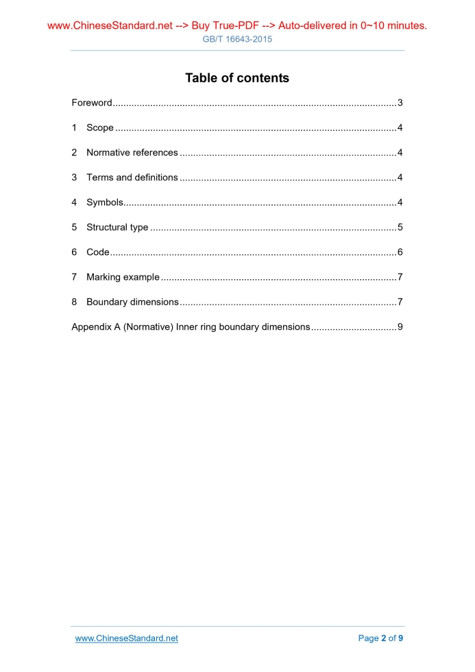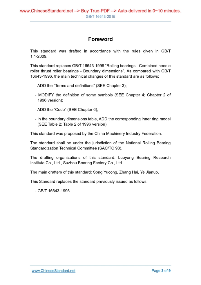 Similar standardsGB/T 16643-2015: Rolling bearings -- Combined needle roller thrust roller bearings -- Boundary dimensions---This is an excerpt. Full copy of true-PDF in English version (including equations, symbols, images, flow-chart, tables, and figures etc.), auto-downloaded/delivered in 9 seconds, can be purchased online: https://www.ChineseStandard.net/PDF.aspx/GBT16643-2015 GB NATIONAL STANDARD OF THE PEOPLE’S REPUBLIC OF CHINA ICS 21.100.20 J 11 Replacing GB/T 16643-1996 Rolling bearings - Combined needle roller thrust roller bearings - Boundary dimensions 滚动轴承 外形尺寸 Issued on: FEBRUARY 04, 2015 Implemented on: OCTOBER 01, 2015 Issued by. General Administration of Quality Supervision, Inspection and Quarantine of the People's Republic of China; Standardization Administration of the People's Republic of China. Table of ContentsForeword ... 3 1 Scope ... 4 2 Normative references ... 4 3 Terms and definitions ... 4 4 Symbols... 4 5 Structural type ... 5 6 Code ... 6 7 Marking example ... 7 8 Boundary dimensions ... 7 Appendix A (Normative) Inner ring boundary dimensions ... 9ForewordThis standard was drafted in accordance with the rules given in GB/T 1.1-2009. This standard replaces GB/T 16643-1996 “Rolling bearings - Combined needle roller thrust roller bearings - Boundary dimensions”. As compared with GB/T 16643-1996, the main technical changes of this standard are as follows. - ADD the “Terms and definitions” (SEE Chapter 3); - MODIFY the definition of some symbols (SEE Chapter 4; Chapter 2 of 1996 version); - ADD the “Code” (SEE Chapter 6); - In the boundary dimensions table, ADD the corresponding inner ring model (SEE Table 2; Table 2 of 1996 version). This standard was proposed by the China Machinery Industry Federation. The standard shall be under the jurisdiction of the National Rolling Bearing Standardization Technical Committee (SAC/TC 98). The drafting organizations of this standard. Luoyang Bearing Research Institute Co., Ltd., Suzhou Bearing Factory Co., Ltd. The main drafters of this standard. Song Yucong, Zhang Hai, Ye Jianuo. This Standard replaces the standard previously issued as follows. - GB/T 16643-1996. Rolling bearings - Combined needle roller thrust roller bearings - Boundary dimensions1 ScopeThis standard specifies the boundary dimensions of the combined needle roller thrust roller bearings (hereinafter referred to as combined bearings). This standard applies to the design and selection of combined bearings.2 Normative referencesThe following documents are essential to the application of this document. For the dated documents, only the versions with the dates indicated are applicable to this document; for the undated documents, only the latest version (including all the amendments) are applicable to this Standard. GB/T 272-1993 Rolling bearing - Identification code GB/T 274-2000 Rolling bearing - Chamfer dimension - Maximum values GB/T 6930-2002 Rolling bearing - Vocabulary JB/T 2974-2004 Rolling bearings - Combined needle roller bearings - Specification JB/T 8877-2011 rolling bearing needle roller combination of technical conditions3 Terms and definitionsThe terms and definitions as defined in GB/T 6930-2002 apply to this document.4 SymbolsThe following symbols apply to this document. Unless otherwise stated, the symbols as shown in Figures 1 ~ 4, and A.1 AND the values as shown in Table 1, Table 2 and Table A.1 represent nominal dimensions. B. Inner ring width. C. Combined bearing width. C1. Distance between the center of the oil hole and the reference plane of the race. D. Needle roller bearing outer diameter. D1. Thrust roller bearing shaft ring outer diameter. D1smax. The maximum single outer diameter of D1. D2. Thrust roller bearing race outer diameter. D3. Thrust roller bearing enclosure outer diameter. d. Inner ring inner diameter. d1. Thrust roller bearing shaft ring inner diameter. F. Inner ring raceway diameter. Fw. Overall inner diameter of the needle roller. Fwsmin. Overall minimum single inner diameter of the needle roller. r. Inner ring chamfer size. r1. Chamfer size of thrust roller bearing shaft ring AND needle roller bearing outer ring. rsmin. Minimum single chamfer size of r. R1smin. Minimum single chamfer size or r1. T. Thrust roller bearing height.5 Structural typeThe structure of the combined bearing is as shown in Figure 1 ~ Figure 4. ......Source: Above contents are excerpted from the full-copy PDF -- translated/reviewed by: www.ChineseStandard.net / Wayne Zheng et al. Tips & Frequently Asked Questions:Question 1: How long will the true-PDF of English version of GB/T 16643-2015 be delivered?Answer: The full copy PDF of English version of GB/T 16643-2015 can be downloaded in 9 seconds, and it will also be emailed to you in 9 seconds (double mechanisms to ensure the delivery reliably), with PDF-invoice.Question 2: Can I share the purchased PDF of GB/T 16643-2015_English with my colleagues?Answer: Yes. The purchased PDF of GB/T 16643-2015_English will be deemed to be sold to your employer/organization who actually paid for it, including your colleagues and your employer's intranet.Question 3: Does the price include tax/VAT?Answer: Yes. Our tax invoice, downloaded/delivered in 9 seconds, includes all tax/VAT and complies with 100+ countries' tax regulations (tax exempted in 100+ countries) -- See Avoidance of Double Taxation Agreements (DTAs): List of DTAs signed between Singapore and 100+ countriesQuestion 4: Do you accept my currency other than USD?Answer: Yes. www.ChineseStandard.us -- GB/T 16643-2015 -- Click this link and select your country/currency to pay, the exact amount in your currency will be printed on the invoice. Full PDF will also be downloaded/emailed in 9 seconds.Question 5: Should I purchase the latest version GB/T 16643-2015?Answer: Yes. Unless special scenarios such as technical constraints or academic study, you should always prioritize to purchase the latest version GB/T 16643-2015 even 