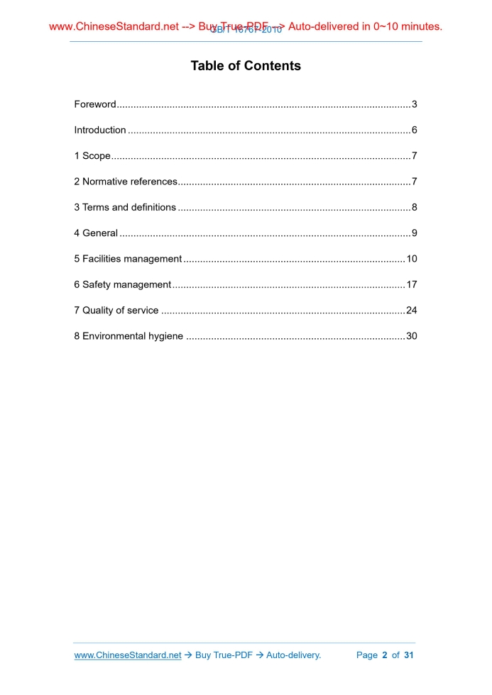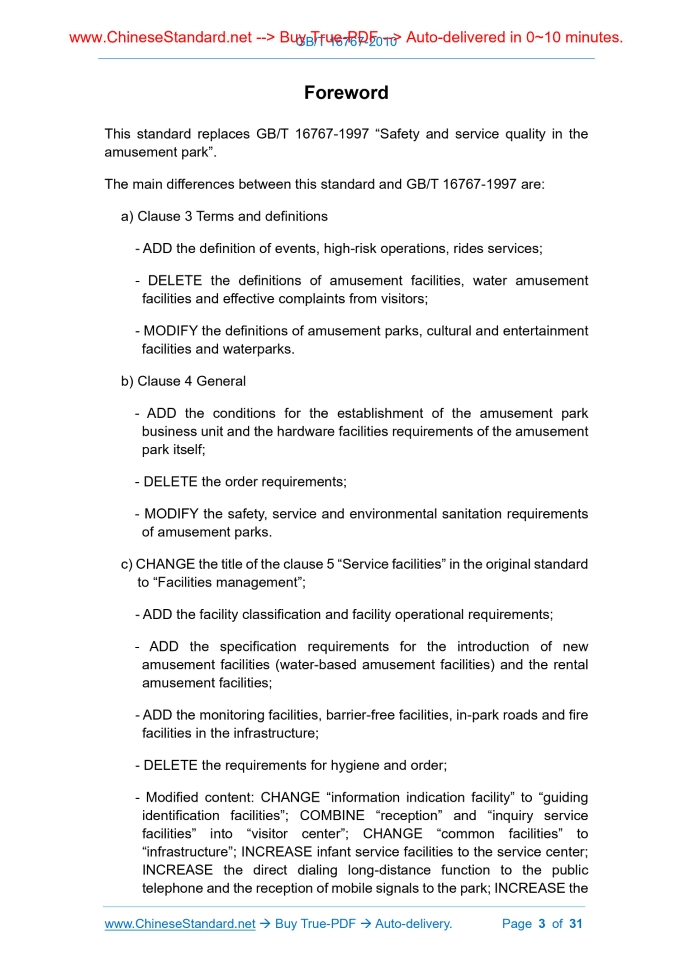 Similar standardsGB/T 16767-2010: Service quality in the amusement park---This is an excerpt. Full copy of true-PDF in English version (including equations, symbols, images, flow-chart, tables, and figures etc.), auto-downloaded/delivered in 9 seconds, can be purchased online: https://www.ChineseStandard.net/PDF.aspx/GBT16767-2010GB NATIONAL STANDARD OF THE PEOPLE’S REPUBLIC OF CHINA ICS 03.080 A 12 Replacing GB/T 16767-1997 Service quality in the amusement park Issued on: JANUARY 14, 2011 Implemented on: JUNE 01, 2011 Issued by. General Administration of Quality Supervision, Inspection and Quarantine; Standardization Administration of PRC. Table of ContentsForeword ... 3 Introduction ... 6 1 Scope ... 7 2 Normative references ... 7 3 Terms and definitions ... 8 4 General ... 9 5 Facilities management ... 10 6 Safety management ... 17 7 Quality of service ... 24 8 Environmental hygiene ... 30ForewordThis standard replaces GB/T 16767-1997 “Safety and service quality in the amusement park”. The main differences between this standard and GB/T 16767-1997 are. a) Clause 3 Terms and definitions - ADD the definition of events, high-risk operations, rides services; - DELETE the definitions of amusement facilities, water amusement facilities and effective complaints from visitors; - MODIFY the definitions of amusement parks, cultural and entertainment facilities and waterparks. b) Clause 4 General - ADD the conditions for the establishment of the amusement park business unit and the hardware facilities requirements of the amusement park itself; - DELETE the order requirements; - MODIFY the safety, service and environmental sanitation requirements of amusement parks. c) CHANGE the title of the clause 5 “Service facilities” in the original standard to “Facilities management”; - ADD the facility classification and facility operational requirements; - ADD the specification requirements for the introduction of new amusement facilities (water-based amusement facilities) and the rental amusement facilities; - ADD the monitoring facilities, barrier-free facilities, in-park roads and fire facilities in the infrastructure; - DELETE the requirements for hygiene and order; - Modified content. CHANGE “information indication facility” to “guiding identification facilities”; COMBINE “reception” and “inquiry service facilities” into “visitor center”; CHANGE “common facilities” to “infrastructure”; INCREASE infant service facilities to the service center; INCREASE the direct dialing long-distance function to the public telephone and the reception of mobile signals to the park; INCREASE the Service quality in the amusement park1 ScopeThis standard defines the terms and definitions of amusement parks, and specifies the requirements for facility management, safety management, service quality and environmental hygiene of amusement parks. This standard applies to theme parks with rides and various amusement parks with amusement facilities.2 Normative referencesThe provisions in following documents become the provisions of this standard through reference in this standard. For the dated references, the subsequent amendments (excluding corrections) or revisions do not apply to this standard; however, parties who reach an agreement based on this standard are encouraged to study if the latest versions of these documents are applicable. For undated references, the latest edition of the referenced document applies. GB 2893 Safety color GB 2894 Safety sign GB 3096 Environmental quality standard for noise GB 5749 Standards for drinking water quality GB 8408 Amusement device safety code GB 9664 Hygienic standard for public place of entertainment GB 9665 Hygienic standard for public bathroom GB 9667 Hygienic standard for swimming place GB 9670 Hygienic standard for shopping center and book store GB/T 10001.1 Public information graphical symbols for use on sign - Part 1. Common symbols GB/T 10001.2 Public information graphical symbols for use on sign - Part 2. Symbols for touring facilities and services5 Facilities management5.1 Configuration requirements for facility 5.1.1 Basic requirements 5.1.1.1 Amusement parks shall scientifically plan and design, rationally allocate amusement facilities, reception facilities, guiding signage facilities and infrastructure in accordance with the theme characteristics of the park, taking into account the current situation of the terrain, land coverage, investment scale, construction stage, content layout and other factors. If possible, it can increase cultural and entertainment facilities and water amusement facilities. 5.1.1.2 Special equipment in amusement parks shall comply with relevant national regulations. 5.1.2 Amusement facilities (including water amusement facilities) 5.1.2.1 The purchase, installation, operation, modification, maintenance, use management, supervision management of amusement facilities (including water amusement facilities) shall be in accordance with the provisions of GB 8408 and the safety supervision and management measures for amusement facilities (including water amusement facilities) formulated by relevant state departments. To use these facilities, it shall obtain a certificate of conformity issued by the statutory technical inspection department. 5.1.2.2 For the introduction of new amusement facilities (including water amusement facilities), if there is no corresponding national or industry standard, it shall use the standards of the equipment introduction country or region on this equipment for management, establish the corresponding enterprise standards and operational procedures, report to the relevant authorities for standard registration. 5.1.3 Cultural and entertainment facilities and cultural themes 5.1.3.1 The construction and installation of various cultural and entertainment facilities and their supporting devices shall comply with the relevant national laws and regulations, to ensure good performance, safe 