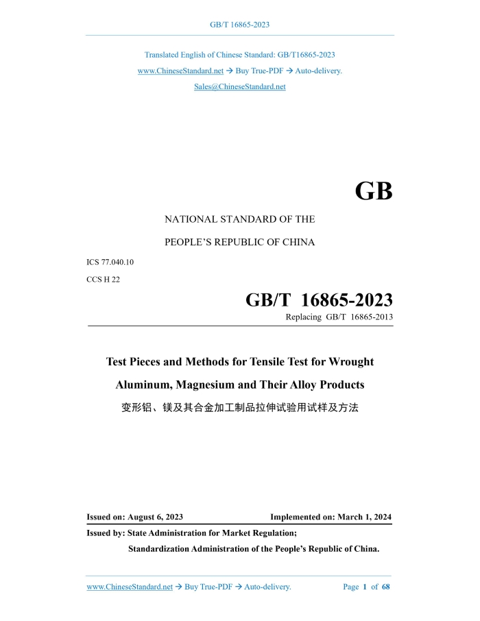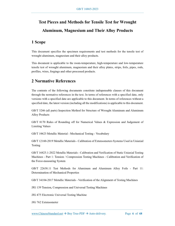 Similar standardsGB/T 16865-2023: Test pieces and methods for tensile test for wrought aluminium, magnesium and their alloy products---This is an excerpt. Full copy of true-PDF in English version (including equations, symbols, images, flow-chart, tables, and figures etc.), auto-downloaded/delivered in 9 seconds, can be purchased online: https://www.ChineseStandard.net/PDF.aspx/GBT16865-2023 GB NATIONAL STANDARD OF THE PEOPLE’S REPUBLIC OF CHINA ICS 77.040.10 CCS H 22 Replacing GB/T 16865-2013 Test Pieces and Methods for Tensile Test for Wrought Aluminum, Magnesium and Their Alloy Products Issued on. AUGUST 6, 2023 Implemented on. MARCH 1, 2024 Issued by. State Administration for Market Regulation; Standardization Administration of the People’s Republic of China. Table of ContentsForeword... 3 1 Scope... 6 2 Normative References... 6 3 Terms and Definitions... 7 4 Method Overview... 7 5 Instruments and Equipment... 8 6 Specimens... 13 7 Test Procedures... 42 8 Result Determination... 64 9 Test Report... 65 Appendix A (informative) Estimation Method for Beam Displacement Rate... 671 ScopeThis document specifies the specimen requirements and test methods for the tensile test of wrought aluminum, magnesium and their alloy products. This document is applicable to the room-temperature, high-temperature and low-temperature tensile test of wrought aluminum, magnesium and their alloy plates, strips, foils, pipes, rods, profiles, wires, forgings and other processed products.2 Normative ReferencesThe contents of the following documents constitute indispensable clauses of this document through the normative references in the text. In terms of references with a specified date, only versions with a specified date are applicable to this document. In terms of references without a specified date, the latest version (including all the modifications) is applicable to this document. GB/T 3246 (all parts) Inspection Method for Structure of Wrought Aluminum and Aluminum Alloy Products GB/T 8170 Rules of Rounding off for Numerical Values & Expression and Judgement of Limiting Values GB/T 10623 Metallic Material - Mechanical Testing - Vocabulary GB/T 12160-2019 Metallic Materials - Calibration of Extensometers Systems Used in Uniaxial Testing GB/T 16825.1-2022 Metallic Materials - Calibration and Verification of Static Uniaxial Testing Machines - Part 1.Tension / Compression Testing Machines - Calibration and Verification of the Force-measuring System GB/T 22638.11 Test Methods for Aluminum and Aluminum Alloy Foils - Part 11. Determination of Mechanical Properties GB/T 34104-2017 Metallic Materials - Verification of the Alignment of Testing Machines JJG 139 Tension, Compression and Universal Testing Machines JJG 475 Electronic Universal Testing Machine JJG 762 Extensometer JJG 1063 Electro-hydraulic Servo Universal Testing Machines3 Terms and DefinitionsThe terms and definitions defined in GB/T 10623 are applicable to this document.4 Method OverviewApply axial tension to the specimen (see Figure 1) and determine the mechanical properties of the specimen. In accordance with test temperature, tensile test is divided into three categories.5 Instruments and Equipment5.1 Testing Machine 5.1.1 The testing machine force measuring system shall be calibrated in accordance with JJG 139, JJG 475 or JJG 1063.The accuracy of the testing machine force measuring system used for the determination of room-temperature tensile mechanical properties of aluminum foil products shall reach or be superior to Level 0.5 specified in GB/T 16825.1-2022.The accuracy of the testing machine force measuring system used for the determination of mechanical properties of other products shall reach or be superior to Level 1. 5.1.2 The maximum load required for the test should be within the range of 10% ~ 90% of the maximum load of the testing machine. 5.1.3 Testing machines used for the determination of elastic modulus or mechanical properties of aviation and aerospace materials shall be inspected for coaxiality in accordance with GB/T 34104-2017. 5.2 Extensometer 5.2.1 The extensometer system shall be calibrated in accordance with JJG 762.When determining the elastic modulus, the accuracy of the extensometer shall reach or be superior to Level 0.5 specified in GB/T 12160-2019; when determining other mechanical properties, the accuracy of the extensometer shall reach or be superior to Level 1. 5.2.2 When determining the elastic modulus, the extensometer system shall be able to measure the average deformation on at least two opposite sides of the specimen. When adopting the automatic method to determine the plastic strain ratio, the extensometer system shall be able to measure the deformation in the length direction and the width direction of the rectangular specimen. 5.2.3 The gauge length of the extensometer (Le) should be greater than half of the original gauge length (L0) and not greater than the original gauge length (L0); when using an extensometer to determine the elongation after break, the gauge length of the extensometer (Le) shall be equal to the original gauge length (L0). 5.2.4 The part of the extensometer used for high-temperature tensile test or low-temperature tensile test that extends outside the heating device or cooling device shall be able to prevent interference from air flow. 5.2.5 Non-contact extensometer should be used for the determination of room-temperature tensile mechanical properties of aluminum foil. 5.3 Fixture The test fixtures can be wedge-shaped fixture (see Figure 2), flat-pushing fixture (see Figure 3), shoulder fixture (see Figure 4), collar fixture (see Figure 5), threaded fixture (see Figure 6) and pin fixture (see Figure 7), etc. The clamping surfaces of wedge-shaped fixture and flat-pushing fixture can be serrated surfaces and smooth rubber surfaces, etc. 5.4 Data Collection System When determining the elastic modulus, data shall be collected through a computer. The minimum data collection frequency (f