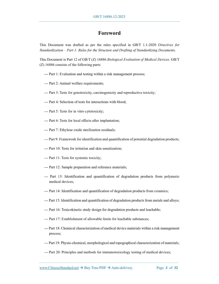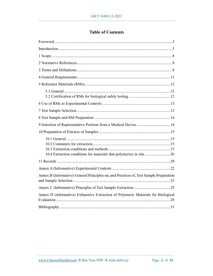 Similar standardsGB/T 16886.12-2023: Biological evaluation of medical devices - Part 12: Sample preparation and reference materials---This is an excerpt. Full copy of true-PDF in English version (including equations, symbols, images, flow-chart, tables, and figures etc.), auto-downloaded/delivered in 9 seconds, can be purchased online: https://www.ChineseStandard.net/PDF.aspx/GBT16886.12-2023 GB NATIONAL STANDARD OF THE PEOPLE’S REPUBLIC OF CHINA ICS 11.100.20 CCS C 30 GB/T 16886.12-2023 / ISO 10993-12.2021 Replacing GB/T 16886.12-2017 Biological Evaluation of Medical Devices – Part 12.Sample Preparation and Reference Materials (ISO 10993-12.2021, IDT) Issued on. NOVEMBER 27, 2023 Implemented on. DECEMBER 1, 2024 Issued by. State Administration for Market Regulation; Standardization Administration of the People’s Republic of China. Table of ContentsForeword... 3 Introduction... 5 1 Scope... 8 2 Normative References... 8 3 Terms and Definitions... 8 4 General Requirements... 11 5 Reference Materials (RMs)... 12 5.1 General... 12 5.2 Certification of RMs for biological safety testing... 12 6 Use of RMs as Experimental Controls... 13 7 Test Sample Selection... 13 8 Test Sample and RM Preparation... 14 9 Selection of Representative Portions from a Medical Device... 14 10 Preparation of Extracts of Samples... 15 10.1 General... 15 10.2 Containers for extraction... 15 10.3 Extraction conditions and methods... 15 10.4 Extraction conditions for materials that polymerize in situ... 20 11 Records... 20 Annex A (Informative) Experimental Controls... 22 Annex B (Informative) General Principles on, and Practices of, Test Sample Preparation and Sample Selection... 23 Annex C (Informative) Principles of Test Sample Extraction... 25 Annex D (informative) Exhaustive Extraction of Polymeric Materials for Biological Evaluation... 28 Bibliography... 31ForewordThis Document was drafted as per the rules specified in GB/T 1.1-2020 Directives for Standardization – Part 1.Rules for the Structure and Drafting of Standardizing Documents. This Document is Part 12 of GB/T (Z) 16886 Biological Evaluation of Medical Devices. GB/T (Z) 16886 consists of the following parts. --- Part 1.Evaluation and testing within a risk management process; --- Part 2.Animal welfare requirements; --- Part 3.Tests for genotoxicity, carcinogenicity and reproductive toxicity; --- Part 4.Selection of tests for interactions with blood; --- Part 5.Tests for in vitro cytotoxicity; --- Part 6.Tests for local effects after implantation; --- Part 7.Ethylene oxide sterilization residuals; --- Part 9.Framework for identification and quantification of potential degradation products; --- Part 10.Tests for irritation and skin sensitization; --- Part 11.Tests for systemic toxicity; --- Part 12.Sample preparation and reference materials; --- Part 13.Identification and quantification of degradation products from polymeric medical devices; --- Part 14.Identification and quantification of degradation products from ceramics; --- Part 15.Identification and quantification of degradation products from metals and alloys; --- Part 16.Toxicokinetic study design for degradation products and leachable; --- Part 17.Establishment of allowable limits for leachable substances; --- Part 18.Chemical characterization of medical device materials within a risk management process; --- Part 19.Physio-chemical, morphological and topographical characterization of materials; --- Part 20.Principles and methods for immunotoxicology testing of medical devices; --- Part 22.Nanomaterials guide; --- Part 23.Tests for irritation. This Document replaced GB/T 16886.12-2017 Biological Evaluation of Medical Devices - Part 12.Sample Preparation and Reference Materials. Compared with GB/T 16886.12-2017, the major technical changes of this Documents are as follows besides the structural adjustments and editorial modifications. a) Change the "Scope" to cover only the extraction of biological evaluation tests (see Clause 1 of this Edition; Clause 1 of the 2017 Edition); b) Delete the terms and definitions of "accelerated extraction" and "simulated use extraction" (see 3.1 and 3.14 of the 2017 Edition); and change the definitions of "strict extraction", "extreme extraction", "extractables" and "leachable" (see 3.3, 3.4, 3.7 and 3.9 of this Edition; 3.4, 3.5, 3.8 and 3.10 of the 2017 Edition); c) Change the list items of extraction conditions (see 10.3.1 of this Edition; 10.3.1 of the 2017 Edition). This Document equivalently adopts ISO 10993-12.2021 Biological Evaluation of Medical Devices – Part 12.Sample Preparation and Reference Materials. Please note some contents of this Document may involve patents. The issuing agency of this Document shall not assume the responsibility to identify these patents. This Document was proposed by National Medical Products Administration. This Document shall be under the jurisdiction of National Technical Committee on Biological Evaluation on Medical Device of Standardization Administration of China (SAC/TC 248). Drafting organizations of this Document. Shandong Medical Device and Drug Packaging Inspection Institute; and Sichuan University. Chief drafting staffs of this Document. Liang Jie, Sun Xiaoxia, Sun Lingxiao, Yuan Tun, and Qu Qiujin. The historical editions replaced by this Standard are as follows. --- GB/T 16886.12-2000 was first-time published in 2000; first-time revised in 2005; and second-time revised in 2017. --- It is third-time revised hereby.1 ScopeThis Document specifies requirements and gives guidance on the procedures in the preparation of samples and the selection of reference materials for medical device testing primarily in biological test systems primarily in accordance with one or more parts of the ISO 10993 series. Specifically, this document addresses the following.2 Normative ReferencesThere are no normative references in this Document.3 Terms and DefinitionsFor the purposes of this Document, the following terms and definiti