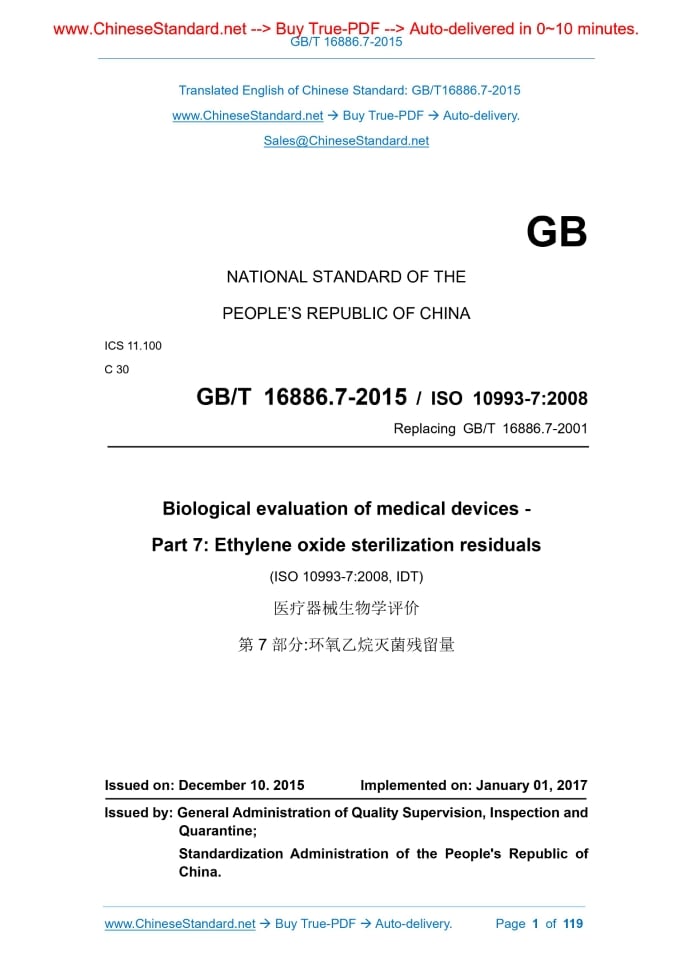 GB/T 16886.7-2015: Biological evaluation of medical devices -- Part 7: Ethylene oxide sterilization residuals Delivery: 9 seconds. True-PDF full-copy in English & invoice will be downloaded + auto-delivered via email. See step-by-step procedure Status: Valid GB/T 16886.7: Historical versions