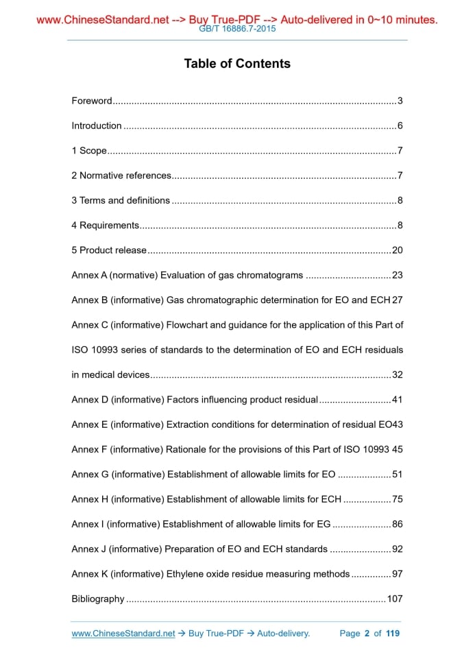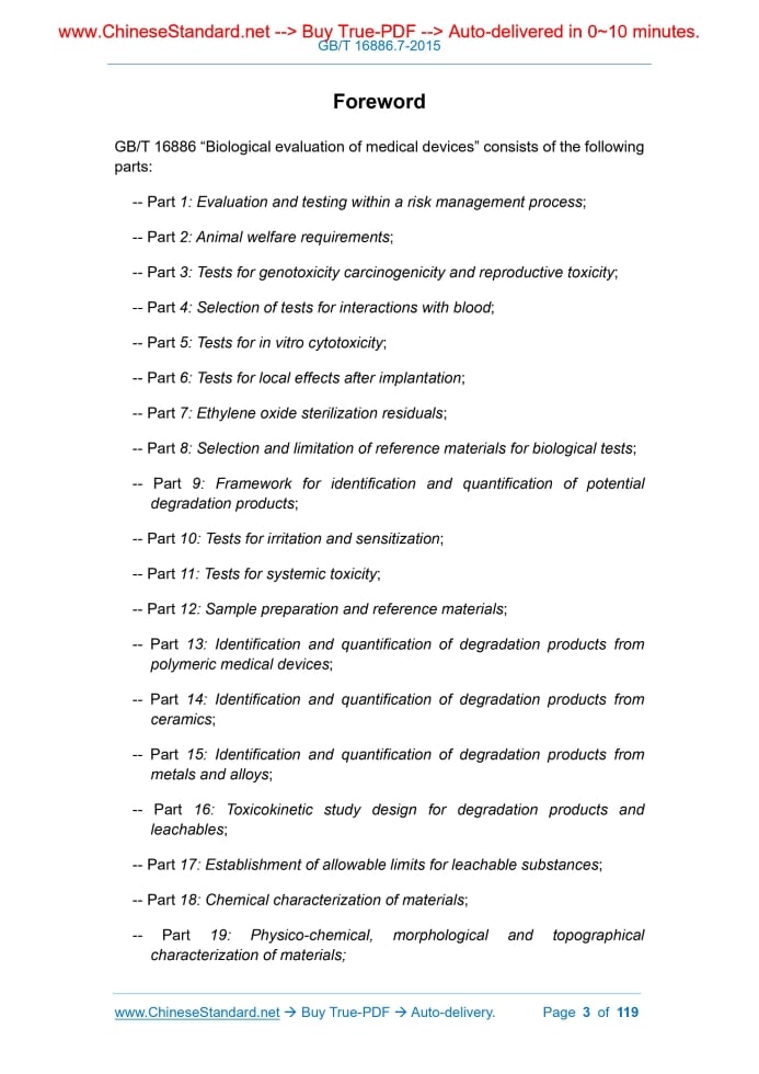 Similar standardsGB/T 16886.7-2015: Biological evaluation of medical devices -- Part 7: Ethylene oxide sterilization residuals---This is an excerpt. Full copy of true-PDF in English version (including equations, symbols, images, flow-chart, tables, and figures etc.), auto-downloaded/delivered in 9 seconds, can be purchased online: https://www.ChineseStandard.net/PDF.aspx/GBT16886.7-2015 GB NATIONAL STANDARD OF THE PEOPLE’S REPUBLIC OF CHINA ICS 11.100 C 30 GB/T 16886.7-2015 / ISO 10993-7.2008 Replacing GB/T 16886.7-2001 Biological evaluation of medical devices - Part 7.Ethylene oxide sterilization residuals (ISO 10993-7.2008, IDT) Issued on. DECEMBER 10.2015 Implemented on. JANUARY 01, 2017 Issued by. General Administration of Quality Supervision, Inspection and Quarantine; Standardization Administration of the People's Republic of China. Table of ContentsForeword... 3 Introduction... 6 1 Scope... 7 2 Normative references... 7 3 Terms and definitions... 8 4 Requirements... 8 5 Product release... 20 Annex A (normative) Evaluation of gas chromatograms... 23 Annex B (informative) Gas chromatographic determination for EO and ECH 27 Annex C (informative) Flowchart and guidance for the application of this Part of ISO 10993 series of standards to the determination of EO and ECH residuals in medical devices... 32 Annex D (informative) Factors influencing product residual... 41 Annex E (informative) Extraction conditions for determination of residual EO43 Annex F (informative) Rationale for the provisions of this Part of ISO 10993 45 Annex G (informative) Establishment of allowable limits for EO... 51 Annex H (informative) Establishment of allowable limits for ECH... 75 Annex I (informative) Establishment of allowable limits for EG... 86 Annex J (informative) Preparation of EO and ECH standards... 92 Annex K (informative) Ethylene oxide residue measuring methods... 97 Bibliography... 107ForewordGB/T 16886 “Biological evaluation of medical devices” consists of the following parts. -- Part 1.Evaluation and testing within a risk management process; -- Part 2.Animal welfare requirements; -- Part 3.Tests for genotoxicity carcinogenicity and reproductive toxicity; -- Part 4.Selection of tests for interactions with blood; -- Part 5.Tests for in vitro cytotoxicity; -- Part 6.Tests for local effects after implantation; -- Part 7.Ethylene oxide sterilization residuals; -- Part 8.Selection and limitation of reference materials for biological tests; -- Part 9.Framework for identification and quantification of potential degradation products; -- Part 10.Tests for irritation and sensitization; -- Part 11.Tests for systemic toxicity; -- Part 12.Sample preparation and reference materials; -- Part 13.Identification and quantification of degradation products from polymeric medical devices; -- Part 14.Identification and quantification of degradation products from ceramics; -- Part 15.Identification and quantification of degradation products from metals and alloys; -- Part 16.Toxicokinetic study design for degradation products and leachables; -- Part 17.Establishment of allowable limits for leachable substances; -- Part 18.Chemical characterization of materials; -- Part 19.Physico-chemical, morphological and topographical characterization of materials; -- Part 20.Principles and methods for immunotoxicology testing of medical devices. This Part is Part 7 of GB/T 16886. This Part was drafted in accordance with the rules given in GB/T 1.1-2009. This Part replaces GB/T 16886.7-2001 “Biological evaluation of medical devices - Part 7.Ethylene oxide sterilization residuals”. Compared with GB/T 16886.7-2001, the main changes are as follows. -- modified the introduction; -- modified 4.1 General; -- modified 4.3 Allowable limits. adding the overview; modifying the amounts of allowable limit for ethylene oxide (EO) and 2-chloroethanol (ECH); adding the tolerable contact limits for surface contact devices and implants; modifying the average daily exposure dose for special devices EO and ECH; -- modified 4.4.3 Product sampling; -- modified 4.4.6 Product extraction; -- modified Annex A Evaluation of gas chromatograms; -- modified Annex B Gas chromatographic determination for EO and ECH. integrating EO and ECH standard preparation, instrumentation, reagents and product leaching into Annex J and Annex K; adding the determination of precision, linearity, method detection limit and limit of quantitation; deleting Gas chromatographic conditions recommended by Table B.2; -- added Flowchart and guidance for the application of this Part of GB/T 16886 series of standards to the determination of EO and ECH residuals in medical devices; -- modified previous Annex A (present Annex E) Extraction conditions for determination of residual EO; -- modified description of previous Annex E (present Annex F). modifying the name as “Rationale for the provisions of this Part of GB/T 16886”; integrating the determination of EO and ECH allowable limits into Annex G and Annex H respectively; completing and improving; -- added Annex G Establishment of allowable limits for EO; -- added Annex H Establishment of allowable limits for ECH; -- added Annex I Establishment of allowable limits for EG; -- added Annex J Preparation of EO and ECH standards; -- added Annex K Ethylene oxide residue measuring methods. This Part uses translation method to identically adopt ISO 10993-7.2008 “Biological evaluation of medical devices - Part 7.Ethylene oxide sterilization residuals”. The Chinese documents which have consistency with the international normative references in this Part are as follows. GB/T 16886.1-2001, Biological evaluation of medical devices - Part 1. Evaluation and testing (ISO 10993-1.1997, IDT) GB/T 16886.3-2008, Biological evaluation of medical devices - Part 3.Tests for genotoxicity carcinogenicity and reproductive toxicity (ISO 10993- 3.2003, IDT) GB/T 16886.10-2005, Biological evaluation of medical devices - Part 10. Tests for irritati