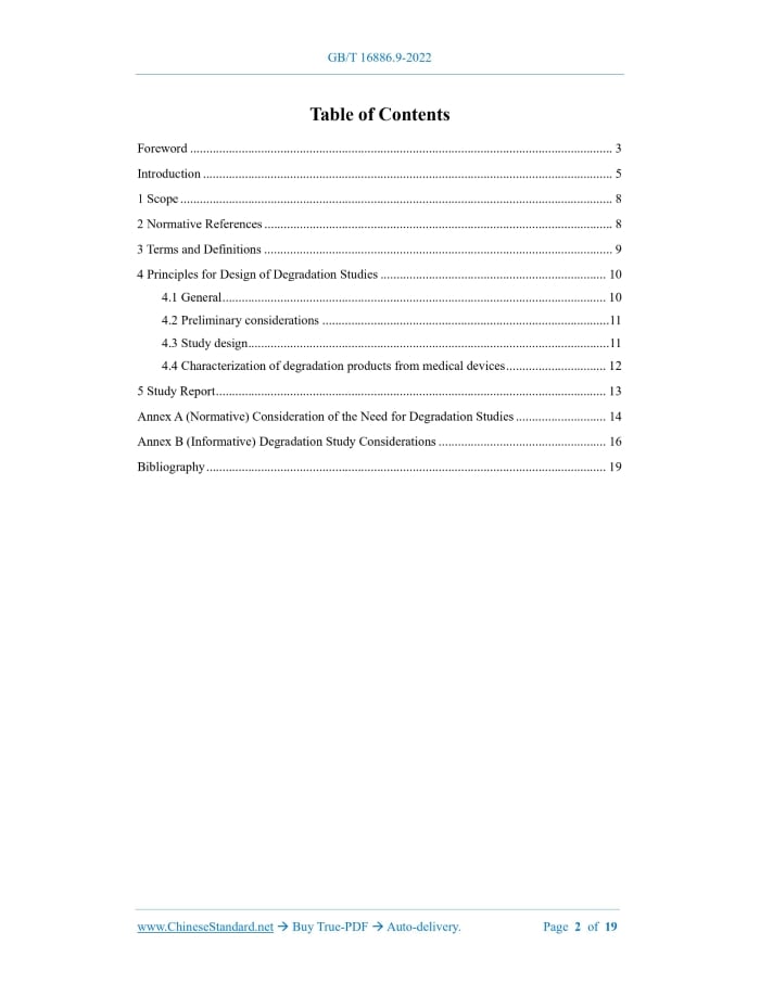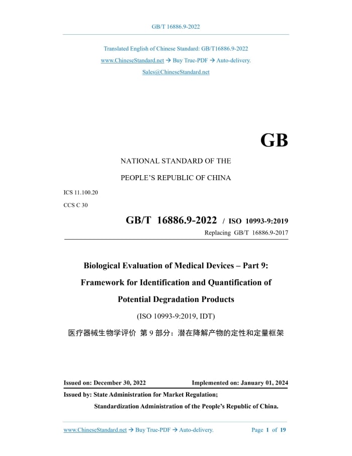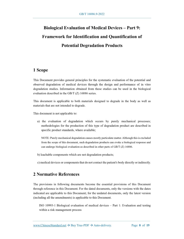 Similar standardsGB/T 16886.9-2022: Biological evaluation of medical devices - Part 9: Framework for identification and quantification of potential degradation products---This is an excerpt. Full copy of true-PDF in English version (including equations, symbols, images, flow-chart, tables, and figures etc.), auto-downloaded/delivered in 9 seconds, can be purchased online: https://www.ChineseStandard.net/PDF.aspx/GBT16886.9-2022 GB NATIONAL STANDARD OF THE PEOPLE’S REPUBLIC OF CHINA ICS 11.100.20 CCS C 30 GB/T 16886.9-2022 / ISO 10993-9.2019 Replacing GB/T 16886.9-2017 Biological Evaluation of Medical Devices – Part 9. Framework for Identification and Quantification of Potential Degradation Products (ISO 10993-9.2019, IDT) Issued on. DECEMBER 30, 2022 Implemented on. JANUARY 01, 2024 Issued by. State Administration for Market Regulation; Standardization Administration of the People’s Republic of China. Table of ContentsForeword... 3 Introduction... 5 1 Scope... 8 2 Normative References... 8 3 Terms and Definitions... 9 4 Principles for Design of Degradation Studies... 10 4.1 General... 10 4.2 Preliminary considerations... 11 4.3 Study design... 11 4.4 Characterization of degradation products from medical devices... 12 5 Study Report... 13 Annex A (Normative) Consideration of the Need for Degradation Studies... 14 Annex B (Informative) Degradation Study Considerations... 16 Bibliography... 19ForewordThis Document was drafted as per the rules specified in GB/T 1.1-2020 Directives for Standardization – Part 1.Rules for the Structure and Drafting of Standardizing Documents. This Document is Part 9 of GB/T (Z) 16886 Biological Evaluation of Medical Devices. GB/T (Z) 16886 has published the following parts. --- Part 1.Evaluation and Testing within a Risk Management Process; --- Part 2.Animal Welfare Requirements; --- Part 3.Tests for Genotoxicity, Carcinogenicity and Reproductive Toxicity; --- Part 4.Selection of Tests for Interactions with Blood; --- Part 5.Tests for in Vitro Cytotoxicity; --- Part 6.Tests for Local Effects after Implantation; --- Part 7.Ethylene Oxide Sterilization Residuals; --- Part 9.Framework for Identification and Quantification of Potential Degradation Products; --- Part 10.Tests for Irritation and Skin Sensitization; --- Part 11.Tests for Systemic Toxicity; --- Part 12.Sample Preparation and Reference Materials; --- Part 13.Identification and Quantification of Degradation Products from Polymeric Medical Devices; --- Part 14.Identification and Quantification of Degradation Products from Ceramics; --- Part 15.Identification and Quantification of Degradation Products from Metals and Alloys; --- Part 16.Toxicokinetic Study Design for Degradation Products and Leachable; --- Part 17.Establishment of Allowable Limits for Leachable Substances; --- Part 18.Chemical Characterization of Medical Device Materials within a Risk Management Process; --- Part 19.Physic-Chemical Morphological and Topographical Characterization of Materials; --- Part 20.Principles and Methods for Immunotoxicology Testing of Medical Devices; --- Part 22.Guidance to Nanomaterials. This Document replaced GB/T 16886.9-2017 Biological Evaluation of Medical Devices – Part 9.Framework for Identification and Quantification of Potential Degradation Products. Compared with GB/T 16886.9-2017, the major technical changes of this Document are as follows besides the structural adjustments and editorial modifications. a) Change "biodegradation" to "degradation" (see Clause 1, 4.1, 4.3, 4.4, Annex B of this Edition; Clause 1, 4.1, 4.3, 4.4, Annex B of the 2017 Edition); b) Add information on test methods for nanomaterials and related materials (see Clause 4 of this Edition; Clause 4 of the 2017 Edition). This Document equivalently adopts ISO 10993-9.2019 Biological Evaluation of Medical Devices – Part 9.Framework for Identification and Quantification of Potential Degradation Products. Please note some contents of this Document may involve patents. The issuing agency of this Document shall not assume the responsibility to identify these patents. This Document was proposed by National Medical Products Administration. This Document shall be under the jurisdiction of National Technical Committee on Biological Evaluation on Medical Device of Standardization Administration of China (SAC/TC 248). Drafting organizations of this Document. Shandong Institute of Medical Devices and Drug Packaging Inspection; and Shandong Institute of Non-Metallic Materials. Chief drafting staffs of this Document. Guo Lijuan, Du Fuying, Li Ying, Wu Changyan, Liu Xia, and Peng Jian. The historical editions replaced by this Document are as follows. --- GB/T 16886.9-2001 was first-time published in 2001; and first-time revised in 2017; --- It is the second-time revised hereby.1 ScopeThis Document provides general principles for the systematic evaluation of the potential and observed degradation of medical devices through the design and performance of in vitro degradation studies. Information obtained from these studies can be used in the biological evaluation described in the GB/T (Z) 16886 series.2 Normative ReferencesThe provisions in following documents become the essential provisions of this Document through reference in this Document. For the dated documents, only the versions with the dates indicated are applicable to this Document; for the undated documents, only the latest version (including all the amendments) is applicable to this Document. ISO 10993-1 Biological evaluation of medical devices – Part 1.Evaluation and testing within a risk management process3 Terms and DefinitionsFor the purposes of this document, the terms and definitions given in ISO 10993-1 and the following apply. Action of a non-endogenous (foreign) material or substance passing through or being assimilated by cells and/or tissue over time.4 Principles for Design of Degradation StudiesCareful consideration of the potential for intended or unintended degradat