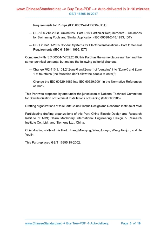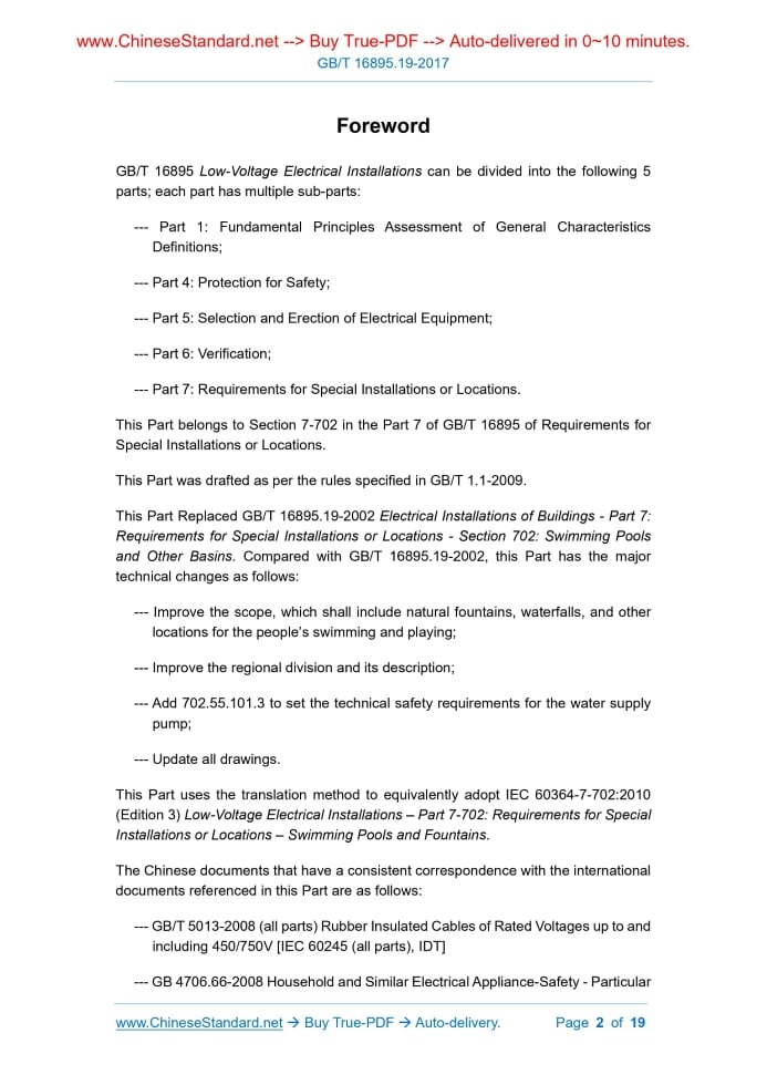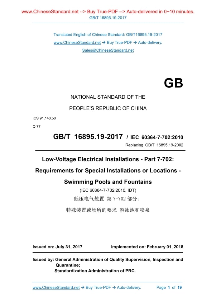 GB/T 16895.19-2017: Low-voltage electrical installations -- Part 7-702: Requirements for special installations or locations -- Swimming pools and fountains Delivery: 9 seconds. True-PDF full-copy in English & invoice will be downloaded + auto-delivered via email. See step-by-step procedure Status: Valid GB/T 16895.19: Historical versions