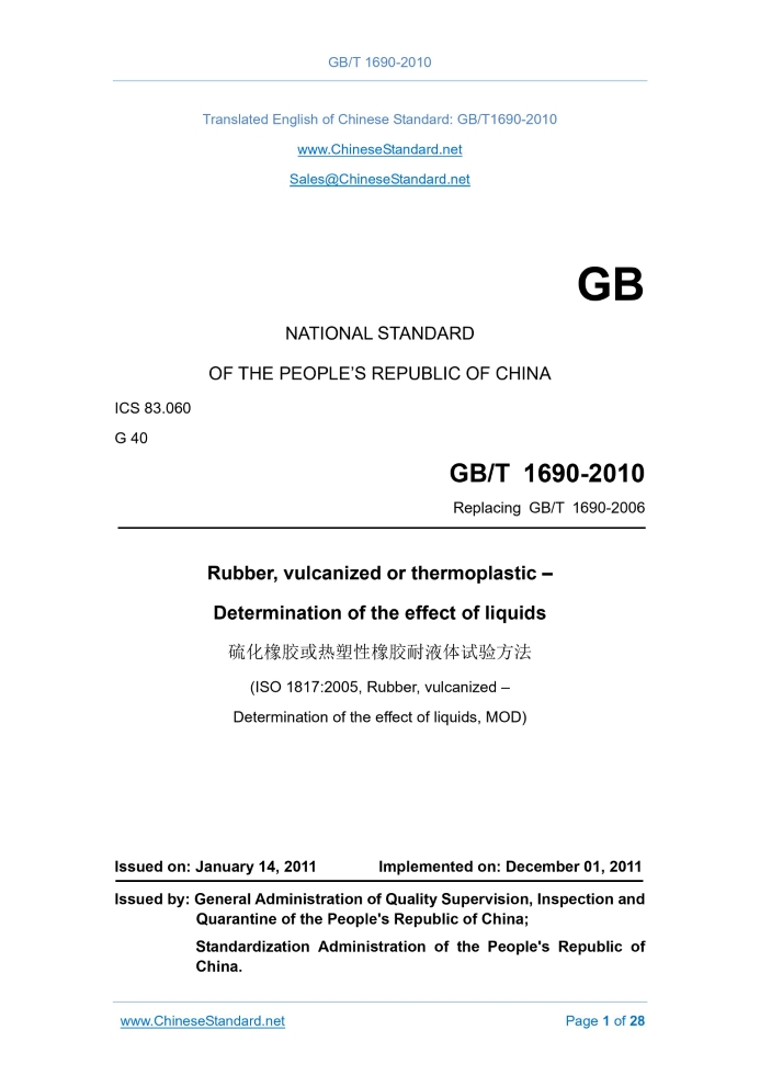 GB/T 1690-2010: Rubber, vulcanized or thermoplastic -- Determination of the effect of liquids Delivery: 9 seconds. True-PDF full-copy in English & invoice will be downloaded + auto-delivered via email. See step-by-step procedure Status: Valid GB/T 1690: Historical versions