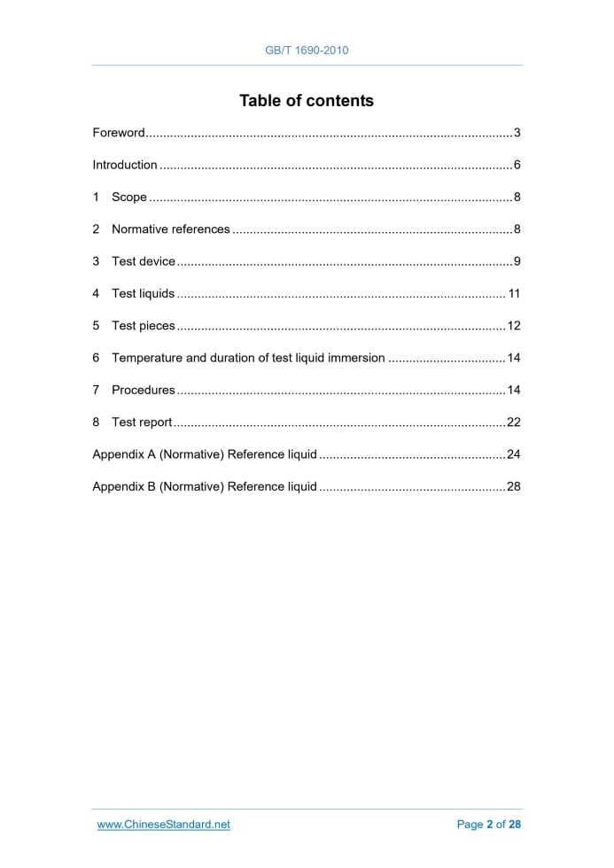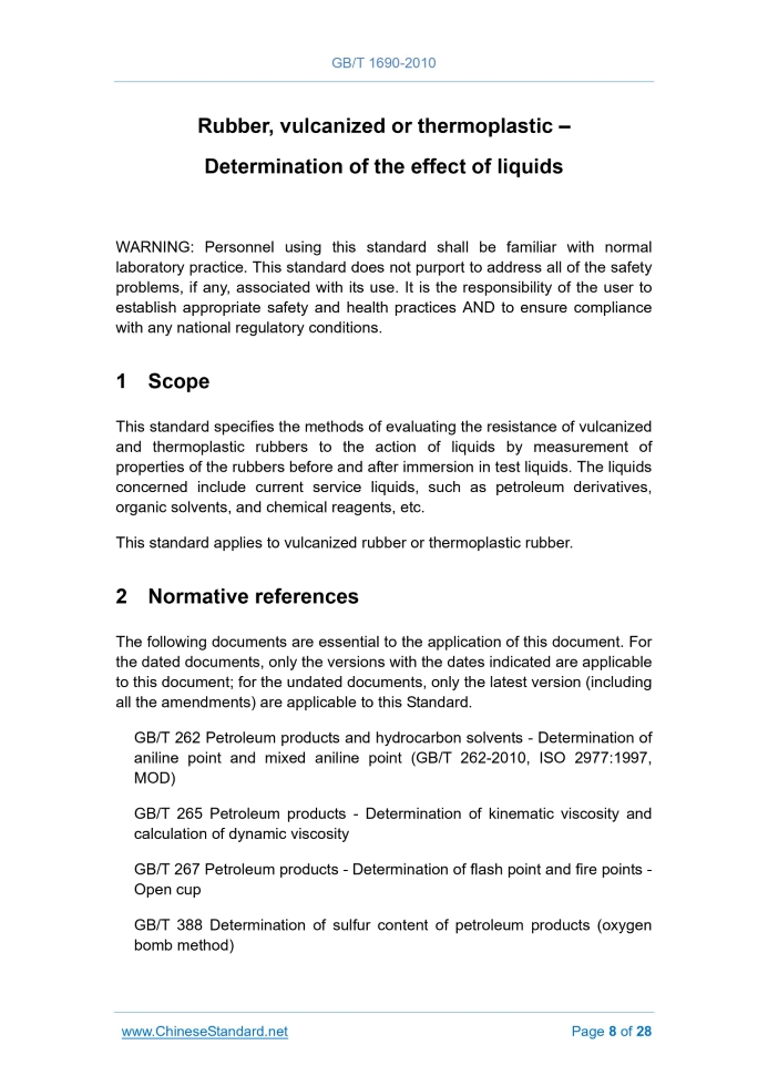 Similar standardsGB/T 1690-2010: Rubber, vulcanized or thermoplastic -- Determination of the effect of liquids---This is an excerpt. Full copy of true-PDF in English version (including equations, symbols, images, flow-chart, tables, and figures etc.), auto-downloaded/delivered in 9 seconds, can be purchased online: https://www.ChineseStandard.net/PDF.aspx/GBT1690-2010GB NATIONAL STANDARD ICS 83.060 G 40 Replacing GB/T 1690-2006 Rubber, vulcanized or thermoplastic – Determination of the effect of liquids (ISO 1817.2005, Rubber, vulcanized – Determination of the effect of liquids, MOD) Issued on. JANUARY 14, 2011 Implemented on. DECEMBER 01, 2011 Issued by. General Administration of Quality Supervision, Inspection and Quarantine of the People's Republic of China; Standardization Administration of the People's Republic of China. Table of ContentsForeword... 3 Introduction... 6 1 Scope... 8 2 Normative references... 8 3 Test device... 9 4 Test liquids... 11 5 Test pieces... 12 6 Temperature and duration of test liquid immersion... 14 7 Procedures... 14 8 Test report... 22 Appendix A (Normative) Reference liquid... 24 Appendix B (Normative) Reference liquid... 28ForewordThis standard was drafted in accordance with the rules given in GB/T 1.1-2009. This standard replaces GB/T 1690-2006 “Rubber, vulcanized or thermoplastic - Determination of the effect of liquids”. As compared with GB/T 1690-2006, the main technical differences of this standard are as follows. - ADD a test piece type of “measuring of volume changes and mass changes”, type II. 25 mm x 25 mm square (SEE 5.2); - CORRECT the equation (1) into (SEE 7.2); - ADD an equation (SEE 7.3); - ADD the Appendix B “Reference liquid”, in order to specify the main performance of domestic No.1, 2, and 3 standard oils. This standard, through the re-drafting method, modifies and adopts ISO 1817.2005 “Rubber, vulcanized - Determination of the effects of liquids” (English version). The technical differences between this standard and ISO 1817.2005 AND their causes are as follows. - CHANGE the standard name into “Rubber, vulcanized or thermoplastic - Determination of the effect of liquids”, because the standard scope had included the thermoplastic rubber. - On the normative references, this standard has made adjustments with technical differences, in order to adapt to the technical conditions in China, AND the adjustments are centrally reflected in Chapter 2 “Normative references”, which are detailed as below. • USE the GB/T 262 which had modified and adopted international standard to replace ISO 2977 (SEE Table A.3 and Table B.1); • USE the GB/T 528 which had equivalently adopted international standard to replace ISO 37 (SEE 5.2 and 7.7); • USE the GB/T 1884 which had modified and adopted international standard to replace ISO 3675 (SEE Table A.3; Table B.2); • USE the GB/T 2941-2006 which had equivalently adopted international standard to replace ISO 23529.2004 (SEE 3.4, 5.1, 5.3, 5.4 and 6.1); • USE the GB/T 3535 which had modified and adopted international standard to replace ISO 3016.1994 (SEE Table A.4); • USE the GB/T 3536 which had modified and adopted international standard to replace ISO 2592.2000 (SEE Table A.3); • USE the GB/T 6031 which had equivalently adopted international standard to replace ISO 48.1994 (SEE 7.6); • USE the GB/T 11547 which had modified and adopted international standard to replace ISO 175.1999 (SEE Table A.4). - In Chapter 2 “Normative references”, ADD three standards. GB/T 265, GB/T 267, and GB/T 388.The reason for this is that these three standards are referenced in the newly added Appendix B of this standard. - The test mass changes, volume changes and test piece size requirements vary. In this standard, it specifies that the test piece size is type I. 25 mm x 50 mm rectangle; type II. 25 mm × 25 mm square (5.2 of this version). However in ISO 1817.2005, it specifies that the test piece is 1 cm3 ~ 3 cm3 (5.2 of ISO 1817 version). This is due to the wide range of ISO standards, which is not favorable to unify standard or data comparison. - When selecting the test liquid, in addition to the ASTM No.1, IRM902 and IRM903 standard oils as specified in ISO 1817.2005 (Appendix A of this version), ADD the domestic No.1, 2 and 3 standard oils (Appendix B of this version) of GB/T 1690-1992.As the ASTM No.1, IRM902 and IRM903 standard oils as specified in ISO 1817.2005 adopted has not yet achieved localization, they need to be imported and the purchase channel is narrow, especially there is difference between the test results and the test results of the domestic No.1, 2 and 3 standard soils; therefore, it adds the domestic No.1, 2 and 3 standard oils (Appendix B of this version) of GB/T 1690-1992. - DELETE the descriptions on the reasons for specifying the standard simulation liquid from the Appendix A.1 (Appendix A of this version; Paragraph I of Appendix A in ISO 1817), because the provisions in Table A.1 are clear. - ADD the Appendix B “Reference liquid”, to specify the main performance of domestic No.1, 2, and 3 standard oils. This standard was proposed by the China Petroleum and Chemical Industry Association. This standard is under the jurisdiction of the National Rubber Standard Committee General Test Method Sub-committee (SAC/TC 35/SC 2). The main drafting organizations of this standard. Rubber Group Shenyang Rubber Research & Design Institute Company Limited, Beijing Rubber Industry Research and Design Institute, Northwest Rubber and Plastic Research and Design Institute. The main drafters of this standard. Fei Kanghong, Zhao Bodan, Xie Junfang, Zhu Wei. This Standard replaces the standard previously issued as follows. - GB/T 1690-1987, GB/T 1690-1992, GB/T 1690-2006.1 ScopeThis standard specifies the methods of evaluating the resistance of vulcanized and thermoplastic rubbers to the action of liquids by measurement of properties of the rubbers before and after immers