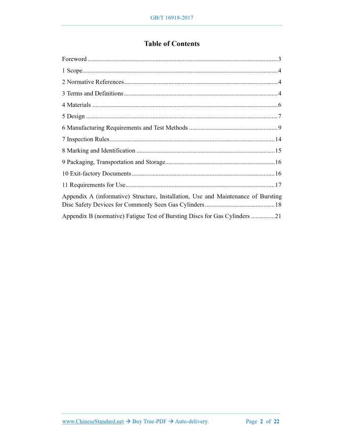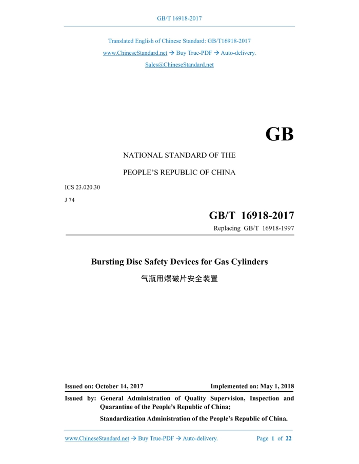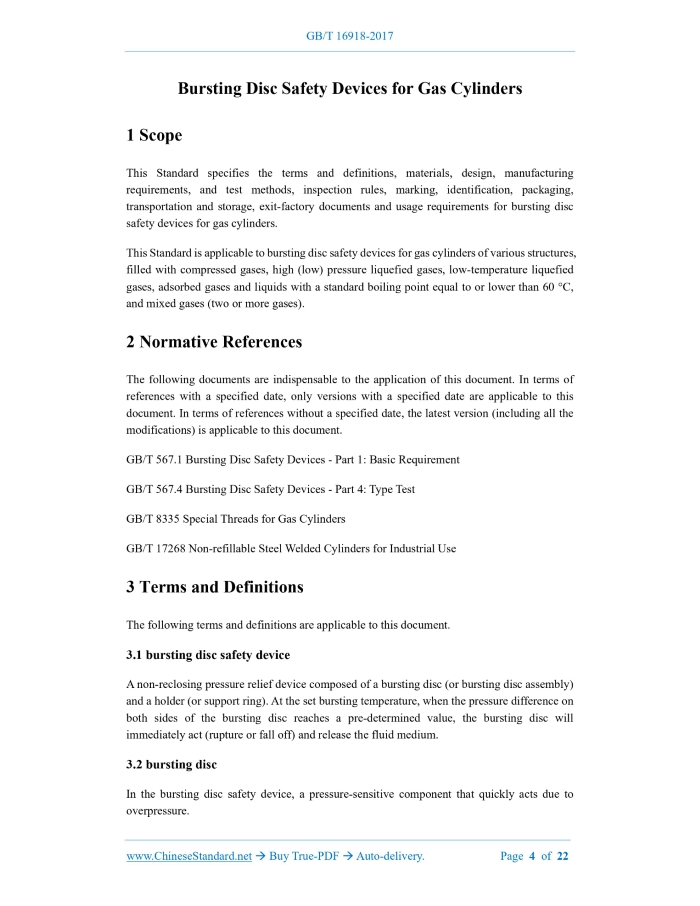 Similar standardsGB/T 16918-2017: Bursting disc safety devices for gas cylinders---This is an excerpt. Full copy of true-PDF in English version (including equations, symbols, images, flow-chart, tables, and figures etc.), auto-downloaded/delivered in 9 seconds, can be purchased online: https://www.ChineseStandard.net/PDF.aspx/GBT16918-2017GB NATIONAL STANDARD OF THE PEOPLE’S REPUBLIC OF CHINA ICS 23.020.30 J 74 Replacing GB/T 16918-1997 Bursting Disc Safety Devices for Gas Cylinders ISSUED ON: OCTOBER 14, 2017 IMPLEMENTED ON: MAY 1, 2018 Issued by: General Administration of Quality Supervision, Inspection and Quarantine of the People’s Republic of China; Standardization Administration of the People’s Republic of China. Table of ContentsForeword ... 3 1 Scope ... 4 2 Normative References ... 4 3 Terms and Definitions ... 4 4 Materials ... 6 5 Design ... 7 6 Manufacturing Requirements and Test Methods ... 9 7 Inspection Rules ... 14 8 Marking and Identification ... 15 9 Packaging, Transportation and Storage ... 16 10 Exit-factory Documents ... 16 11 Requirements for Use ... 17 Appendix A (informative) Structure, Installation, Use and Maintenance of Bursting Disc Safety Devices for Commonly Seen Gas Cylinders ... 18 Appendix B (normative) Fatigue Test of Bursting Discs for Gas Cylinders ... 21 Bursting Disc Safety Devices for Gas Cylinders1 ScopeThis Standard specifies the terms and definitions, materials, design, manufacturing requirements, and test methods, inspection rules, marking, identification, packaging, transportation and storage, exit-factory documents and usage requirements for bursting disc safety devices for gas cylinders. This Standard is applicable to bursting disc safety devices for gas cylinders of various structures, filled with compressed gases, high (low) pressure liquefied gases, low-temperature liquefied gases, adsorbed gases and liquids with a standard boiling point equal to or lower than 60 C, and mixed gases (two or more gases).2 Normative ReferencesThe following documents are indispensable to the application of this document. In terms of references with a specified date, only versions with a specified date are applicable to this document. In terms of references without a specified date, the latest version (including all the modifications) is applicable to this document. GB/T 567.1 Bursting Disc Safety Devices - Part 1: Basic Requirement GB/T 567.4 Bursting Disc Safety Devices - Part 4: Type Test GB/T 8335 Special Threads for Gas Cylinders GB/T 17268 Non-refillable Steel Welded Cylinders for Industrial Use3 Terms and DefinitionsThe following terms and definitions are applicable to this document. 3.1 bursting disc safety device A non-reclosing pressure relief device composed of a bursting disc (or bursting disc assembly) and a holder (or support ring). At the set bursting temperature, when the pressure difference on both sides of the bursting disc reaches a pre-determined value, the bursting disc will immediately act (rupture or fall off) and release the fluid medium. 3.2 bursting disc In the bursting disc safety device, a pressure-sensitive component that quickly acts due to overpressure. During the bursting test of the bursting disc, the actual bursting pressure value at the moment of bursting. 3.13 bursting temperature When the bursting disc reaches the bursting pressure, the temperature of the diaphragm wall of the bursting disc. 3.14 performance tolerance The maximum allowable deviation of the actual test bursting pressure of the bursting disc relative to the specified bursting pressure, that is, the ratio of the difference between the test bursting pressure and the specified bursting pressure to the specified bursting pressure. 3.15 batch A group of bursting discs with the same category, type, specifications, specified bursting pressure and specified bursting temperature, and with identical materials (designation, batch No. and specifications) and manufacturing process is considered as one batch. 3.16 cylinder test pressure The hydraulic test pressure of gas cylinders. For gas cylinders undergoing air pressure test, it refers to the pressure of air pressure test.4 Materials4.1 The materials used for the bursting discs shall have good corrosion resistance, uniform and stable mechanical properties and thermal stability. 4.2 The maximum and minimum allowable operating temperatures of metals, non-metals and coating (plating) materials used on the bursting discs shall comply with the stipulations of GB/T 567.1. 4.3 The materials used for components, such as: bursting discs, bursting disc holder rings and screw plugs shall comply with the stipulations of corresponding national standards or industry standards, and shall have quality certification documents (including quality certificates and certificates of conformity) provided by the material manufacturing organization. 4.4 The materials used for bursting discs shall be re-inspected in accordance with the stipulations of the corresponding material standards and design drawings, and can only be used after reaching the requirements. 4.5 When the medium is corrosive to the materials of the bursting disc safety device, anti- corrosion treatment measures, such as: corrosion-resistant protective film or coating (plating) layer shall be adopted. The anti-corrosion treatment shall satisfy the following requirements: a) When using an anti-corrosion protective film, it shall be ensured that the protective film is airtight and provided in a set or as a whole with the bursting disc safety device; b) The anti-corrosion measures shall be completed in the bursting disc safety device manufacturing organization, and the measures cannot affect the design performance indicators of the bursting disc safety device; c) The anti-corrosion treatment shall be carried out before the performance inspection of the bursting disc safety device.5 Design5.1 Specified Bursting Temperature and Specified Bursting Pressure 5.1.1 The specified bur