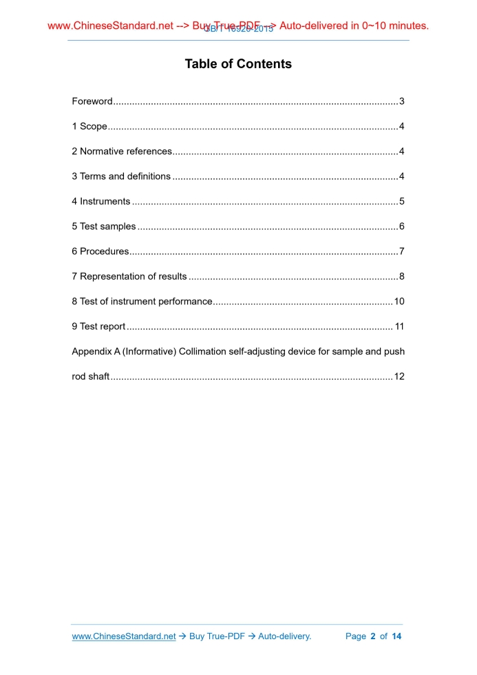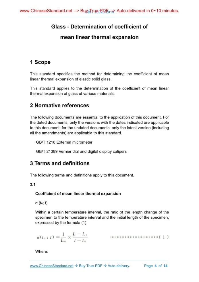 Similar standardsGB/T 16920-2015: Glass -- Determination of coefficient of mean linear thermal expansion---This is an excerpt. Full copy of true-PDF in English version (including equations, symbols, images, flow-chart, tables, and figures etc.), auto-downloaded/delivered in 9 seconds, can be purchased online: https://www.ChineseStandard.net/PDF.aspx/GBT16920-2015GB NATIONAL STANDARD OF THE PEOPLE’S REPUBLIC OF CHINA ICS 81.040.01 N 64 Replacing GB/T 16920-1997 Glass - Determination of coefficient of mean linear thermal expansion (ISO 7991.1987, NEQ) Issued on: DECEMBER 31, 2015 Implemented on: JULY 01, 2016 Issued by. General Administration of Quality Supervision, Inspection and Quarantine; Standardization Administration of PRC. Table of ContentsForeword ... 3 1 Scope ... 4 2 Normative references ... 4 3 Terms and definitions ... 4 4 Instruments ... 5 5 Test samples ... 6 6 Procedures ... 7 7 Representation of results ... 8 8 Test of instrument performance ... 10 9 Test report ... 11 Appendix A (Informative) Collimation self-adjusting device for sample and push rod shaft ... 12 Glass - Determination of coefficient of mean linear thermal expansion1 ScopeThis standard specifies the method for determining the coefficient of mean linear thermal expansion of elastic solid glass. This standard applies to the determination of the coefficient of mean linear thermal expansion of glass of various materials.2 Normative referencesThe following documents are essential to the application of this document. For the dated documents, only the versions with the dates indicated are applicable to this document; for the undated documents, only the latest version (including all the amendments) are applicable to this standard. GB/T 1216 External micrometer GB/T 21389 Vernier dial and digital display calipers3 Terms and definitionsThe following terms and definitions apply to this document. 3.1 Coefficient of mean linear thermal expansion α (t0; t) Within a certain temperature interval, the ratio of the length change of the specimen to the temperature interval and the initial length of the specimen, expressed by the formula (1). Where. performance. The method is as shown in the calibration and verification of the performance test of instrument. 4.3 Heating furnace The heating furnace shall be matched with the dilatometer device. The upper limit of temperature shall be about 50 °C higher than the expected determined temperature of transformation (t). The working position of the heating furnace as relative to the dilatometer shall have a reproducibility within 0.5 mm in the axial and radial directions. Within the range of test temperature (i.e., the upper limit temperature is 150 °C lower than the highest expected transformation temperature tg, at least the temperature difference between 300 °C and tg is greater than 150 °C, and shall not be lower than 300 °C), throughout the determination interval of the entire specimen length, the furnace’s temperature shall be constantly controlled within ±1 °C. The heating furnace shall be able to meet the control requirements of 5 °C/min ± 1 °C/min. Within the range of the test temperature, the ideal rate of temperature rise is 5 °C/min ± 1 °C/min. 4.4 Temperature measuring device In the temperature range of t0 and t, it may be able to accurately determine the temperature of the specimen, the error is less than ±1 °C.5 Test samples5.1 Shape and size The specimen is usually rod-shaped, the shape of which depends on the type of dilatometer used, the length L0 shall be at least 5 × 105 times the resolution of the length measuring device of the dilatometer. Note. For example, the specimen may be a round bar which has a diameter of 5 mm, length of 50 mm ± 1 mm; or according to the structure of the dilatometer, it may also be a square bar which has a section of 5 mm × 5 mm and a length of 25 mm ~ 100 mm. The specimen of other square or rectangular sections shall be able to ensure the accuracy and repeatability of the measurement (see Appendix A). 5.2 Preparation of specimen Select the glass which has no defects such as stones, bubbles, and streaks. Use the mechanical cutting or hot working methods to prepare it into the shape and size required for the specimen, then make it annealed. The annealing difference between the hot joint of the thermocouple and the specimen, the apparent temperature of the specimen shall plus the corrected value. Note. The magnitude of this corrected value depends on the rate of temperature change as well as the rate of heat exchange between the heating furnace and the specimen. Fundamentally, the corrected value is to be determined by comparison with a constant temperature test. 6.4 Constant temperature test At the initial temperature t0, determine the position of the dilatometer. Use this reading as the zero point of the uncorrected amount of change of length ΔLmeas to be measured. Then rise the temperature of furnace to the selected end-point temperature t, keep the furnace’s temperature constantly at ±2 °C. After 20 min, take the reading of ΔLmeas from the dilatometer. Note. Although the temperature-rise test can determine the coefficient α (t0; t) of various temperatures t during the test, if only one end-point temperature t is required, it shall give priority to the constant-temperature test, because this test may provide better accuracy.7 Representation of results7.1 Calculation of final length From the measured length variable ΔLmeas, the corrected length L at the temperature t is calculated by the use of formula (2). Where. The correction terms ΔLQ and ΔLB are explained in 7.2 or 7.3, respectively. 7.2 Calculation of expansion of specimen-bearing device (ΔLQ) In the case of a single-pusher-type dilatometer, the correction term ΔLQ in the formula (2) is the thermal expansion of the portion (length = L0) of the specimen- bearing device which is located near the specimen at a temperature of t0. In the case of a diffe