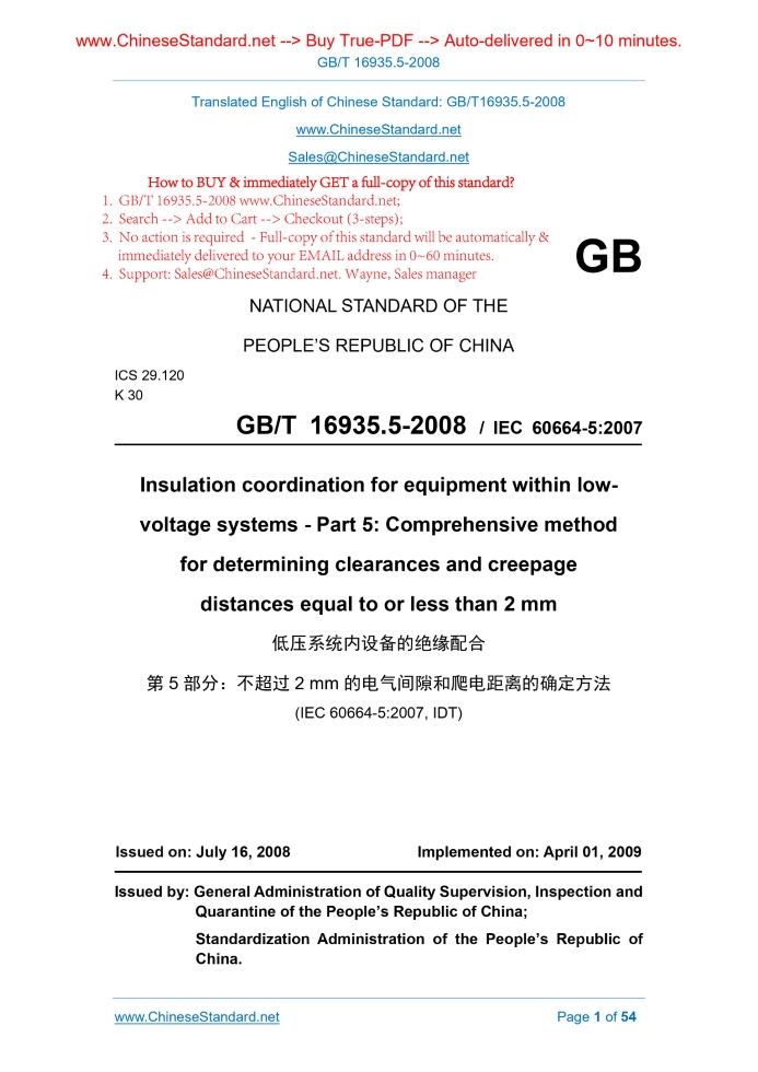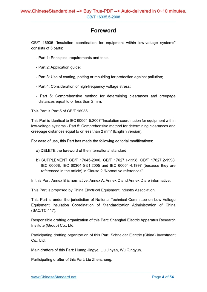 GB/T 16935.5-2008: Insulation coordination for equipment within low-voltage systems -- Part 5: Comprehensive method for determining clearances and creepage distances equal to or less than 2mm Delivery: 9 seconds. True-PDF full-copy in English & invoice will be downloaded + auto-delivered via email. See step-by-step procedure Status: Valid