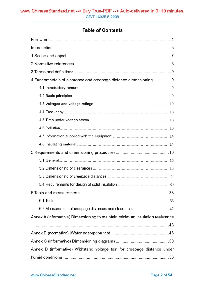 Similar standardsGB/T 16935.5-2008: Insulation coordination for equipment within low-voltage systems -- Part 5: Comprehensive method for determining clearances and creepage distances equal to or less than 2mm---This is an excerpt. Full copy of true-PDF in English version (including equations, symbols, images, flow-chart, tables, and figures etc.), auto-downloaded/delivered in 9 seconds, can be purchased online: https://www.ChineseStandard.net/PDF.aspx/GBT16935.5-2008 GB NATIONAL STANDARD OF THE PEOPLE’S REPUBLIC OF CHINA ICS 29.120 K 30 GB/T 16935.5-2008 / IEC 60664-5.2007 Insulation coordination for equipment within low- voltage systems - Part 5.Comprehensive method for determining clearances and creepage distances equal to or less than 2 mm (IEC 60664-5.2007, IDT) Issued on. JULY 16, 2008 Implemented on. APRIL 01, 2009 Issued by. General Administration of Quality Supervision, Inspection and Quarantine of the People’s Republic of China; Standardization Administration of the People’s Republic of China. Table of ContentsForeword... 4 Introduction... 5 1 Scope and object... 7 2 Normative references... 8 3 Terms and definitions... 9 4 Fundamentals of clearance and creepage distance dimensioning... 9 4.1 Introductory remark... 9 4.2 Basic principles... 9 4.3 Voltages and voltage ratings... 10 4.4 Frequency... 13 4.5 Time under voltage stress... 13 4.6 Pollution... 13 4.7 Information supplied with the equipment... 14 4.8 Insulating material... 14 5 Requirements and dimensioning procedures... 16 5.1 General... 16 5.2 Dimensioning of clearances... 16 5.3 Dimensioning of creepage distances... 22 5.4 Requirements for design of solid insulation... 30 6 Tests and measurements... 33 6.1 Tests... 33 6.2 Measurement of creepage distances and clearances... 42 Annex A (informative) Dimensioning to maintain minimum insulation resistance ... 43 Annex B (normative) |Water adsorption test... 46 Annex C (informative) Dimensioning diagrams... 50 Annex D (informative) Withstand voltage test for creepage distance under humid conditions... 53 Bibliography... 54ForewordGB/T 16935 “Insulation coordination for equipment within low-voltage systems” consists of 5 parts. - Part 1.Principles, requirements and tests; - Part 2.Application guide; - Part 3.Use of coating, potting or moulding for protection against pollution; - Part 4.Consideration of high-frequency voltage stress; - Part 5.Comprehensive method for determining clearances and creepage distances equal to or less than 2 mm. This Part is Part 5 of GB/T 16935. This Part is identical to IEC 60664-5.2007 “Insulation coordination for equipment within low-voltage systems - Part 5.Comprehensive method for determining clearances and creepage distances equal to or less than 2 mm” (English version). For ease of use, this Part has made the following editorial modifications. a) DELETE the foreword of the international standard; b) SUPPLEMENT GB/T 17045-2006, GB/T 17627.1-1998, GB/T 17627.2-1998, IEC 60068, IEC 60364-5-51.2005 and IEC 60664-4.1997 (because they are referenced in the article) in Clause 2 “Normative references”. In this Part, Annex B is normative, Annex A, Annex C and Annex D are informative. This Part is proposed by China Electrical Equipment Industry Association. This Part is under the jurisdiction of National Technical Committee on Low Voltage Equipment Insulation Coordination of Standardization Administration of China (SAC/TC 417). Responsible drafting organization of this Part. Shanghai Electric Apparatus Research Institute (Group) Co., Ltd. Participating drafting organization of this Part. Schneider Electric (China) Investment Co., Ltd. Main drafters of this Part. Huang Jingye, Liu Jinyan, Wu Qingyun. Participating drafter of this Part. Liu Zhenzhong.1 Scope and objectThis Part of GB/T 16935 specifies the dimensioning of clearances and creepage distances for spacings equal to or less than 2 mm for printed wiring board and equivalent constructions, where the clearance and the creepage distance are identical and are along the surface of solid insulation, such as the paths described in 6.2 of Part 12) (Examples 1, 5 and 11).2 Normative referencesThe following referenced documents are indispensable for the application of this document. For dated references, only the edition cited applies. For undated references, the latest edition of the referenced document (including any amendments) applies. Clause 2 of Part 1 is applicable, as well as the following. GB/T 4798.3-2007 Environmental conditions existing in the application of electric and electronic products - Section 3.Stationary use at weather-protected locations (IEC 60721-3-3.2002, MOD)3 Terms and definitionsFor the purposes of this document, the following terms and definitions, in addition to those given in GB/T 16935.1-2008, apply. Value of the relative humidity when the impulse withstand voltage of a creepage distance has dropped to 95 % of the value that was measured at 70 % relative humidity.4 Fundamentals of clearance and creepage distance dimensioningThe micro-environmental conditions for the insulation shall be taken into account. They depend primarily on the macro-environmental conditions in which the equipment is located and, in many cases, the environments are identical.5 Requirements and dimensioning proceduresValues for clearances in Table 2 for case B are only applicable for homogeneous fields. They can only be used where the shape and arrangement of the conductive parts is designed to achieve an electric field having an essentially constant voltage gradient. Subclause 5.3.3.7 of Part 1 is applicable.6 Tests and measurementsIf the withstand against steady-state voltages, recurring peak voltages or temporary overvoltages according to 5.2 is decisive for the dimensioning of clearances, and if those clearances are smaller than the case A values of Table 3, an a.c. voltage test according to the test in 6.1.2.2.2.2 of Part 1 is required. For the test conditions, technical commit