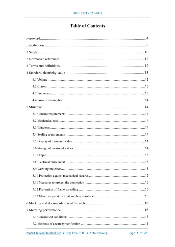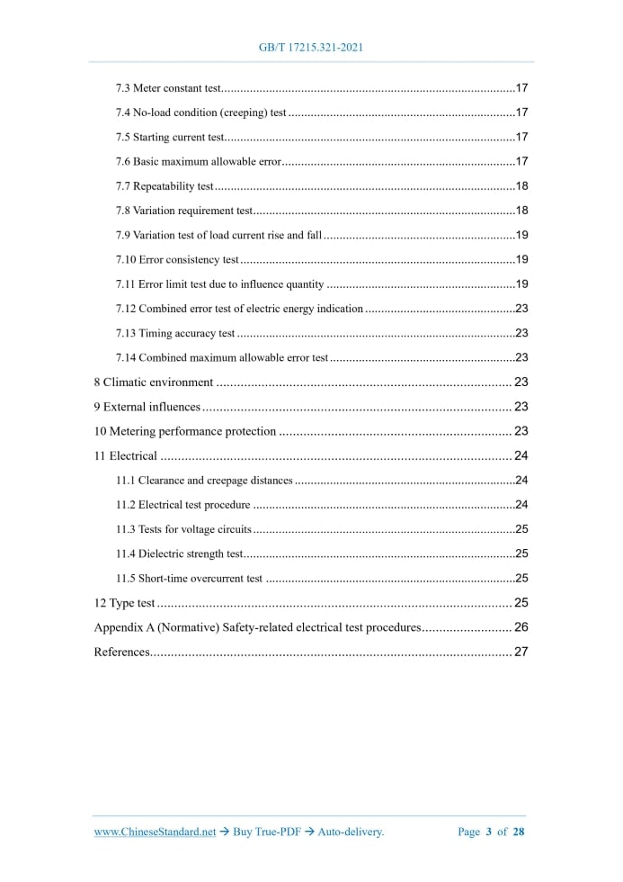 Similar standardsGB/T 17215.321-2021: Electricity metering equipment (AC) - Particular requirements - Part 21: Static meters for active energy(classes A, B, C, D and E)---This is an excerpt. Full copy of true-PDF in English version (including equations, symbols, images, flow-chart, tables, and figures etc.), auto-downloaded/delivered in 9 seconds, can be purchased online: https://www.ChineseStandard.net/PDF.aspx/GBT17215.321-2021 NATIONAL STANDARD OF THE PEOPLE’S REPUBLIC OF CHINA ICS 17.220.20 N 22 Replacing GB/T 17215.321-2008, GB/T 17215.322-2008 Electricity metering equipment (AC) - Particular requirements - Part 21: Static meters for active energy (classes A, B, C, D and E) ISSUED ON: APRIL 30, 2021 IMPLEMENTED ON: NOVEMBER 01, 2021 Issued by: State Administration for Market Regulation; Standardization Administration of PRC. Table of ContentsForeword ... 4 Introduction ... 8 1 Scope ... 10 2 Normative references ... 12 3 Terms and definitions... 12 4 Standard electricity value ... 13 4.1 Voltage ... 13 4.2 Current ... 13 4.3 Frequency ... 13 4.4 Power consumption ... 14 5 Structure ... 14 5.1 General requirements ... 14 5.2 Mechanical test ... 14 5.3 Windows ... 14 5.4 Sealing requirements ... 14 5.5 Display of measured value ... 14 5.6 Storage of measured values ... 14 5.7 Output ... 15 5.8 Electrical pulse input ... 15 5.9 Working indicator ... 15 5.10 Protection against mechanical hazards ... 15 5.11 Measures to protect the connection ... 15 5.12 Prevention of flame spreading ... 15 5.13 Meter temperature limit and heat resistance ... 15 6 Marking and documentation of the meter ... 16 7 Metering performance ... 16 7.1 General test conditions ... 16 7.2 Methods of accuracy verification ... 16 7.3 Meter constant test ... 17 7.4 No-load condition (creeping) test ... 17 7.5 Starting current test ... 17 7.6 Basic maximum allowable error ... 17 7.7 Repeatability test ... 18 7.8 Variation requirement test ... 18 7.9 Variation test of load current rise and fall ... 19 7.10 Error consistency test ... 19 7.11 Error limit test due to influence quantity ... 19 7.12 Combined error test of electric energy indication ... 23 7.13 Timing accuracy test ... 23 7.14 Combined maximum allowable error test ... 23 8 Climatic environment ... 23 9 External influences ... 23 10 Metering performance protection ... 23 11 Electrical ... 24 11.1 Clearance and creepage distances ... 24 11.2 Electrical test procedure ... 24 11.3 Tests for voltage circuits ... 25 11.4 Dielectric strength test ... 25 11.5 Short-time overcurrent test ... 25 12 Type test ... 25 Appendix A (Normative) Safety-related electrical test procedures ... 26 References ... 27 Electricity metering equipment (AC) - Particular requirements - Part 21: Static meters for active energy (classes A, B, C, D and E)1 ScopeThis Part of GB/T 17215.3 specifies the standard electricity value, structure, meter's marking and documentation, metering performance, climate environment, external influence, metering performance protection, electrical requirements, for static meters for active energy. This Part of GB/T 17215.3 is only applicable to the newly manufactured static meters for active energy, which is used to measure the AC active energy, in 50 Hz or 60 Hz power grid, AND has an accuracy class of A, B, C, D, E. (below referred to as "meter"). It is also applicable to other type tests. Note 1: For other requirements (such as structure, EMC, reliability), refer to GB/T 17215.211- 2021, as well as the relevant parts of GB/T 17215.911, GB/T 17215.921, GB/T 17215.9311, GB/T 17215.9321, GB/T 17215.941. This Part applies to newly manufactured electricity metering equipment, which is used to meter and control electrical energy in the power grid, that has a voltage not exceeding 600 V. All special functional units, except the electrical energy measuring function, can be integrated in the meter enclosure, OR can form a separate enclosure. Note 2: The above voltage is the line-to-neutral line voltage, which is derived from the nominal voltage, as shown in Table 7 of IEC 62052-31:2015. If the meter has functions other than metering active energy, for example: - Measurement of voltage amplitude, current amplitude, power, frequency, power factor, etc.; - Measurement of power quality parameters; - Load control function; - Data communication interface. If encapsulated in the meter enclosure, the relevant standards can apply to these functional requirements. However, the requirements for these functions are not within the scope of this Part. Note 3: The requirements for power monitoring devices and measurement functions (such as voltage amplitude, current amplitude, power, frequency, etc.) have been covered in GB/T 18216.12; BUT equipment, that complies with GB/T 18216.12, is not suitable as a payment meter, unless they also meet the accuracy class requirements of this Part. Note 4: The requirements for power quality monitoring meters have been covered in IEC 62586-1. The measurement methods for power quality monitoring functions have been covered in GB/T 17626.30-2012. The test requirements for power quality monitoring functions are covered in IEC 62586-2. The requirements of this Part apply, if the meter is designed to be mounted on a specified mating (meter) socket or rack. The test is performed, with the meter mounted on the specified mating socket or rack. However, the requirements for such socket or rack are outside the scope of this Part. Note 5: Examples of rack-mounted meters are: rail-mounted meters, panel-mounted meters, etc. If the meter is designed to install a separated indicator display, the requirements of this Part apply; meanwhile, the meter can be connected to its separated indicator display for testing, unless otherwise specified. If the meter has more than one current circuit per phase (for example: multi-unit meter), the requirements of this Part apply to all current circuits of any current-measuring unit, in the meter enclosure. This Part also app