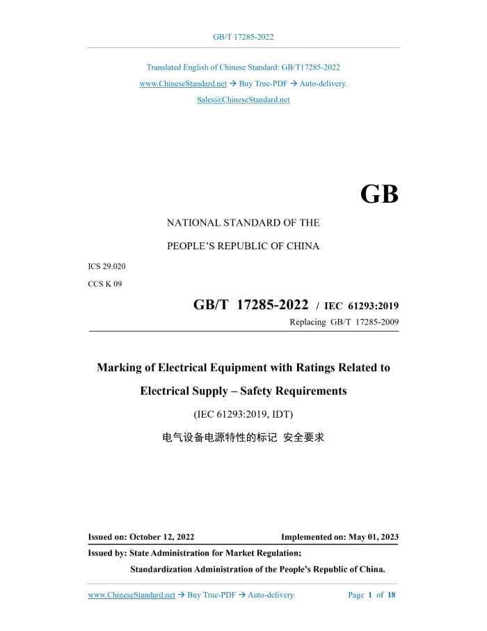 GB/T 17285-2022230 Add to Cart Auto, 9 seconds. Marking of electrical equipment with ratings related to electrical supply - Safety requirements Valid