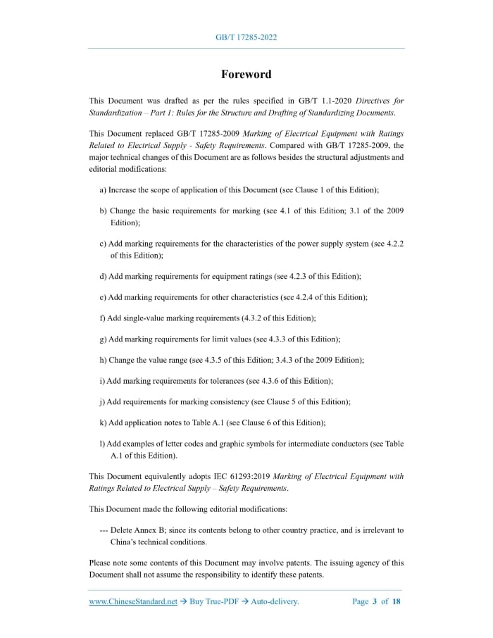 This Document was drafted as per the rules specified in GB/T 1.1-2020 Directives for Standardization – Part 1: Rules for the Structure and Drafting of Standardizing Documents. This Document replaced GB/T 17285-2009 Marking of Electrical Equipment with Ratings Related to Electrical Supply - Safety Requirements. Compared with GB/T 17285-2009, the major technical changes of this Document are as follows besides the structural adjustments and editorial modifications: a) Increase the scope of application of this Document (see Clause 1 of this Edition); b) Change the basic requirements for marking (see 4.1 of this Edition; 3.1 of the 2009 Edition); c) Add marking requirements for the characteristics of the power supply system (see 4.2.2 of this Edition); d) Add marking requirements for equipment ratings (see 4.2.3 of this Edition); e) Add marking requirements for other characteristics (see 4.2.4 of this Edition); f) Add single-value marking requirements (4.3.2 of this Edition); g) Add marking requirements for limit values (see 4.3.3 of this Edition); h) Change the value range (see 4.3.5 of this Edition; 3.4.3 of the 2009 Edition); i) Add marking requirements for tolerances (see 4.3.6 of this Edition); j) Add requirements for marking consistency (see Clause 5 of this Edition); k) Add application notes to Table A.1 (see Clause 6 of this Edition); l) Add examples of letter codes and graphic symbols for intermediate conductors (see Table A.1 of this Edition). This Document equivalently adopts IEC 61293:2019 Marking of Electrical Equipment with Ratings Related to Electrical Supply – Safety Requirements. This Document made the following editorial modifications: --- Delete Annex B; since its contents belong to other country practice, and is irrelevant to China’s technical conditions. Please note some contents of this Document may involve patents. The issuing agency of this Document shall not assume the responsibility to identify these patents. Marking of Electrical Equipment with Ratings Related to Electrical Supply – Safety Requirements