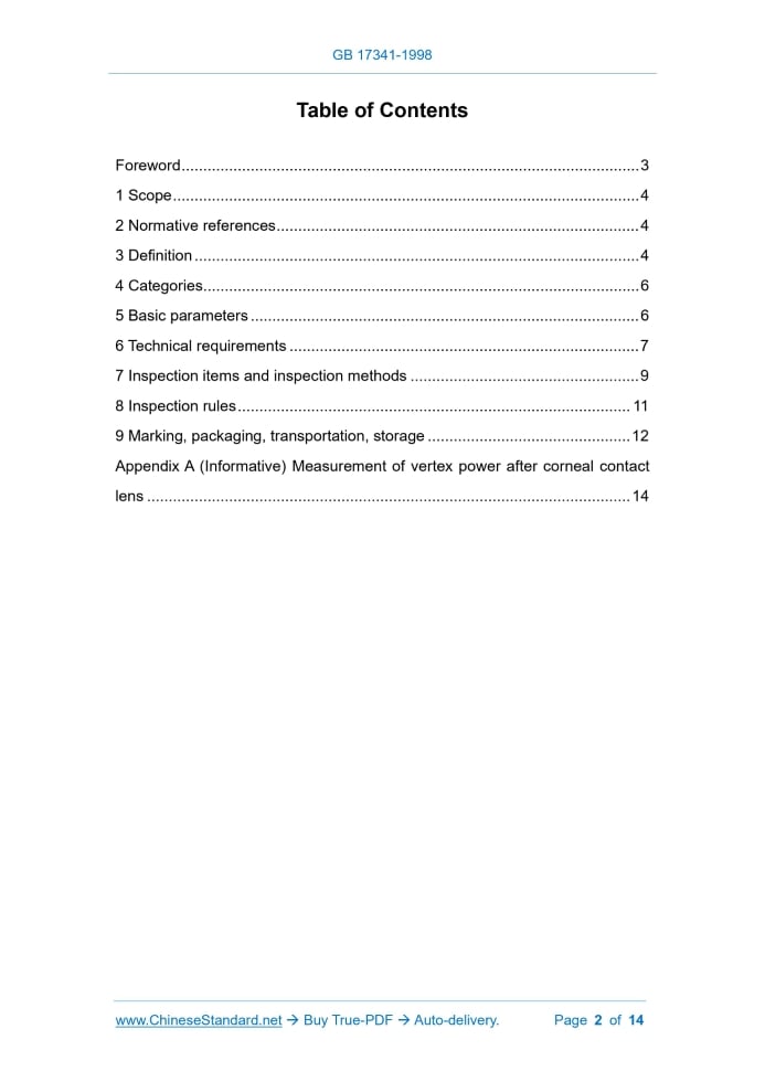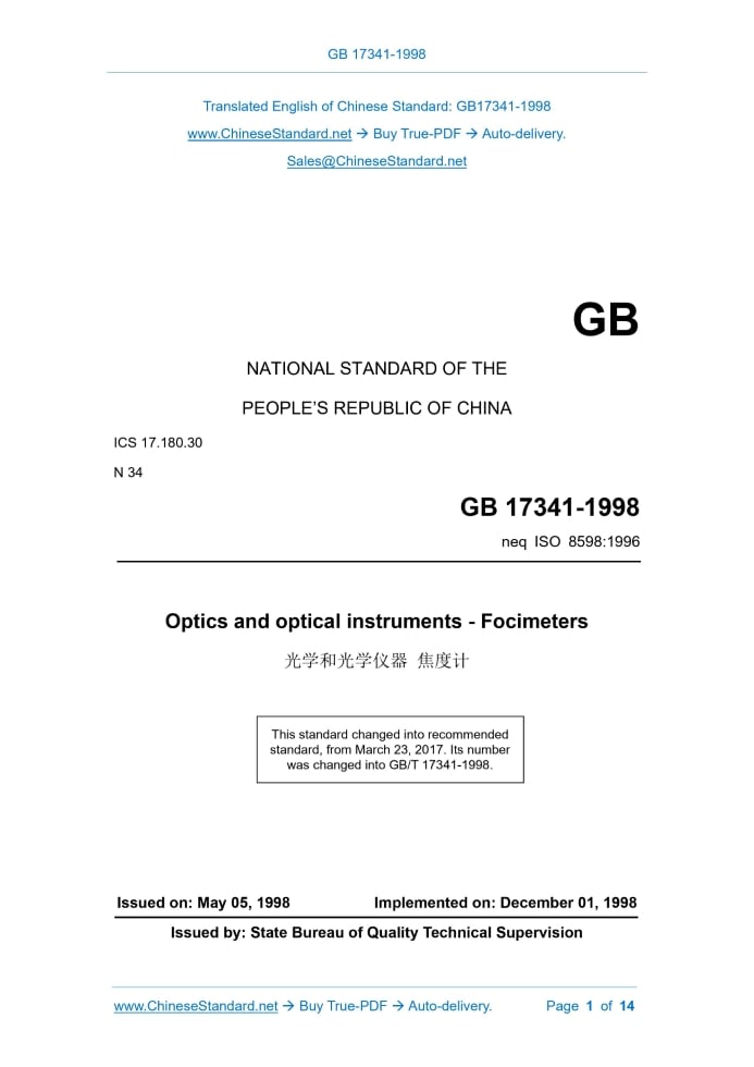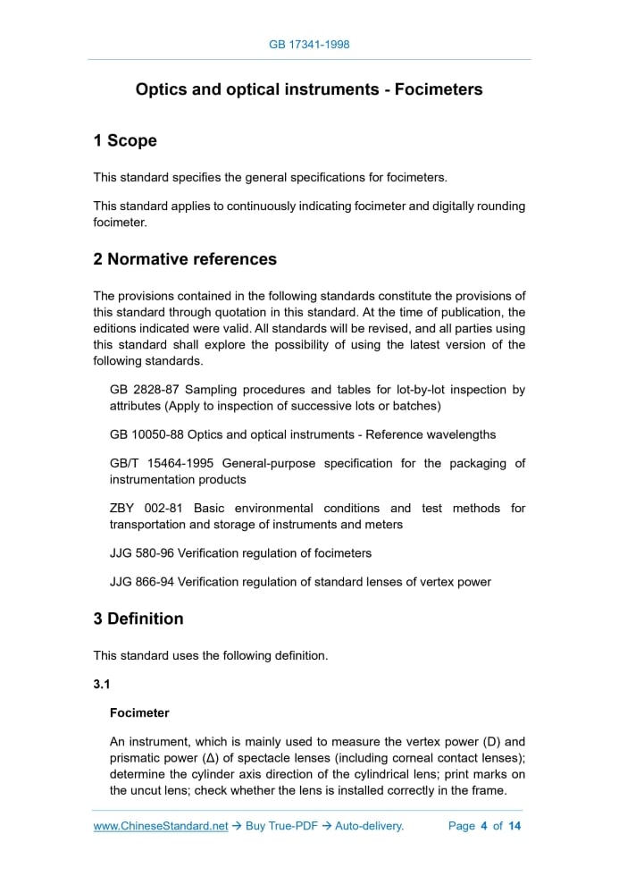 Similar standardsGB/T 17341-1998: [GB/T 17341-1998] Optics and optical instruments. Focimeters---This is an excerpt. Full copy of true-PDF in English version (including equations, symbols, images, flow-chart, tables, and figures etc.), auto-downloaded/delivered in 9 seconds, can be purchased online: https://www.ChineseStandard.net/PDF.aspx/GBT17341-1998GB NATIONAL STANDARD OF THE PEOPLE’S REPUBLIC OF CHINA ICS 17.180.30 N 34 neq ISO 8598.1996 Optics and optical instruments - Focimeters Issued on: MAY 05, 1998 Implemented on: DECEMBER 01, 1998 Issued by. State Bureau of Quality Technical Supervision This standard changed into recommended standard, from March 23, 2017.Its number was changed into GB/T 17341-1998. Table of ContentsForeword... 3 1 Scope... 4 2 Normative references... 4 3 Definition... 4 4 Categories... 6 5 Basic parameters... 6 6 Technical requirements... 7 7 Inspection items and inspection methods... 9 8 Inspection rules... 11 9 Marking, packaging, transportation, storage... 12 Appendix A (Informative) Measurement of vertex power after corneal contact lens... 14 Optics and optical instruments - Focimeters1 ScopeThis standard specifies the general specifications for focimeters. This standard applies to continuously indicating focimeter and digitally rounding focimeter.2 Normative referencesThe provisions contained in the following standards constitute the provisions of this standard through quotation in this standard. At the time of publication, the editions indicated were valid. All standards will be revised, and all parties using this standard shall explore the possibility of using the latest version of the following standards. GB 2828-87 Sampling procedures and tables for lot-by-lot inspection by attributes (Apply to inspection of successive lots or batches) GB 10050-88 Optics and optical instruments - Reference wavelengths GB/T 15464-1995 General-purpose specification for the packaging of instrumentation products ZBY 002-81 Basic environmental conditions and test methods for transportation and storage of instruments and meters JJG 580-96 Verification regulation of focimeters JJG 866-94 Verification regulation of standard lenses of vertex power3 DefinitionThis standard uses the following definition. 3.1 Focimeter An instrument, which is mainly used to measure the vertex power (D) and prismatic power (Δ) of spectacle lenses (including corneal contact lenses); determine the cylinder axis direction of the cylindrical lens; print marks on the uncut lens; check whether the lens is installed correctly in the frame. 3.6 Spherical power The back vertex power of the spherical lens is called the spherical power. Spherical lenses are lenses, which make paraxial parallel light rays converge at one focal point. This definition also applies to single visual distance aspheric lenses. 3.7 Astigmatic power The difference between the two main vertex powers in the cylindrical lens. Cylindrical lenses are lenses, which make paraxial parallel rays converge on two separate and orthogonal focal lines. Unlike spherical lenses, they contain two main vertex powers. One of the main vertex powers can be zero; the corresponding focal line is at infinity. The toric lens, combined spherical and cylindrical lenses, and cylindrical lenses are all cylindrical lenses. Cylindrical lenses are also called astigmatism lenses.4 CategoriesAccording to the display mode, the focimeter is divided into two types. continuous indicating type and digital rounding type. According to the working principle, focimeters are divided into two types. focimeters based on the principle of focusing and imaging AND focimeters based on the principle of autofocus. According to the different observation methods, the focimeter based on the principle of focusing and imaging is further divided into two types. visual type and projection type. The visual focimeter uses a reading telephoto system for observation; whilst the projection type focimeter uses a projection objective lens and a projection screen for observation.5 Basic parameters5.1 Reference wavelength The reference wavelength, which is used to display the vertex power and Use a piece of white paper instead of the inspected lens, to adjust the focus of the eyepiece crosshairs clearly. Then remove the white paper. Focus the measurement target image of the instrument clearly. 7.2.1.2 Inspection of parallax-elimination Adjust the focus of the crosshairs and the target image, according to 7.2.1.1. Then it may check whether the parallax has been eliminated. The observer moves his gaze back and forth above the eyepiece; there shall be no obvious shift between the crosshairs and the target image. 7.2.2 Visually check whether the instrument meets the requirements of 6.5. 7.3 Inspection of vertex power indication Use one group of spherical standard lens (it shall comply with the requirements of JJG 866-94), to check whether the indication error of vertex power meets the requirements of Table 1. 7.3.1 When the lens is not placed, the indication of vertex power of the instrument shall meet the requirements of 6.6.1. 7.3.2 Measure the spherical standard lenses one by one. The indication of vertex power of the instrument shall meet the requirements of 6.6.2. 7.4 Inspection of indication of prismatic power Use a set of prismatic standard lenses (it shall meet the requirements of JJG 866-94), to check whether the indication error of the prismatic power meets the requirements of Table 2. 7.4.1 When checking the prismatic power, it shall first make the vertex power of the instrument become zero. 7.4.2 Measure the prismatic standard lenses in sequence; the indication of prismatic power of the instrument shall meet the requirements of 6.7. 7.5 Inspection of the deviation BETWEEN the axis mark of the optical center of the lens AND the optical axis of the focimeter Use a +15D spherical standard lens (it shall comply with the requirements of JJG 866-94). First align the center, so that the prismati