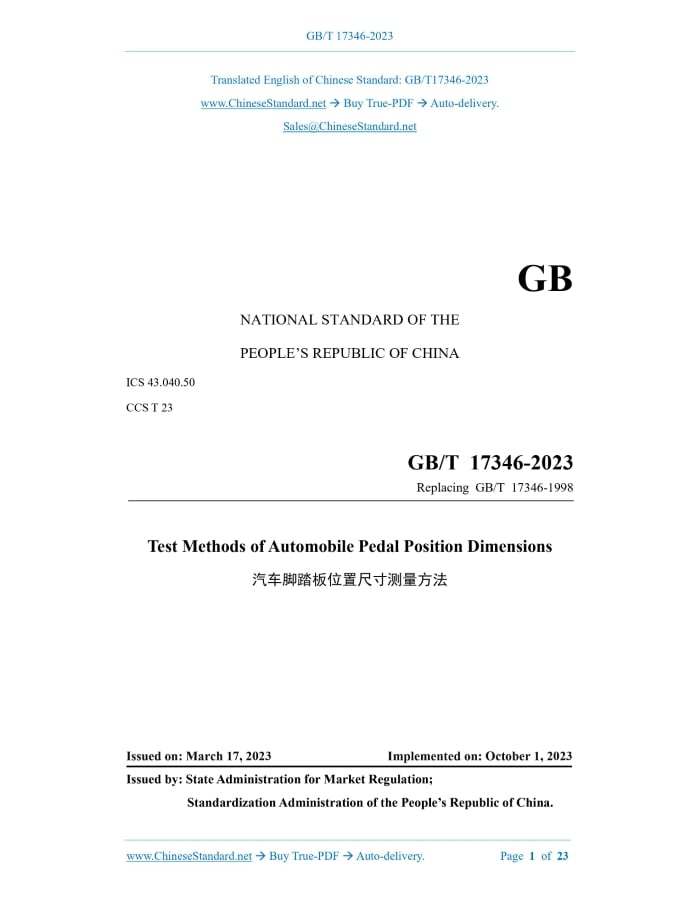 GB/T 17346-2023: Test methods of automobile pedal position dimensions Delivery: 9 seconds. True-PDF full-copy in English & invoice will be downloaded + auto-delivered via email. See step-by-step procedure Status: Valid GB/T 17346: Historical versions