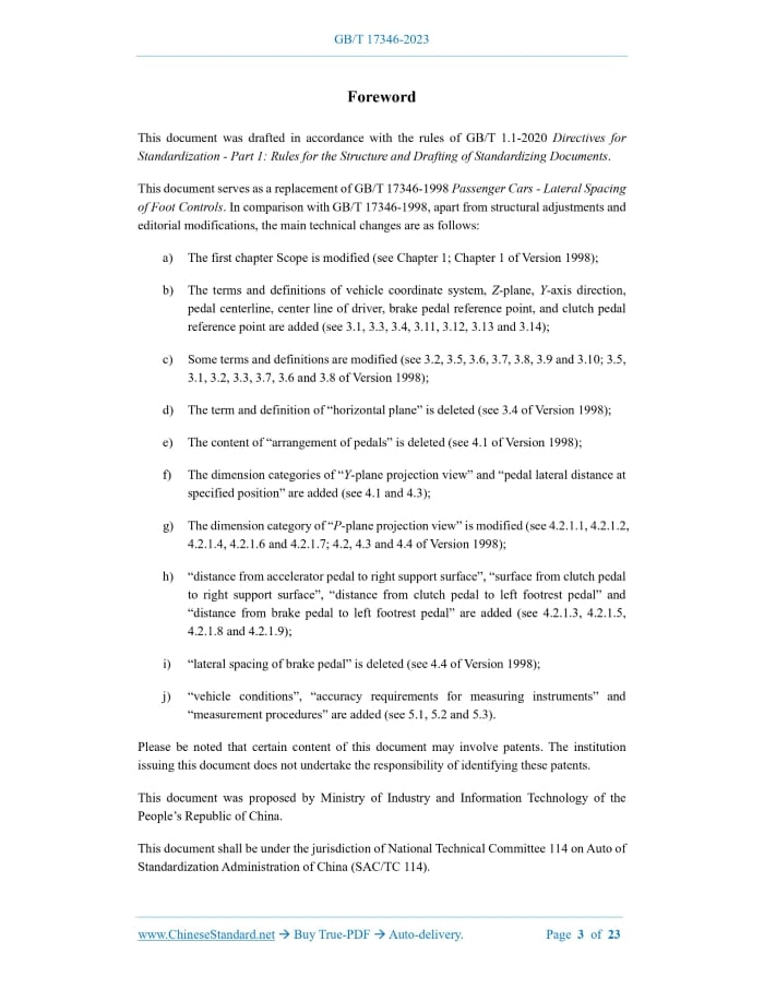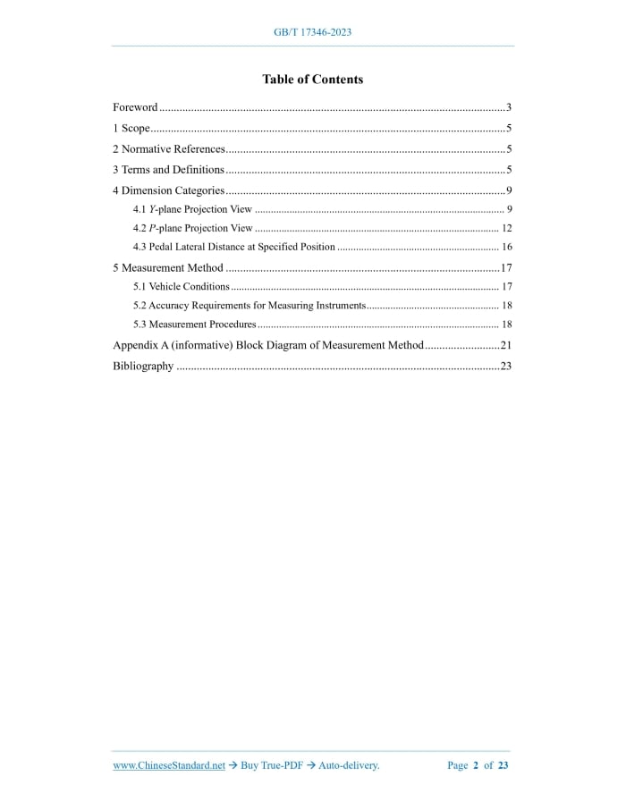 Similar standardsGB/T 17346-2023: Test methods of automobile pedal position dimensions---This is an excerpt. Full copy of true-PDF in English version (including equations, symbols, images, flow-chart, tables, and figures etc.), auto-downloaded/delivered in 9 seconds, can be purchased online: https://www.ChineseStandard.net/PDF.aspx/GBT17346-2023GB NATIONAL STANDARD OF THE PEOPLE’S REPUBLIC OF CHINA ICS 43.040.50 CCS T 23 Replacing GB/T 17346-1998 Test Methods of Automobile Pedal Position Dimensions ISSUED ON: MARCH 17, 2023 IMPLEMENTED ON: OCTOBER 1, 2023 Issued by: State Administration for Market Regulation; Standardization Administration of the People’s Republic of China. Table of ContentsForeword ... 3 1 Scope ... 5 2 Normative References ... 5 3 Terms and Definitions ... 5 4 Dimension Categories ... 9 4.1 Y-plane Projection View ... 9 4.2 P-plane Projection View ... 12 4.3 Pedal Lateral Distance at Specified Position ... 16 5 Measurement Method ... 17 5.1 Vehicle Conditions ... 17 5.2 Accuracy Requirements for Measuring Instruments ... 18 5.3 Measurement Procedures ... 18 Appendix A (informative) Block Diagram of Measurement Method ... 21 Bibliography ... 23ForewordThis document was drafted in accordance with the rules of GB/T 1.1-2020 Directives for Standardization - Part 1: Rules for the Structure and Drafting of Standardizing Documents. This document serves as a replacement of GB/T 17346-1998 Passenger Cars - Lateral Spacing of Foot Controls. In comparison with GB/T 17346-1998, apart from structural adjustments and editorial modifications, the main technical changes are as follows: a) The first chapter Scope is modified (see Chapter 1; Chapter 1 of Version 1998); b) The terms and definitions of vehicle coordinate system, Z-plane, Y-axis direction, pedal centerline, center line of driver, brake pedal reference point, and clutch pedal reference point are added (see 3.1, 3.3, 3.4, 3.11, 3.12, 3.13 and 3.14); c) Some terms and definitions are modified (see 3.2, 3.5, 3.6, 3.7, 3.8, 3.9 and 3.10; 3.5, 3.1, 3.2, 3.3, 3.7, 3.6 and 3.8 of Version 1998); d) The term and definition of “horizontal plane” is deleted (see 3.4 of Version 1998); e) The content of “arrangement of pedals” is deleted (see 4.1 of Version 1998); f) The dimension categories of “Y-plane projection view” and “pedal lateral distance at specified position” are added (see 4.1 and 4.3); g) The dimension category of “P-plane projection view” is modified (see 4.2.1.1, 4.2.1.2, 4.2.1.4, 4.2.1.6 and 4.2.1.7; 4.2, 4.3 and 4.4 of Version 1998); h) “distance from accelerator pedal to right support surface”, “surface from clutch pedal to right support surface”, “distance from clutch pedal to left footrest pedal” and “distance from brake pedal to left footrest pedal” are added (see 4.2.1.3, 4.2.1.5, 4.2.1.8 and 4.2.1.9); i) “lateral spacing of brake pedal” is deleted (see 4.4 of Version 1998); j) “vehicle conditions”, “accuracy requirements for measuring instruments” and “measurement procedures” are added (see 5.1, 5.2 and 5.3). Please be noted that certain content of this document may involve patents. The institution issuing this document does not undertake the responsibility of identifying these patents. This document was proposed by Ministry of Industry and Information Technology of the People’s Republic of China. This document shall be under the jurisdiction of National Technical Committee 114 on Auto of Standardization Administration of China (SAC/TC 114). Test Methods of Automobile Pedal Position Dimensions1 ScopeThis document specifies the dimension categories and measurement methods of automobile pedal position dimensions. This document is applicable to Category-M and Category-N vehicles, and other vehicles may take this as a reference. This document does not apply to pedals other than accelerator pedals, brake pedals and clutch pedals.2 Normative ReferencesThe contents of the following documents constitute indispensable clauses of this document through the normative references in the text. In terms of references with a specified date, only versions with a specified date are applicable to this document. In terms of references without a specified date, the latest version (including all the modifications) is applicable to this document. GB/T 4782-2001 Road Vehicles - Controls, Indicators and Tell-tales - Vocabulary GB/T 12673-2019 Motor Vehicle Main Dimensions Measurement Method GB/T 29120 Procedure for H-point and R-point Determination3 Terms and DefinitionsWhat is defined in GB/T 4782-2001, GB/T 12673-2019 and GB/T 29120, and the following terms and definitions are applicable to this document. 3.1 vehicle coordinate system Vehicle coordinate system consists of three interrelated vertical and orthogonal planes, which are used to determine the positional relationship among planes, axes and points. NOTE: see Figure 1. [source: GB/T 12673-2019, 3.1] Center line of driver refers to the Y-coordinate plane of R point where the driver sits. 3.13 brake pedal reference point Brake pedal reference point refers to the midpoint of the brake pedal centerline or the point at which the brake pedal surface centerline is 200 mm from the heel of shoe on the Y-axis direction view. NOTE 1: for suspended brake pedals, the brake pedal reference point is the midpoint of the brake pedal centerline, or the point specified by the manufacturer. NOTE 2: for floor-standing brake pedals, the brake pedal reference point is the point at which the brake pedal surface centerline is 200 mm from the heel of shoe on the Y-axis direction view, or the point specified by the manufacturer. 3.14 clutch pedal reference point Clutch pedal reference point refers to the midpoint of the clutch pedal centerline or the point at which the clutch pedal surface centerline is 200 mm from the heel of shoe on the Y-axis direction view. NOTE 1: for suspended clutch pedals, the clutch pedal reference point is the midpoint of 