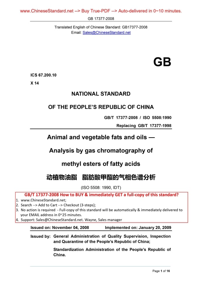 GB/T 17377-2008: Animal and vegetable fats and oils -- Analysis by gas chromatography of methyl esters of fatty acids Delivery: 9 seconds. True-PDF full-copy in English & invoice will be downloaded + auto-delivered via email. See step-by-step procedure Status: Obsolete GB/T 17377: Historical versions