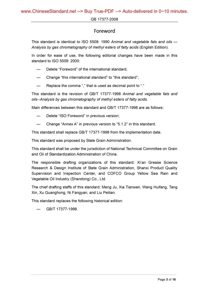 Similar standardsGB/T 17377-2008: Animal and vegetable fats and oils -- Analysis by gas chromatography of methyl esters of fatty acids---This is an excerpt. Full copy of true-PDF in English version (including equations, symbols, images, flow-chart, tables, and figures etc.), auto-downloaded/delivered in 9 seconds, can be purchased online: https://www.ChineseStandard.net/PDF.aspx/GBT17377-2008 GB ICS 67.200.10 X 14 NATIONAL STANDARD OF THE PEOPLE’S REPUBLIC OF CHINA GB/T 17377-2008 / ISO 5508.1990 Replacing GB/T 17377-1998 Animal and vegetable fats and oils — Analysis by gas chromatography of methyl esters of fatty acids (ISO 5508. 1990, IDT) Issued on: NOVEMBER 04, 2008 Implemented on: JANUARY 20, 2009 Issued by. General Administration of Quality Supervision, Inspection and Quarantine of the People’s Republic of China; Standardization Administration of the People’s Republic of China. Table of ContentsForeword ... 3 1 Scope ... 4 2 Normative references ... 4 3 Reagents ... 4 4 Apparatus ... 5 5 Procedure ... 7 6 Expression of results ... 12 7 Special case — Use of a catharometer detector ... 15 8 Test report ... 15ForewordThis standard is identical to ISO 5508. 1990 Animal and vegetable fats and oils — Analysis by gas chromatography of methyl esters of fatty acids (English Edition). In order for ease of use, the following editorial changes have been made in this standard to ISO 5509. 2000. — Delete “Foreword” of the international standard; — Change “this international standard” to “this standard”; — Replace the comma “,” that is used as decimal point to “.” This standard is the revision of GB/T 17377-1998 Animal and vegetable fats and oils--Analysis by gas chromatography of methyl esters of fatty acids. Main differences between this standard and GB/T 17377-1998 are as follows. — Delete “ISO Foreword” in previous version; — Change “Annex A” in previous version to “5.1.2” in this standard. This standard shall replace GB/T 17377-1998 from the implementation date. This standard was proposed by State Grain Administration. This standard shall be under the jurisdiction of National Technical Committee on Grain and Oil of Standardization Administration of China. The responsible drafting organizations of this standard. Xi’an Grease Science Research & Design Institute of State Grain Administration, Shanxi Product Quality Supervision and Inspection Center, and COFCO Group Yellow Sea Rain and Vegetable Oil Industry (Shandong) Co., Ltd. The chief drafting staffs of this standard. Meng Ju, Xia Tianwen, Wang Huifang, Tang Xin, Xu Guanghong, Ni Fangyan, and Liu Peilian. This standard replaces the following historical edition. — GB/T 17377-1998. Animal and vegetable fats and oils — Analysis by gas chromatography of methyl esters of fatty acids1 ScopeThis standard gives general guidance for the application of gas chromatography, using packed or capillary columns, to determine the qualitative and quantitative composition of a mixture of fatty acid methyl esters obtained in accordance with the method specified in GB/T 17376. The method is not applicable to polymerized fatty acids. 2 Normative references The articles contained in the following documents have become part of this standard when they are quoted herein. For the dated documents so quoted, all the modifications (excluding corrections) or revisions made thereafter shall not be applicable to this standard. For the undated documents so quoted, the latest editions shall be applicable to this standard. GB/T17376 Animal and vegetable fats and oils — Preparation of methyl esters of fatty acids (ISO 5509.2000, IDT)3 Reagents3.1 Carrier gas Inert gas (nitrogen, helium, argon, hydrogen, etc.), thoroughly dried and with an oxygen content of less than 10 mg/kg. NOTE 1 Hydrogen, which is used as a carrier gas only with capillary columns, can double the speed of analysis but is hazardous. Safety devices are available. 3.2 Auxiliary gases 3.2.1 Hydrogen (purity ≥ 99.9 %), free from organic impurities. 3.2.2 Air or oxygen, free from organic impurities. The test report shall include all information necessary for the complete identification of the sample. ......Source: Above contents are excerpted from the full-copy PDF -- translated/reviewed by: www.ChineseStandard.net / Wayne Zheng et al. Tips & Frequently Asked Questions:Question 1: How long will the true-PDF of English version of GB/T 17377-2008 be delivered?Answer: The full copy PDF of English version of GB/T 17377-2008 can be downloaded in 9 seconds, and it will also be emailed to you in 9 seconds (double mechanisms to ensure the delivery reliably), with PDF-invoice.Question 2: Can I share the purchased PDF of GB/T 17377-2008_English with my colleagues?Answer: Yes. The purchased PDF of GB/T 17377-2008_English will be deemed to be sold to your employer/organization who actually paid for it, including your colleagues and your employer's intranet.Question 3: Does the price include tax/VAT?Answer: Yes. Our tax invoice, downloaded/delivered in 9 seconds, includes all tax/VAT and complies with 100+ countries' tax regulations (tax exempted in 100+ countries) -- See Avoidance of Double Taxation Agreements (DTAs): List of DTAs signed between Singapore and 100+ countriesQuestion 4: Do you accept my currency other than USD?Answer: Yes. www.ChineseStandard.us -- GB/T 17377-2008 -- Click this link and select your country/currency to pay, the exact amount in your currency will be printed on the invoice. Full PDF will also be downloaded/emailed in 9 seconds.Question 5: Should I purchase the latest version GB/T 17377-2008?Answer: Yes. Unless special scenarios such as technical constraints or academic study, you should always prioritize to purchase the latest version GB/T 17377-2008 even if the enforcement date is in future. Complying with the latest version means that, by default, it also complies with all the earlier versions, technically.How to buy and download a