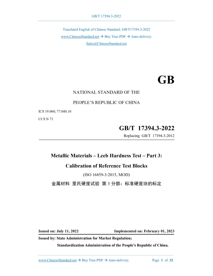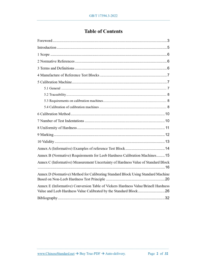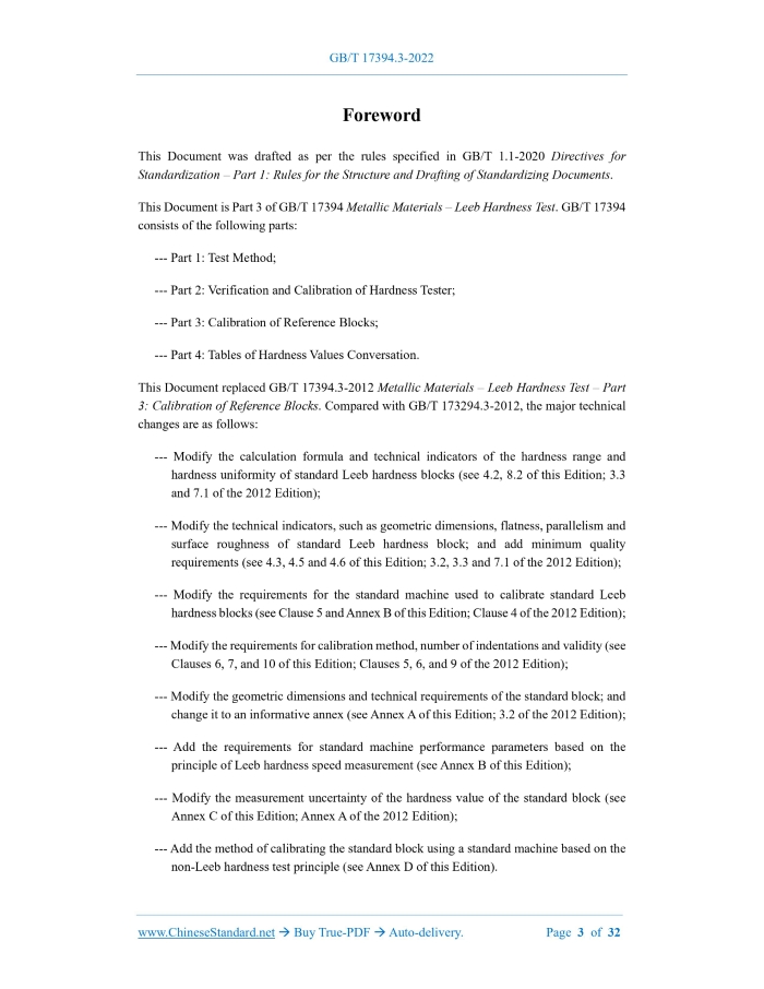 Similar standardsGB/T 17394.3-2022: Metallic materials - Leeb hardness test - Part 3: Calibration of reference test blocks---This is an excerpt. Full copy of true-PDF in English version (including equations, symbols, images, flow-chart, tables, and figures etc.), auto-downloaded/delivered in 9 seconds, can be purchased online: https://www.ChineseStandard.net/PDF.aspx/GBT17394.3-2022 GB NATIONAL STANDARD OF THE PEOPLE’S REPUBLIC OF CHINA ICS 19.060; 77.040.10 CCS N 71 Replacing GB/T 17394.3-2012 Metallic Materials – Leeb Hardness Test – Part 3: Calibration of Reference Test Blocks (ISO 16859-3:2015, MOD) ISSUED ON: JULY 11, 2022 IMPLEMENTED ON: FEBRUARY 01, 2023 Issued by: State Administration for Market Regulation; Standardization Administration of the People’s Republic of China. Table of ContentsForeword ... 3 Introduction ... 5 1 Scope ... 6 2 Normative References ... 6 3 Terms and Definitions ... 6 4 Manufacture of Reference Test Blocks ... 7 5 Calibration Machine ... 7 5.1 General ... 7 5.2 Traceability ... 8 5.3 Requirements on calibration machines ... 8 5.4 Calibration of calibration machines ... 8 6 Calibration Method ... 10 7 Number of Test Indentations ... 10 8 Uniformity of Hardness ... 11 9 Marking ... 12 10 Validity ... 13 Annex A (Informative) Examples of reference Test Block ... 14 Annex B (Normative) Requirements for Leeb Hardness Calibration Machines ... 15 Annex C (Informative) Measurement Uncertainty of Hardness Value of Standard Block ... 16 Annex D (Normative) Method for Calibrating Standard Block Using Standard Machine Based on Non-Leeb Hardness Test Principle ... 20 Annex E (Informative) Conversion Table of Vickers Hardness Value/Brinell Hardness Value and Leeb Hardness Value Calibrated by the Standard Block ... 26 Bibliography ... 32ForewordThis Document was drafted as per the rules specified in GB/T 1.1-2020 Directives for Standardization – Part 1: Rules for the Structure and Drafting of Standardizing Documents. This Document is Part 3 of GB/T 17394 Metallic Materials – Leeb Hardness Test. GB/T 17394 consists of the following parts: --- Part 1: Test Method; --- Part 2: Verification and Calibration of Hardness Tester; --- Part 3: Calibration of Reference Blocks; --- Part 4: Tables of Hardness Values Conversation. This Document replaced GB/T 17394.3-2012 Metallic Materials – Leeb Hardness Test – Part 3: Calibration of Reference Blocks. Compared with GB/T 173294.3-2012, the major technical changes are as follows: --- Modify the calculation formula and technical indicators of the hardness range and hardness uniformity of standard Leeb hardness blocks (see 4.2, 8.2 of this Edition; 3.3 and 7.1 of the 2012 Edition); --- Modify the technical indicators, such as geometric dimensions, flatness, parallelism and surface roughness of standard Leeb hardness block; and add minimum quality requirements (see 4.3, 4.5 and 4.6 of this Edition; 3.2, 3.3 and 7.1 of the 2012 Edition); --- Modify the requirements for the standard machine used to calibrate standard Leeb hardness blocks (see Clause 5 and Annex B of this Edition; Clause 4 of the 2012 Edition); --- Modify the requirements for calibration method, number of indentations and validity (see Clauses 6, 7, and 10 of this Edition; Clauses 5, 6, and 9 of the 2012 Edition); --- Modify the geometric dimensions and technical requirements of the standard block; and change it to an informative annex (see Annex A of this Edition; 3.2 of the 2012 Edition); --- Add the requirements for standard machine performance parameters based on the principle of Leeb hardness speed measurement (see Annex B of this Edition); --- Modify the measurement uncertainty of the hardness value of the standard block (see Annex C of this Edition; Annex A of the 2012 Edition); --- Add the method of calibrating the standard block using a standard machine based on the non-Leeb hardness test principle (see Annex D of this Edition). This Document modifies and adopts ISO 16895-3:2015 Metallic Materials – Leeb Hardness Test – Part 3: Calibration of Reference Test Blocks. Compared with ISO 16895-3:2015, this Document has the following technical differences; the terms to which these differences relate are indicated by a single vertical line (│) in their outer margins. The specific technical differences and their causes are as follows: --- Replace ISO16859-1:2015 with GB/T 17394.1 (see Clause 1, 6.1); --- Replace ISO 16859-2:2015 with GB/T 17394.2-2022 that adopts the revises international standard (see Clause 1, 5.1); --- Replace ISO/IEC 17025:2005 with GB/T 27025-2008 that adopts the revises international standard (see 5.2.1); --- Replace the example of the standard block listed in Annex C of ISO16859-3:2015 by the conventional standard block of China (see Annex A); --- Add Annex D (normative) "Conversion Table between Vickers Hardness Value/Brinell Hardness Value and Leeb Hardness Value Calibrated by Standard Block". Please note some contents of this Document may involve patents. The issuing agency of this Document shall not assume the responsibility to identify these patents. This Document was proposed by China Machinery Industry Federation. This Document shall be under the jurisdiction of National Technical Committee on Tester of Standardization Administration of China (SAC/TC 122). Drafting organizations of this Document: Quanzhou Fengze Donghai Instrument Hardness Block Factory; AVIC Changcheng Institute of Metrology & Measurement; Sinotest Equipment Co., Ltd.; Beijing Times Peak Technology Co., Ltd.; Shenyang TX Testing Instrument Co., Ltd.; Laizhou Huayin Testing Instrument Co., Ltd.; and Metrology and Measurement Institute of Hubei Space Academy. Chief drafting staffs of this Document: Chen Junxin, Shi Wei, Zhang Jinwei, Zhou Cheng, Zhang Luming, Wang Jingtao, and Huang Yongchang. The historical editions replaced by this Document are as follows: --- GB/T 17394.3-2012 was first-time published in 2012; --- It is the first-time revised. Metalli