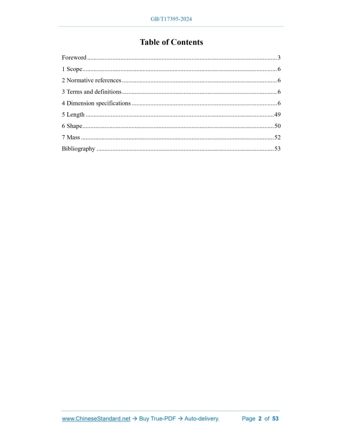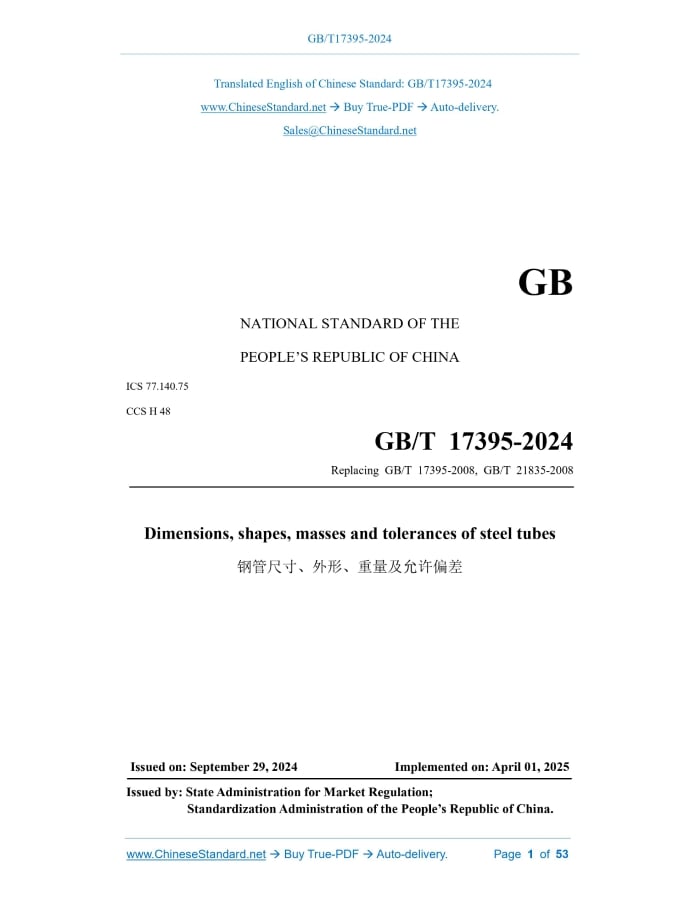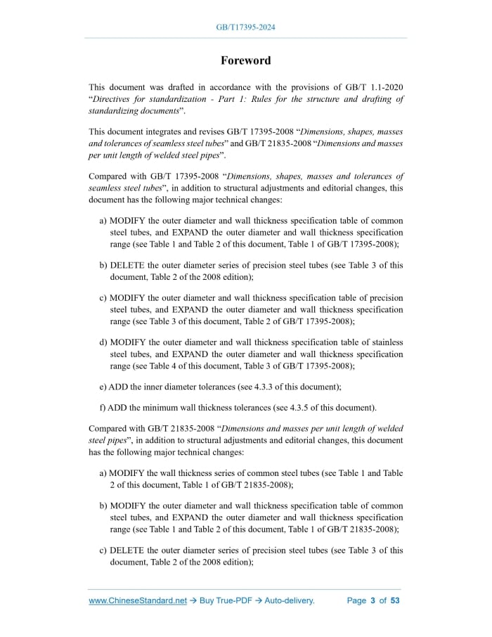 Similar standardsGB/T 17395-2024: Dimensions, shapes, masses and tolerances of steel tubes---This is an excerpt. Full copy of true-PDF in English version (including equations, symbols, images, flow-chart, tables, and figures etc.), auto-downloaded/delivered in 9 seconds, can be purchased online: https://www.ChineseStandard.net/PDF.aspx/GBT17395-2024GB NATIONAL STANDARD OF THE PEOPLE’S REPUBLIC OF CHINA ICS 77.140.75 CCS H 48 GB/T 17395-2024 Replacing GB/T 17395-2008, GB/T 21835-2008 Dimensions, shapes, masses and tolerances of steel tubes Issued on: SEPTEMBER 29, 2024 Implemented on: APRIL 01, 2025 Issued by. State Administration for Market Regulation; Standardization Administration of the People’s Republic of China. Table of ContentsForeword... 3 1 Scope... 6 2 Normative references... 6 3 Terms and definitions... 6 4 Dimension specifications... 6 5 Length... 49 6 Shape... 50 7 Mass... 52 Bibliography... 53ForewordThis document was drafted in accordance with the provisions of GB/T 1.1-2020 “Directives for standardization - Part 1.Rules for the structure and drafting of standardizing documents”. This document integrates and revises GB/T 17395-2008 “Dimensions, shapes, masses and tolerances of seamless steel tubes” and GB/T 21835-2008 “Dimensions and masses per unit length of welded steel pipes”. Compared with GB/T 17395-2008 “Dimensions, shapes, masses and tolerances of seamless steel tubes”, in addition to structural adjustments and editorial changes, this document has the following major technical changes. a) MODIFY the outer diameter and wall thickness specification table of common steel tubes, and EXPAND the outer diameter and wall thickness specification range (see Table 1 and Table 2 of this document, Table 1 of GB/T 17395-2008); b) DELETE the outer diameter series of precision steel tubes (see Table 3 of this document, Table 2 of the 2008 edition); c) MODIFY the outer diameter and wall thickness specification table of precision steel tubes, and EXPAND the outer diameter and wall thickness specification range (see Table 3 of this document, Table 2 of GB/T 17395-2008); d) MODIFY the outer diameter and wall thickness specification table of stainless steel tubes, and EXPAND the outer diameter and wall thickness specification range (see Table 4 of this document, Table 3 of GB/T 17395-2008); e) ADD the inner diameter tolerances (see 4.3.3 of this document); f) ADD the minimum wall thickness tolerances (see 4.3.5 of this document). Compared with GB/T 21835-2008 “Dimensions and masses per unit length of welded steel pipes”, in addition to structural adjustments and editorial changes, this document has the following major technical changes. a) MODIFY the wall thickness series of common steel tubes (see Table 1 and Table 2 of this document, Table 1 of GB/T 21835-2008); b) MODIFY the outer diameter and wall thickness specification table of common steel tubes, and EXPAND the outer diameter and wall thickness specification range (see Table 1 and Table 2 of this document, Table 1 of GB/T 21835-2008); c) DELETE the outer diameter series of precision steel tubes (see Table 3 of this document, Table 2 of the 2008 edition); d) MODIFY the outer diameter and wall thickness specification table of precision steel tubes, and EXPAND the outer diameter and wall thickness specification range (see Table 3 of this document, Table 2 of GB/T 21835-2008); e) MODIFY the outer diameter and wall thickness specification table of stainless steel tubes, and EXPAND the outer diameter and wall thickness specification range (see Table 4 of this document, Table 3 of GB/T 21835-2008); f) ADD the outer diameter and wall thickness tolerances (see 4.3 of this document); g) ADD the length requirements (see Clause5 of this document); h) ADD the shape requirements (see Clause 6 of this document); i) MODIFY the calculation method of the theoretical weight per unit length of steel tubes (see 7.1 of this document, 5.1 and 5.2 of GB/T 21835-2008); j) ADD the mass tolerance requirements (see 7.2 of this document). Attention is drawn to the possibility that some of the elements of this document may be the subject of patent rights. The issuing authority of this document shall not be held responsible for identifying any or all such patent rights. This document was proposed by China Iron and Steel Association. This document shall be under the jurisdiction of National Technical Committee on Steel of Standardization Administration of China (SAC/TC 183). Drafting organizations of this document. China Metallurgical Information and Standardization Institute, Hengyang Valin Steel Tube Co., Ltd., Jiangsu Changbao Pulaisen Steel Tube Co., Ltd., Zhejiang Lunbao Pipe Co., Ltd., Jiangsu Yaxin Precision Technology Co., Ltd., Shanxi Taigang Stainless Steel Tube Co., Ltd., Zhejiang Pacific Seamless Steel Tube Co., Ltd., Chengde Jianlong Special Steel Co., Ltd., Jiangsu Tianhuai Pipe Co., Ltd., Zhejiang Yongshang Special Material Co., Ltd., Panyu Chu Kong Steel Pipe (Zhuhai) Co., Ltd., Huadi Steel Group Co., Ltd., Zhejiang Kingland Pipeline & Technologies Co., Ltd., Jiangyin Hongteng Machinery Co., Ltd., Jiangyin South Stainless Steel Pipes Co., Ltd., Inner Mongolia Bao Gang United Steel Co., Ltd., Shandong Special Equipment Inspection Institute Group Co., Ltd., Jiangsu Chengde Steel Pipe Co., Ltd., Jiangsu Youfa Steel Pipe Co., Ltd., Shandong Juncheng Green Energy Materials Technology Co., Ltd., Handan Zheng Da Pipe Group Co., Ltd., Zhejiang Dewei Stainless Steel Piping Co., Ltd., Zhejiang Compressed Fluid Technology Co., Ltd., Ningbo Huijie Steel Pipe Co., Ltd., Zhejiang Dakai Special Steel Technology Co., Ltd., Hubei Hongruima Steel Tube Co., Ltd. Main drafters of this document. Xue Jianzhong, Niu Liang, Dai Minming, Wang Chaoxian, Mao Minfeng, Li Yi, Huang Dabing, Wang Xueyuan, Li Jinrong, Fang Dewei, Huang Kejian, Zhang Jiang, Yang Weifang, Xue Jun, Xue Jianjun, Wang Zenghai, Song Mingda, Chen Zhong, Wang Lihong, Guo Jianju