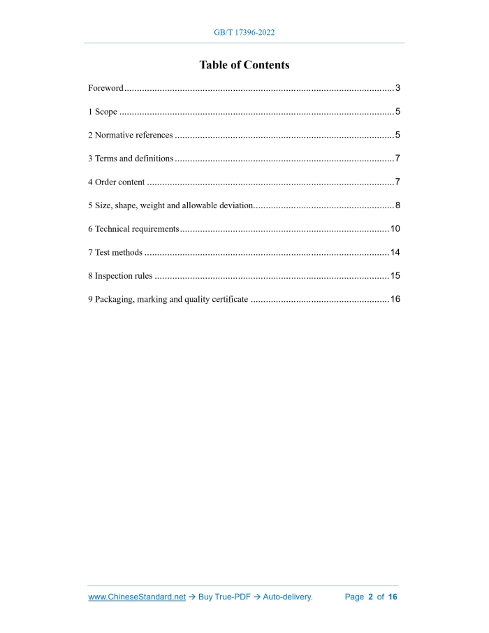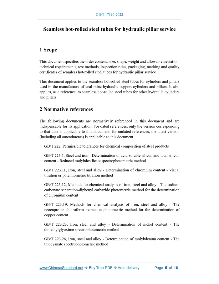 Similar standardsGB/T 17396-2022: Seamless hot-rolled steel tubes for hydraulic pillar service---This is an excerpt. Full copy of true-PDF in English version (including equations, symbols, images, flow-chart, tables, and figures etc.), auto-downloaded/delivered in 9 seconds, can be purchased online: https://www.ChineseStandard.net/PDF.aspx/GBT17396-2022GB NATIONAL STANDARD OF THE PEOPLE’S REPUBLIC OF CHINA ICS 77.140.75 CCS H 48 Replacing GB/T 17396-2009 Seamless hot-rolled steel tubes for hydraulic pillar service Issued on. OCTOBER 12, 2022 Implemented on. MAY 01, 2023 Issued by. State Administration for Market Regulation; Standardization Administration of the People’s Republic of China. Table of ContentsForeword... 3 1 Scope... 5 2 Normative references... 5 3 Terms and definitions... 7 4 Order content... 7 5 Size, shape, weight and allowable deviation... 8 6 Technical requirements... 10 7 Test methods... 14 8 Inspection rules... 15 9 Packaging, marking and quality certificate... 16ForewordThis document was drafted in accordance with the rules given in GB/T 1.1-2020, Directives for standardization - Part 1.Rules for the structure and drafting of standardizing documents. This document replaces GB/T 17396-2009 Hot-rolled seamless steel tubes for hydraulic pillar service; compared with GB/T 17396-2009, in addition to structural adjustments and editorial changes, the main technical changes are as follows. a) Change the allowable deviation of outer diameter and wall thickness (see 5.2; 4.2 of the 2009 edition); b) Change the usual length requirements (see 5.4.1; 4.4.1 of the 2009 edition); c) Change the allowable deviation requirements for specific length and multiple length (see 5.4.2.2; 4.4.2 of the 2009 edition); d) Change the requirements for the curvature in total length (see 5.5.2; 4.5.2 of the 2009 edition); e) Change the weight requirements (see 5.8; 4.7 of the 2009 edition); f) Delete the designation 20, add the designations 27SiMnRE, 30CrMnSi, 30CrMo (see Table 2; Table 2 of the 2009 edition); g) Change the P and S composition requirements of all designations, and change the rare earth content requirements of 30MnNbRE (see Table 2; Table 2 of the 2009 edition); h) Change the smelting method of steel (see 6.2.1; 5.2.1 of the 2009 edition); i) Add the manufacturing method of the tube blank (see 6.2.2); j) Add the mechanical property requirements for the designations 27SiMnRE, 30CrMnSi, and 30CrMo (see 6.4); k) Delete the requirements on the reduction of area in the mechanical properties (see Table 3 of the 2009 edition); l) Change the impact requirements (see 6.4.3; 5.4.4 of the 2009 edition); m) Change the inspection requirements for non-metallic inclusions (see 6.6; 5.6 of the 2009 edition); n) Add non-destructive testing requirements (see 6.8); o) Change the batching rules (see 8.2.3; 7.2.3 of the 2009 edition). Please note that some of the contents of this document may involve patents. The issuing organization of this document is not responsible for identifying patents. This document was proposed by China Iron and Steel Industry Association. This document shall be under the jurisdiction of National Technical Committee 183 on Iron and Steel of Standardization Administration of China (SAC/TC 183). Drafting organizations of this document. Linzhou Fengbao Pipe Co., Ltd., Hunan Valin Hengyang Steel Tube (Group) Co., Ltd., Zhejiang Pacific Seamless Steel Tube Co., Ltd., Inner Mongolia BaoTou Steel Union Co., Ltd., Zhengzhou Coal Mining Machinery Group Co., Ltd., Changsha Dalishen Hydraulic Engineering Co., Ltd., Shandong Huitong Steel Tube Manufacturing Co., Ltd., Jiangyin Huarun Steel Co., Ltd., China Metallurgical Information and Standardization Institute. Chief drafting staffs of this document. Li Jingmin, Xiao Yongzhong, Song Guangxin, Liu Hong, Mi Yongfeng, Guo Yukun, Jiang Hongwei, Liu Lianhui, Gu Yuping, Li Qi, Xiang Peng, Zhou Yong, Bai Binheng, Zhu Hongbo, Wang Wenqiang, Wang Shiming, Xue Jianzhong. This document was published in 1998 for the first time, and revised in 2009 for the first time; this is the second revision. Seamless hot-rolled steel tubes for hydraulic pillar service1 ScopeThis document specifies the order content, size, shape, weight and allowable deviation, technical requirements, test methods, inspection rules, packaging, marking and quality certificates of seamless hot-rolled steel tubes for hydraulic pillar service. This document applies to the seamless hot-rolled steel tubes for cylinders and pillars used in the manufacture of coal mine hydraulic support cylinders and pillars. It also applies, as a reference, to seamless hot-rolled steel tubes for other hydraulic cylinders and pillars.2 Normative referencesThe following documents are normatively referenced in this document and are indispensable for its application. For dated references, only the version corresponding to that date is applicable to this document; for undated references, the latest version (including all amendments) is applicable to this document. GB/T 222, Permissible tolerances for chemical composition of steel products GB/T 223.5, Steel and iron - Determination of acid-soluble silicon and total silicon content - Reduced molybdosilicate spectrophotometric method GB/T 223.11, Iron, steel and alloy - Determination of chromium content - Visual titration or potentiometric titration method GB/T 223.12, Methods for chemical analysis of iron, steel and alloy - The sodium carbonate separation-diphenyl carbazide photometric method for the determination of chromium content GB/T 223.19, Methods for chemical analysis of iron, steel and alloy - The neocuproine-chloroform extraction photometric method for the determination of copper content GB/T 223.23, Iron, steel and alloy - Determination of nickel content - The dimethylglyoxime spectrophotometric method3 Terms and definitionsTerms and definitions determined by GB/T 30062 are applicable to this document.4 Order contentA contract or order for orderi
