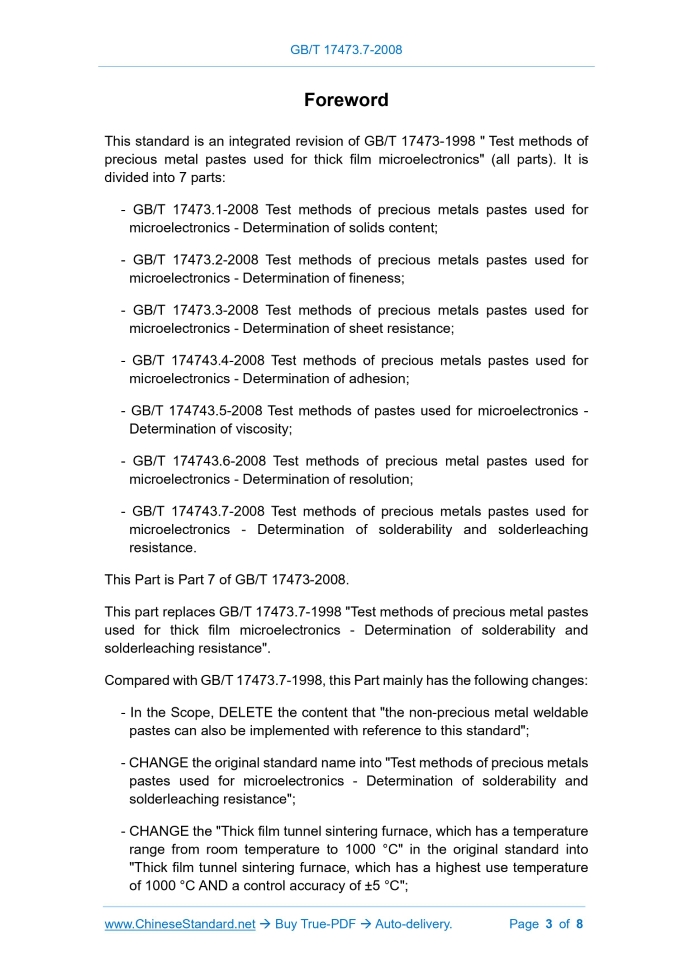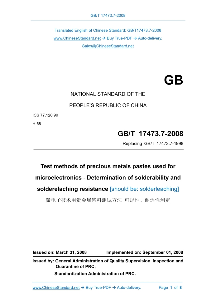 Similar standardsGB/T 17473.7-2008: Test methods of precious metals pastes used for microelectronics -- Determination of solderability and solderelaching resistance---This is an excerpt. Full copy of true-PDF in English version (including equations, symbols, images, flow-chart, tables, and figures etc.), auto-downloaded/delivered in 9 seconds, can be purchased online: https://www.ChineseStandard.net/PDF.aspx/GBT17473.7-2008 GB NATIONAL STANDARD OF THE PEOPLE’S REPUBLIC OF CHINA ICS 77.120.99 H 68 Replacing GB/T 17473.7-1998 Test methods of precious metals pastes used for microelectronics - Determination of solderability and solderelaching resistance [should be. solderleaching] Issued on: MARCH 31, 2008 Implemented on: SEPTEMBER 01, 2008 Issued by. General Administration of Quality Supervision, Inspection and Quarantine of PRC; Standardization Administration of PRC. Table of ContentsForeword... 3 1 Scope... 5 2 Method principle... 5 3 Material... 5 4 Instruments and equipment... 6 5 Measurement procedure... 6 6 Description of measurement results... 7 7 Test report... 8ForewordThis standard is an integrated revision of GB/T 17473-1998 " Test methods of precious metal pastes used for thick film microelectronics" (all parts). It is divided into 7 parts. - GB/T 17473.1-2008 Test methods of precious metals pastes used for microelectronics - Determination of solids content; - GB/T 17473.2-2008 Test methods of precious metals pastes used for microelectronics - Determination of fineness; - GB/T 17473.3-2008 Test methods of precious metals pastes used for microelectronics - Determination of sheet resistance; - GB/T 174743.4-2008 Test methods of precious metals pastes used for microelectronics - Determination of adhesion; - GB/T 174743.5-2008 Test methods of pastes used for microelectronics - Determination of viscosity; - GB/T 174743.6-2008 Test methods of precious metal pastes used for microelectronics - Determination of resolution; - GB/T 174743.7-2008 Test methods of precious metals pastes used for microelectronics - Determination of solderability and solderleaching resistance. This Part is Part 7 of GB/T 17473-2008. This part replaces GB/T 17473.7-1998 "Test methods of precious metal pastes used for thick film microelectronics - Determination of solderability and solderleaching resistance". Compared with GB/T 17473.7-1998, this Part mainly has the following changes. - In the Scope, DELETE the content that "the non-precious metal weldable pastes can also be implemented with reference to this standard"; - CHANGE the original standard name into "Test methods of precious metals pastes used for microelectronics - Determination of solderability and solderleaching resistance"; - CHANGE the "Thick film tunnel sintering furnace, which has a temperature range from room temperature to 1000 °C" in the original standard into "Thick film tunnel sintering furnace, which has a highest use temperature of 1000 °C AND a control accuracy of ±5 °C"; Test methods of precious metals pastes used for microelectronics - Determination of solderability and solderleaching resistance1 ScopeThis standard specifies the method for determining the solderability and solderleaching resistance of precious metal solder pastes, which are used in microelectronics technology. This standard is applicable to the determination of solderability and solderleaching resistance of precious metal solderable pastes, which are used in microelectronics technology.2 Method principleAccording to the degree of immersion saturation of the molten solder on the conductor film, the solderability can be determined visually, through a magnifying glass. According to the change of the area, before and after the metal conductor film is etched in the molten solder, the solderleaching resistance is determined by visual inspection, through a magnifying glass.3 Material3.1 Substrate. Alumina substrate, which has a purity of not less than 95%, AND a surface roughness of 0.5 μm ~ 1.5 μm (measured at a measuring distance of 10 mm). 3.2 Solder. HLSn60PbA or HLSn60PbB solder and lead-free solder SnAg3.0Cu0.5. 3.3 Flux. Rosin alcohol solution, which has a mass concentration of 0.15 g/mL ~ 0.3 g/mL. 3.4 Solder cleaning agent. Ethanol. 5.5.8 Under a magnifying glass, observe the conductor film of the printed pattern on the solder-impregnated substrate. 5.6 Solderleaching test 5.6.1 Determine the solder temperature, based on the melting temperature of the solder. 5.6.2 The solder test is carried out, in accordance with the operating steps 5.5.1 ~ 5.5.6 and 5.5.8. 5.6.3 Determine the immersion time, according to different pastes. 5.6.4 Under the magnifying glass, observe the condition of the conductor film of the printed pattern on the substrate receiving the solder.6 Description of measurement results6.1 Solderability 6.1.1 When observed under a magnifying glass, if the area of the printed pattern conductive film on the substrate, that accepts solder, is not less than 9/10 of the pattern area, THEN the solderability is good; if it is less than 9/10, the solderability is poor. 6.1.2 If the printed pattern on the substrate has 1/10 of the unsoldered area, the solderability is poor. 6.1.3 If a specimen with poor weldability appears in a batch of specimens, take the double quantity of samples for test again, to repeat the operations 5.5.1 ~ 5.5.8.If there is no situation of 6.1.2 occurred on the specimen, the solderability is good; if there is one specimen with poor solderability in the double quantity of specimens, this batch of specimens are poor in solderability. 6.2 Solderleaching 6.2.1 When observed under a magnifying glass, if the area of the printed pattern conductive film on the substrate, that accepts solder, is not less than 9/10 of the pattern area, THEN the solderleaching is good; if it is less than 9/10, the solderleaching is poor. 6.2.2 If the printed pattern on the substrate has 1/10 of the unsoldered area, the solderleaching is poor. 6.2.3 If a specim