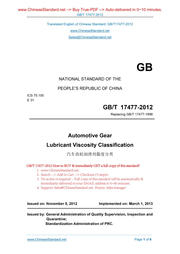 GB/T 17477-2012: Automotive gear lubricant viscosity classification Delivery: 9 seconds. True-PDF full-copy in English & invoice will be downloaded + auto-delivered via email. See step-by-step procedure Status: Valid GB/T 17477: Historical versions
