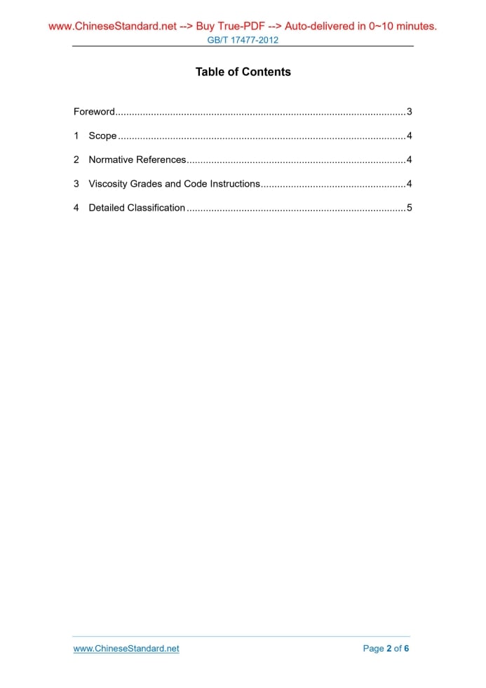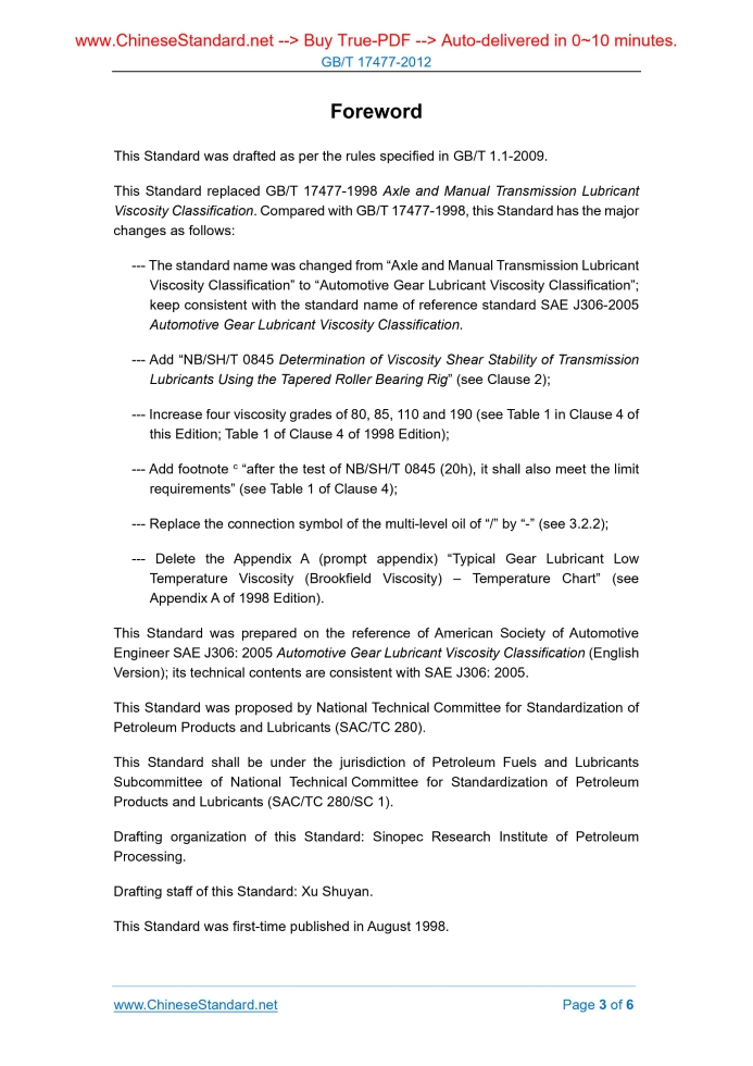 GB/T 17477-2012: Automotive gear lubricant viscosity classification---This is an excerpt. Full copy of true-PDF in English version (including equations, symbols, images, flow-chart, tables, and figures etc.), auto-downloaded/delivered in 9 seconds, can be purchased online: https://www.ChineseStandard.net/PDF.aspx/GBT17477-2012GB NATIONAL STANDARD OF THE PEOPLE’S REPUBLIC OF CHINA ICS 75.100 E 31 Replacing GB/T 17477-1998 Automotive Gear Lubricant Viscosity Classification Issued on: NOVEMBER 5, 2012 Implemented on: MARCH 1, 2013 Issued by. General Administration of Quality Supervision, Inspection and Quarantine; Standardization Administration of PRC. 3. No action is required - Full-copy of this standard will be automatically & immediately delivered to your EMAIL address in 0~60 minutes. Table of ContentsForeword ... 3 1 Scope ... 4 2 Normative References ... 4 3 Viscosity Grades and Code Instructions ... 4 4 Detailed Classification ... 5ForewordThis Standard was drafted as per the rules specified in GB/T 1.1-2009. This Standard replaced GB/T 17477-1998 Axle and Manual Transmission Lubricant Viscosity Classification. Compared with GB/T 17477-1998, this Standard has the major changes as follows. --- The standard name was changed from “Axle and Manual Transmission Lubricant Viscosity Classification” to “Automotive Gear Lubricant Viscosity Classification”; keep consistent with the standard name of reference standard SAE J306-2005 Automotive Gear Lubricant Viscosity Classification. --- Add “NB/SH/T 0845 Determination of Viscosity Shear Stability of Transmission Lubricants Using the Tapered Roller Bearing Rig” (see Clause 2); --- Increase four viscosity grades of 80, 85, 110 and 190 (see Table 1 in Clause 4 of this Edition; Table 1 of Clause 4 of 1998 Edition); --- Add footnote c “after the test of NB/SH/T 0845 (20h), it shall also meet the limit requirements” (see Table 1 of Clause 4); --- Replace the connection symbol of the multi-level oil of “/” by “-” (see 3.2.2); --- Delete the Appendix A (prompt appendix) “Typical Gear Lubricant Low Temperature Viscosity (Brookfield Viscosity) – Temperature Chart” (see Appendix A of 1998 Edition). This Standard was prepared on the reference of American Society of Automotive Engineer SAE J306. 2005 Automotive Gear Lubricant Viscosity Classification (English Version); its technical contents are consistent with SAE J306. 2005. This Standard was proposed by National Technical Committee for Standardization of Petroleum Products and Lubricants (SAC/TC 280). This Standard shall be under the jurisdiction of Petroleum Fuels and Lubricants Subcommittee of National Technical Committee for Standardization of Petroleum Products and Lubricants (SAC/TC 280/SC 1). Drafting organization of this Standard. Sinopec Research Institute of Petroleum Processing. Drafting staff of this Standard. Xu Shuyan. This Standard was first-time published in August 1998. Automotive Gear Lubricant Viscosity Classification1 ScopeThis Standard specifies the viscosity grade, code instruction, detailed classification of automotive gear lubricant. This Standard is applicable to the viscosity classification and marking of automotive gear lubricant. The viscosity grades in the Table 1 only specify the classification limits for automotive gear lubricants from the aspects of rheological properties, other lubricant characteristics are not considered.2 Normative ReferencesThe following documents are essential to the application of this document. For the dated documents, only the versions with the dates indicated are applicable to this document; for the undated documents, only the latest version (including all the amendments) are applicable to this document. GB/T 265 Petroleum Products - Determination of Kinematic Viscosity and Calculation of Dynamic Viscosity GB/T 11145 Standard Test Method for Measurement of Low-Temperature Viscosity of Lubricants - Brookfield Viscometer Method NB/SH/T 0845 Determination of Viscosity Shear Stability of Transmission Lubricants Using the Tapered Roller Bearing Rig3 Viscosity Grades and Code Instructions3.1 Viscosity grades This Standard classifies the viscosity grades according to the lubricant viscosity at the high and low temperature. 3.2 Code instructions ......Source: Above contents are excerpted from the full-copy PDF -- translated/reviewed by: www.ChineseStandard.net / Wayne Zheng et al. Tips & Frequently Asked Questions:Question 1: How long will the true-PDF of English version of GB/T 17477-2012 be delivered?Answer: The full copy PDF of English version of GB/T 17477-2012 can be downloaded in 9 seconds, and it will also be emailed to you in 9 seconds (double mechanisms to ensure the delivery reliably), with PDF-invoice.Question 2: Can I share the purchased PDF of GB/T 17477-2012_English with my colleagues?Answer: Yes. The purchased PDF of GB/T 17477-2012_English will be deemed to be sold to your employer/organization who actually paid for it, including your colleagues and your employer's intranet.Question 3: Does the price include tax/VAT?Answer: Yes. Our tax invoice, downloaded/delivered in 9 seconds, includes all tax/VAT and complies with 100+ countries' tax regulations (tax exempted in 100+ countries) -- See Avoidance of Double Taxation Agreements (DTAs): List of DTAs signed between Singapore and 100+ countriesQuestion 4: Do you accept my currency other than USD?Answer: Yes. www.ChineseStandard.us -- GB/T 17477-2012 -- Click this link and select your country/currency to pay, the exact amount in your currency will be printed on the invoice. Full PDF will also be downloaded/emailed in 9 seconds.Question 5: Should I purchase the latest version GB/T 17477-2012?Answer: Yes. Unless special scenarios such as technical constraints or academic study, you should always prioritize to purchase the latest version GB/T 17477-2012 even if the enforcement date is in future. Complying with the latest version means that, by default, it also compl