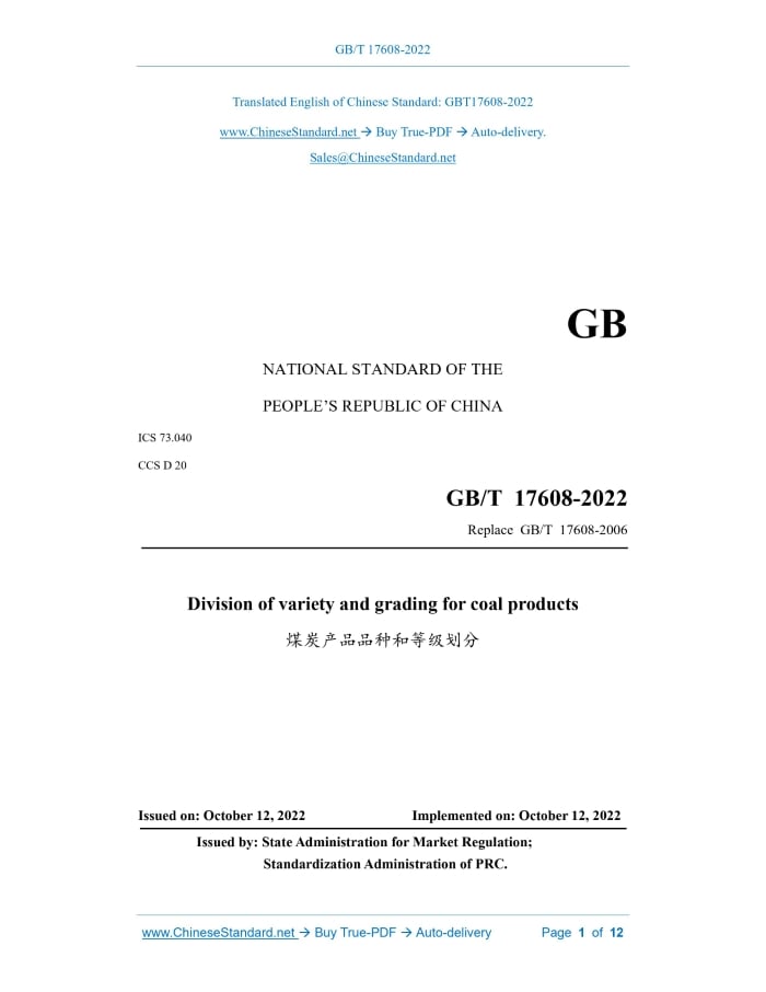 GB/T 17608-2022: Division of variety and grading for coal products Delivery: 9 seconds. True-PDF full-copy in English & invoice will be downloaded + auto-delivered via email. See step-by-step procedure Status: Valid GB/T 17608: Historical versions