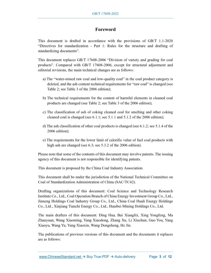 Similar standardsGB/T 17608-2022: Division of variety and grading for coal products---This is an excerpt. Full copy of true-PDF in English version (including equations, symbols, images, flow-chart, tables, and figures etc.), auto-downloaded/delivered in 9 seconds, can be purchased online: https://www.ChineseStandard.net/PDF.aspx/GBT17608-2022GB NATIONAL STANDARD OF THE PEOPLE’S REPUBLIC OF CHINA ICS 73.040 CCS D 20 Replace GB/T 17608-2006 Division of variety and grading for coal products ISSUED ON: OCTOBER 12, 2022 IMPLEMENTED ON: OCTOBER 12, 2022 Issued by: State Administration for Market Regulation; Standardization Administration of PRC. Table of ContentsForeword ... 3 1 Scope ... 5 2 Normative references ... 5 3 Terms and definitions ... 6 4 Granularity division ... 6 5 Classification of varieties ... 6 6 Division of product quality indicators ... 9 7 Test methods ... 11ForewordThis document is drafted in accordance with the provisions of GB/T 1.1-2020 “Directives for standardization - Part 1: Rules for the structure and drafting of standardizing documents”. This document replaces GB/T 17608-2006 “Division of variety and grading for coal products”. Compared with GB/T 17608-2006, except for structural adjustment and editorial revisions, the main technical changes are as follows: a) The “water-mined raw coal and low-quality coal” in the coal product category is deleted, and the ash content technical requirements for “raw coal” is changed (see Table 2; see Table 3 of the 2006 edition); b) The technical requirements for the content of harmful elements in cleaned coal products are changed (see Table 2; see Table 3 of the 2006 edition); c) The classification of ash of coking cleaned coal for smelting and other coking cleaned coal is changed (see 6.1.1; see 5.1.1 and 5.1.2 of the 2006 edition); d) The ash classification of other coal products is changed (see 6.1.2; see 5.1.4 of the 2006 edition); e) The requirements for the lower limit of calorific value of fuel coal products with high ash are changed (see 6.3; see 5.3.2 of the 2006 edition). Please note that some of the contents of this document may involve patents. The issuing agency of this document is not responsible for identifying patents. This document is proposed by the China Coal Industry Association. This document shall be under the jurisdiction of the National Technical Committee on Coal of Standardization Administration of China (SAC/TC42). Drafting organizations of this document: Coal Science and Technology Research Institute Co., Ltd., Coal Operation Branch of China Energy Investment Group Co., Ltd., Jinneng Holdings Coal Industry Group Co., Ltd., China Coal Huali Energy Holdings Co., Ltd., Xinjiang Tianchi Energy Co., Ltd., Huaibei Mining Holdings Co., Ltd. The main drafters of this document: Ding Hua, Bai Xiangfei, Xing Yongfeng, Ma Zhanyuan, Wang Xiaoming, Yang Xiaodong, Zhang Xu, Li Xiuchun, Guo You, Yang Xiaoyu, Wang Yu, Yang Xiaoxin, Wang Dongsheng, He Jin. The publications of previous versions of this document and the documents it replaces are as follows: Division of variety and grading for coal products1 ScopeThis document specifies the division of coal product varieties and coal quality index grades. This document applies to products of anthracite, bituminous coal, and lignite.2 Normative referencesThe following documents contain the provisions which, through normative reference in this document, constitute the essential provisions of this document. For the dated referenced documents, only the versions with the indicated dates are applicable to this document; for the undated referenced documents, only the latest version (including all the amendments) is applicable to this document. GB/T 212 Proximate analysis of coal GB/T 213 Determination of calorific value of coal GB/T 214 Determination of total sulfur in coal GB/T 216 Determination of phosphorus in coal GB/T 477 Method for size analysis of coal GB/T 3058 Determination of arsenic in coal GB/T 3558 Determination of chlorine in coal GB/T 3715 Terms relating to properties and analysis of coal GB/T 4633 Determination of fluorine in coal GB/T 16659 Determination of mercury in coal GB/T 25214 Determination of total sulfur in coal by IR spectrometry GB/T 30732 Proximate analysis of coal by instrumental method MT/T 1 Determination of refuse-content and undersize fraction of commercial coal SN/T 3521 Simultaneous determination of arsenic and mercury content in coal- ......Source: Above contents are excerpted from the full-copy PDF -- translated/reviewed by: www.ChineseStandard.net / Wayne Zheng et al. Tips & Frequently Asked Questions:Question 1: How long will the true-PDF of English version of GB/T 17608-2022 be delivered?Answer: The full copy PDF of English version of GB/T 17608-2022 can be downloaded in 9 seconds, and it will also be emailed to you in 9 seconds (double mechanisms to ensure the delivery reliably), with PDF-invoice.Question 2: Can I share the purchased PDF of GB/T 17608-2022_English with my colleagues?Answer: Yes. The purchased PDF of GB/T 17608-2022_English will be deemed to be sold to your employer/organization who actually paid for it, including your colleagues and your employer's intranet.Question 3: Does the price include tax/VAT?Answer: Yes. Our tax invoice, downloaded/delivered in 9 seconds, includes all tax/VAT and complies with 100+ countries' tax regulations (tax exempted in 100+ countries) -- See Avoidance of Double Taxation Agreements (DTAs): List of DTAs signed between Singapore and 100+ countriesQuestion 4: Do you accept my currency other than USD?Answer: Yes. www.ChineseStandard.us -- GB/T 17608-2022 -- Click this link and select your country/currency to pay, the exact amount in your currency will be printed on the invoice. Full PDF will also be downloaded/emailed in 9 seconds.Question 5: Should I purchase the latest version GB/T 17608-2022?Answer: Yes. Unless special scenarios such as technical constraints or academic study,