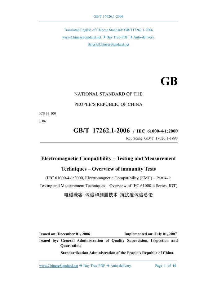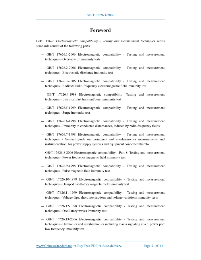 Similar standardsGB/T 17626.1-2006: [Replaced by GB/Z 17626.1-2024] Electromagnetic compatibility -- Testing and measurement techniques -- Overview of immunity tests---This is an excerpt. Full copy of true-PDF in English version (including equations, symbols, images, flow-chart, tables, and figures etc.), auto-downloaded/delivered in 9 seconds, can be purchased online: https://www.ChineseStandard.net/PDF.aspx/GBT17626.1-2006 GB NATIONAL STANDARD OF THE PEOPLE’S REPUBLIC OF CHINA ICS 33.100 L 06 GB/T 17262.1-2006 / IEC 61000-4-1:2000 Replacing GB/T 17626.1-1998 Electromagnetic Compatibility – Testing and Measurement Techniques – Overview of immunity Tests (IEC 61000-4-1:2000, Electromagnetic Compatibility (EMC) – Part 4-1: Testing and Measurement Techniques – Overview of IEC 61000-4 Series, IDT) ISSUED ON: DECEMBER 01, 2006 IMPLEMENTED ON: JULY 01, 2007 Issued by: General Administration of Quality Supervision, Inspection and Quarantine; Standardization Administration of the People’s Republic of China. Table of ContentsForeword ... 3 1 Scope ... 6 2 Normative References ... 6 3 General ... 9 4 Definitions ... 9 5 Structure of the GB/T 17626 Series Standards ... 9 6 Selection of Tests ... 10ForewordGB/T 17626 Electromagnetic compatibility – Testing and measurement techniques series standards consist of the following parts: --- GB/T 17626.1-2006 Electromagnetic compatibility - Testing and measurement techniques - Overview of immunity tests --- GB/T 17626.2-2006 Electromagnetic compatibility - Testing and measurement techniques - Electrostatic discharge immunity test --- GB/T 17626.3-2006 Electromagnetic compatibility - Testing and measurement techniques - Radiated radio-frequency electromagnetic field immunity test --- GB/T 17626.4-1998 Electromagnetic compatibility -Testing and measurement techniques - Electrical fast transient/burst immunity test --- GB/T 17626.5-1999 Electromagnetic compatibility - Testing and measurement techniques - Surge immunity test --- GB/T 17626.6-1998 Electromagnetic compatibility - Testing and measurement techniques - Immunity to conducted disturbances, induced by radio-frequency fields --- GB/T 17626.7-1998 Electromagnetic compatibility - Testing and measurement techniques - General guide on harmonics and interharmonics measurements and instrumentation, for power supply systems and equipment connected thereto --- GB/T 17626.8-2006 Electromagnetic compatibility - Part 8: Testing and measurement techniques - Power frequency magnetic field immunity test --- GB/T 17626.9-1998 Electromagnetic compatibility - Testing and measurement techniques - Pulse magnetic field immunity test --- GB/T 17626.10-1998 Electromagnetic compatibility - Testing and measurement techniques - Damped oscillatory magnetic field immunity test --- GB/T 17626.11-1999 Electromagnetic compatibility - Testing and measurement techniques - Voltage dips, short interruptions and voltage variations immunity tests --- GB/T 17626.12-1998 Electromagnetic compatibility - Testing and measurement techniques - Oscillatory waves immunity test --- GB/T 17626.13-2006 Electromagnetic compatibility - Testing and measurement techniques - Harmonics and interharmonics including mains signaling at a.c. power port low frequency immunity test --- GB/T 17626.14-2005 Electromagnetic Compatibility - Testing and measurement techniques - Voltage fluctuation immunity test --- GB/T 17626.17-2005 Electromagnetic Compatibility - Testing and measurement techniques - Ripple on d.c. input power port immunity test --- GB/T 17626.27-2006 Electromagnetic compatibility - Testing and measurement techniques - Unbalance immunity test --- GB/T 17626.28-2006 Electromagnetic compatibility - Testing and measurement techniques - Variation of power frequency immunity test --- GB/T 17626.29-2006 Electromagnetic compatibility - Testing and measurement techniques - Voltage dips short interruptions and voltage variations on d.c. input power port immunity tests This Part is Part 1 of GB/T 17626. This Part equivalently adopts IEC 61000-4-1(2000) Electromagnetic compatibility (EMC) – Part 4: Testing and measurement techniques – Part 1: Overview of immune tests. This Part gives practical guidance on test and measurement techniques and provides general advice on the selection of relevant tests. This Part replaced GB/T 17626.1-1998 Electromagnetic compatibility - Testing and measurement techniques - Overview of immunity tests since the date of implementation. Compared with GB/T 17626.1-1998, the major changes of this Part are as follows: --- Delete Clause 6 Environmental Conditions, Clause 8 Selection of Severity Levels, and Clause 9 Evaluation of Test Results; --- Delete Appendix A brief description of the immunity test and Appendix B the characteristics of the conducted transient test; --- Add Table 1 select the immunity test according to the installation location (environment); --- Add Table 2 scope of application of the immunity test based on the EUT port. This Part was proposed by China Electricity Council. This Part shall be under the jurisdiction of National Technical Committee on Electromagnetic Compatibility of Standardization Administration of China (SAC/TC 246). Drafting organization of this Part: State Grid Wuhan High Voltage Research Institute. Chief drafting staffs of this Part: Wang Qin, Wu Xiong, Wan Baoquan, Zhang Guangzhou, and Lu Yao. Electromagnetic Compatibility – Testing and Measurement Techniques – Overview of immunity Tests1 ScopeThis Part covers testing and measuring techniques for electric and electronic equipment (apparatus and systems) in its electromagnetic environment. The object of this Part is to give applicability assistance to the technical committees of IEC or other bodies, users and manufacturers of electrical and electronic equipment on EMC standards within the GB/T 17626 series on testing and measurement techniques and to provide general recommendations concerning the choice of relevant tests.2 N