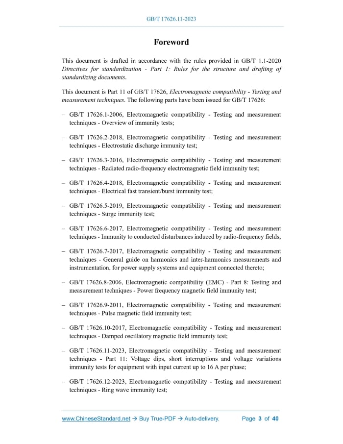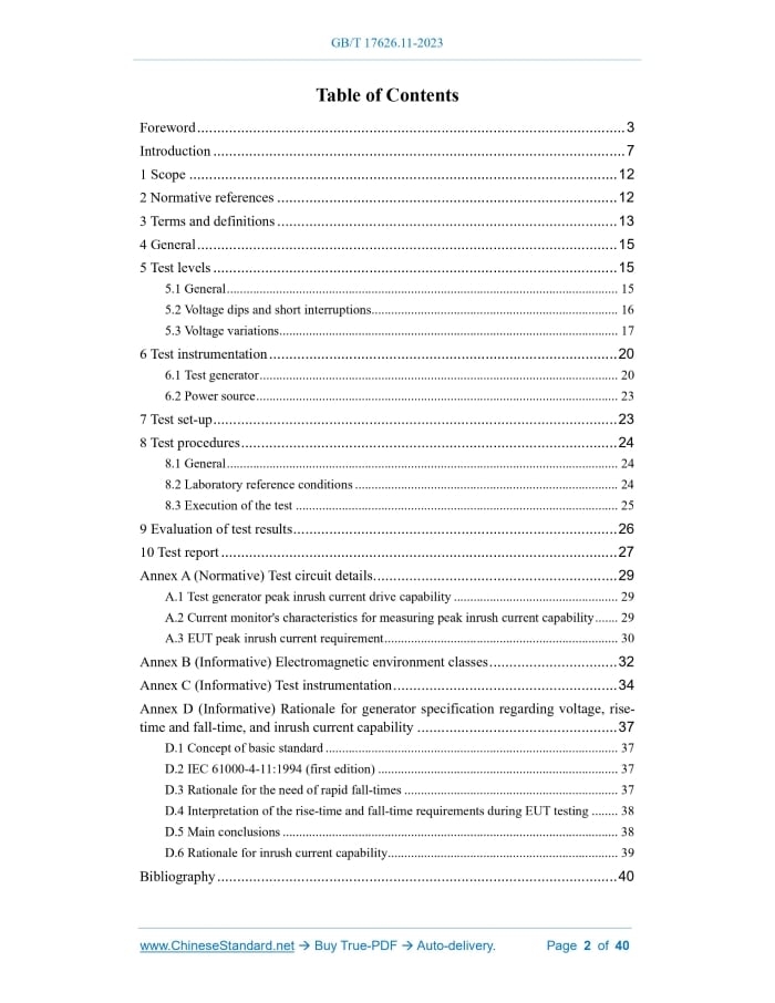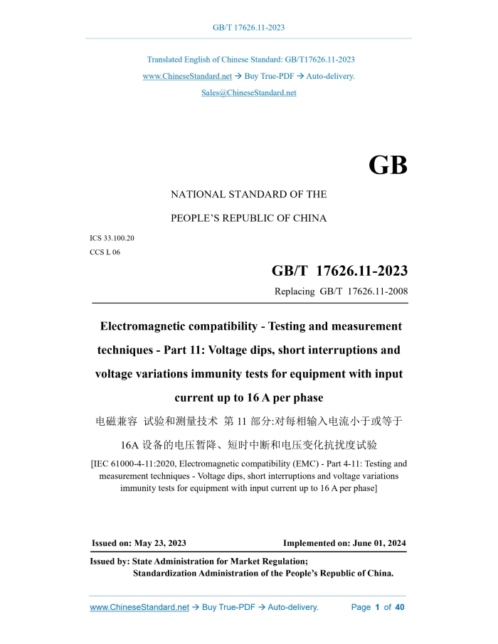 Similar standardsGB/T 17626.11-2023: Electromagnetic compatibility - Testing and measurement techniques - Part 11: Voltage dips, short interruptions and voltage variations immunity tests for equipment with input current up to 16 A per phase---This is an excerpt. Full copy of true-PDF in English version (including equations, symbols, images, flow-chart, tables, and figures etc.), auto-downloaded/delivered in 9 seconds, can be purchased online: https://www.ChineseStandard.net/PDF.aspx/GBT17626.11-2023 GB NATIONAL STANDARD OF THE PEOPLE’S REPUBLIC OF CHINA ICS 33.100.20 CCS L 06 Replacing GB/T 17626.11-2008 Electromagnetic compatibility - Testing and measurement techniques - Part 11.Voltage dips, short interruptions and voltage variations immunity tests for equipment with input current up to 16 A per phase [IEC 61000-4-11.2020, Electromagnetic compatibility (EMC) - Part 4-11.Testing and measurement techniques - Voltage dips, short interruptions and voltage variations immunity tests for equipment with input current up to 16 A per phase] Issued on. MAY 23, 2023 Implemented on. JUNE 01, 2024 Issued by. State Administration for Market Regulation; Standardization Administration of the People’s Republic of China. Table of ContentsForeword... 3 Introduction... 7 1 Scope... 12 2 Normative references... 12 3 Terms and definitions... 13 4 General... 15 5 Test levels... 15 5.1 General... 15 5.2 Voltage dips and short interruptions... 16 5.3 Voltage variations... 17 6 Test instrumentation... 20 6.1 Test generator... 20 6.2 Power source... 23 7 Test set-up... 23 8 Test procedures... 24 8.1 General... 24 8.2 Laboratory reference conditions... 24 8.3 Execution of the test... 25 9 Evaluation of test results... 26 10 Test report... 27 Annex A (Normative) Test circuit details... 29 A.1 Test generator peak inrush current drive capability... 29 A.2 Current monitor's characteristics for measuring peak inrush current capability... 29 A.3 EUT peak inrush current requirement... 30 Annex B (Informative) Electromagnetic environment classes... 32 Annex C (Informative) Test instrumentation... 34 Annex D (Informative) Rationale for generator specification regarding voltage, rise- time and fall-time, and inrush current capability... 37 D.1 Concept of basic standard... 37 D.2 IEC 61000-4-11.1994 (first edition)... 37 D.3 Rationale for the need of rapid fall-times... 37 D.4 Interpretation of the rise-time and fall-time requirements during EUT testing... 38 D.5 Main conclusions... 38 D.6 Rationale for inrush current capability... 39 Bibliography... 401 ScopeThis document defines the immunity test methods and range of preferred test levels for electrical and electronic equipment connected to low-voltage power supply networks for voltage dips, short interruptions, and voltage variations. This document applies to electrical and electronic equipment having a rated input current not exceeding 16 A per phase, for connection to 50 Hz AC networks. It does not apply to electrical and electronic equipment for connection to 400 Hz AC networks. Tests for these networks will be covered by future IEC documents. The object of this document is to establish a common reference for evaluating the immunity of electrical and electronic equipment when subjected to voltage dips, short interruptions and voltage variations. Note 1.Voltage fluctuation immunity tests are covered by IEC 61000-4-14. The test method documented in this document of GB/T 17626 describes a consistent method to assess the immunity of equipment or a system against a defined phenomenon. Note 2.As described in IEC Guide 107, this is a basic EMC publication for use by product committees of the IEC. As also stated in Guide 107, the IEC product committees are responsible for determining whether this immunity test standard should be applied or not, and, if applied, they are responsible for defining the appropriate test levels. Technical committee 77 and its sub- committees are prepared to co-operate with product committees in the evaluation of the value of particular immunity tests for their products.2 Normative referencesThe following documents are referred to in the text in such a way that some or all of their content constitutes requirements of this document. For dated references, only the edition cited applies. For undated references, the latest edition of the referenced document (including any amendments) applies.3 Terms and definitionsFor the purposes of this document, the following terms and definitions apply. 3.1 immunity (to a disturbance) ability of a device, equipment or system to perform without degradation in the presence of an electromagnetic disturbance 3.2 voltage dip sudden reduction of the voltage at a particular point of an electricity supply system below a specified dip threshold followed by its recovery after a brief interval 3.3 short interruption sudden reduction of the voltage on all phases at a particular point of an electric supply system below a specified interruption threshold followed by its restoration after a brief interval Note. Short interruptions are typically associated with switchgear operations related to the occurrence and termination of short circuits on the system or on installations connected to it. 3.4 residual voltage (of voltage dip) minimum value of RMS voltage recorded during a voltage dip or short interruption 3.5 malfunction breakdown of the ability of equipment to carry out intended functions or the execution of unintended functions by the equipment 3.6 calibration method to prove that the measurement equipment is in compliance with its specifications 3.7 verification set of operations which are used to check the test equipment system (e.g., the test generator and the interconnecting cables) to demonstrate that the test system is functioning within the specifications given in Clause 64 GeneralElectrical and electronic equipment can be affected by voltage dips, short interruptions or voltage variations of the power supply. Voltag