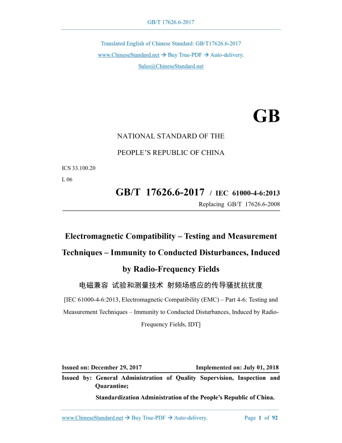 GB/T 17626.6-2017: Electromagnetic compatibility -- Testing and measurement techniques -- Immunity to conducted disturbances, induced by radio-frequency fields Delivery: 9 seconds. True-PDF full-copy in English & invoice will be downloaded + auto-delivered via email. See step-by-step procedure Status: Valid GB/T 17626.6: Historical versions