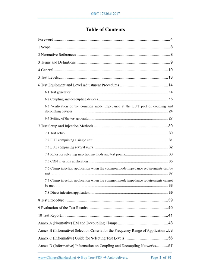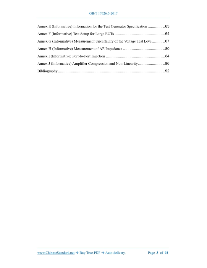 Similar standardsGB/T 17626.6-2017: Electromagnetic compatibility -- Testing and measurement techniques -- Immunity to conducted disturbances, induced by radio-frequency fields---This is an excerpt. Full copy of true-PDF in English version (including equations, symbols, images, flow-chart, tables, and figures etc.), auto-downloaded/delivered in 9 seconds, can be purchased online: https://www.ChineseStandard.net/PDF.aspx/GBT17626.6-2017 GB NATIONAL STANDARD OF THE PEOPLE’S REPUBLIC OF CHINA ICS 33.100.20 L 06 GB/T 17626.6-2017 / IEC 61000-4-6.2013 Replacing GB/T 17626.6-2008 Electromagnetic Compatibility – Testing and Measurement Techniques – Immunity to Conducted Disturbances, Induced by Radio-Frequency Fields [IEC 61000-4-6.2013, Electromagnetic Compatibility (EMC) – Part 4-6.Testing and Measurement Techniques – Immunity to Conducted Disturbances, Induced by Radio- Frequency Fields, IDT] Issued on: DECEMBER 29, 2017 Implemented on: JULY 01, 2018 Issued by. General Administration of Quality Supervision, Inspection and Quarantine; Standardization Administration of the People’s Republic of China. Table of ContentsForeword... 4 1 Scope... 8 2 Normative References... 8 3 Terms and Definitions... 9 4 General... 10 5 Test Levels... 13 6 Test Equipment and Level Adjustment Procedures... 14 6.1 Test generator... 14 6.2 Coupling and decoupling devices... 15 6.3 Verification of the common mode impedance at the EUT port of coupling and decoupling devices... 24 6.4 Setting of the test generator... 27 7 Test Setup and Injection Methods... 30 7.1 Test setup... 30 7.2 EUT comprising a single unit... 31 7.3 EUT comprising several units... 32 7.4 Rules for selecting injection methods and test points... 33 7.5 CDN injection application... 35 7.6 Clamp injection application when the common mode impedance requirements can be met... 37 7.7 Clamp injection application when the common mode impedance requirements cannot be met... 38 7.8 Direct injection application... 39 8 Test Procedure... 39 9 Evaluation of the Test Results... 40 10 Test Report... 41 Annex A (Normative) EM and Decoupling Clamps... 43 Annex B (Informative) Selection Criteria for the Frequency Range of Application.. 53 Annex C (Informative) Guide for Selecting Test Levels... 56 Annex D (Informative) Information on Coupling and Decoupling Networks... 57 Annex E (Informative) Information for the Test Generator Specification... 63 Annex F (Informative) Test Setup for Large EUTs... 64 Annex G (Informative) Measurement Uncertainty of the Voltage Test Level... 67 Annex H (Informative) Measurement of AE Impedance... 80 Annex I (Informative) Port-to-Port Injection... 84 Annex J (Informative) Amplifier Compression and Non-Linearity... 86 Bibliography... 92ForewordCurrently, GB/T 17626 Electromagnetic Compatibility – Testing and Measurement Techniques includes the following parts. --- GB/T 17626.1-2006 Electromagnetic Compatibility - Testing and Measurement Techniques - Overview of Immunity Tests; --- GB/T 17626.2-2006 Electromagnetic Compatibility(EMC) - Testing and Measurement Techniques - Electrostatic Discharge Immunity Test; --- GB/T 17626.3-2016 Electromagnetic Compatibility- Testing and Measurement Techniques- Radiated, Radio-Frequency, Electromagnetic Field Immunity Test; --- GB/T 17626.4-2008 Electromagnetic Compatibility - Testing and Measurement Techniques - Electrical Fast Transient/Burst Immunity Test; --- GB/T 17626.5-2008 Electromagnetic Compatibility - Testing and Measurement Techniques - Surge Immunity Test; --- GB/T 17626.6-2017 Electromagnetic Compatibility - Testing and Measurement Techniques - Immunity to Conducted Disturbances, Induced by Radio-Frequency Fields; --- GB/T 17626.7-2008 Electromagnetic Compatibility - Testing and Measurement Techniques - General Guide on Harmonics and Inter-Harmonics Measurements and Instrumentation for Power Supply Systems and Equipment; --- GB/T 17626.8-2006 Electromagnetic Compatibility (EMC) - Part 8.Testing and Measurement Techniques - Power Frequency Magnetic Field Immunity Test; --- GB/T 17626.9-2011 Electromagnetic Compatibility - Testing and Measurement Techniques - Pulse Magnetic Field Immunity Test; --- GB/T 17626.10-1998 Electromagnetic Compatibility - Testing and Measurement Techniques - Damped Oscillatory Magnetic Field Immunity Test; --- GB/T 17626.11-2008 Electromagnetic Compatibility - Testing and Measurement Techniques - Voltage Dips, Short Interruptions and Voltage Variations Immunity Tests; --- GB/T 17626.12-2013 Electromagnetic Compatibility - Testing and Measurement Techniques - Ring Wave Immunity Test; --- GB/T 17626.13-2006 Electromagnetic Compatibility (EMC) - Testing and Measurement Techniques - Harmonics and Inter-harmonics including Mains Signalling at A.C. Power Port Low Frequency Immunity Test; --- GB/T 17626.14-2005 Electromagnetic Compatibility - Testing and Measurement Techniques - Voltage Fluctuation Immunity Test; --- GB/T 17626.15-2011 Electromagnetic Compatibility—Testing and Measurement Techniques – Flickermeter - Functional and Design Specifications; --- GB/T 17626.16-2007 Electromagnetic Compatibility - Testing and Measurement Techniques - Test for Immunity to Conducted Common Mode Disturbances in the Frequency Range 0 Hz to 150 kHz; --- GB/T 17626.17-2005 Electromagnetic Compatibility - Testing and Measurement Techniques - Ripple on D.C. Input Power Port Immunity Test; --- GB/T 17626.18-2016 Electromagnetic Compatibility - Testing and Measurement Techniques - Damped Oscillatory Wave Immunity Test; --- GB/T 17626.20-2014 Electromagnetic Compatibility - Testing and Measurement Techniques - Emission and Immunity Testing in Transverse Electromagnetic (TEM) Waveguide; --- GB/T 17626.21-2014 Electromagnetic Compatibility - Testing and Measurement Techniques - Reverberation Chamber Test Methods --- GB/T 17626.24-2012 Electromagnetic Compatibility - Testing and Measurement Techniques - Test Methods for Protective Devices for HEMP Conducted Disturbance;