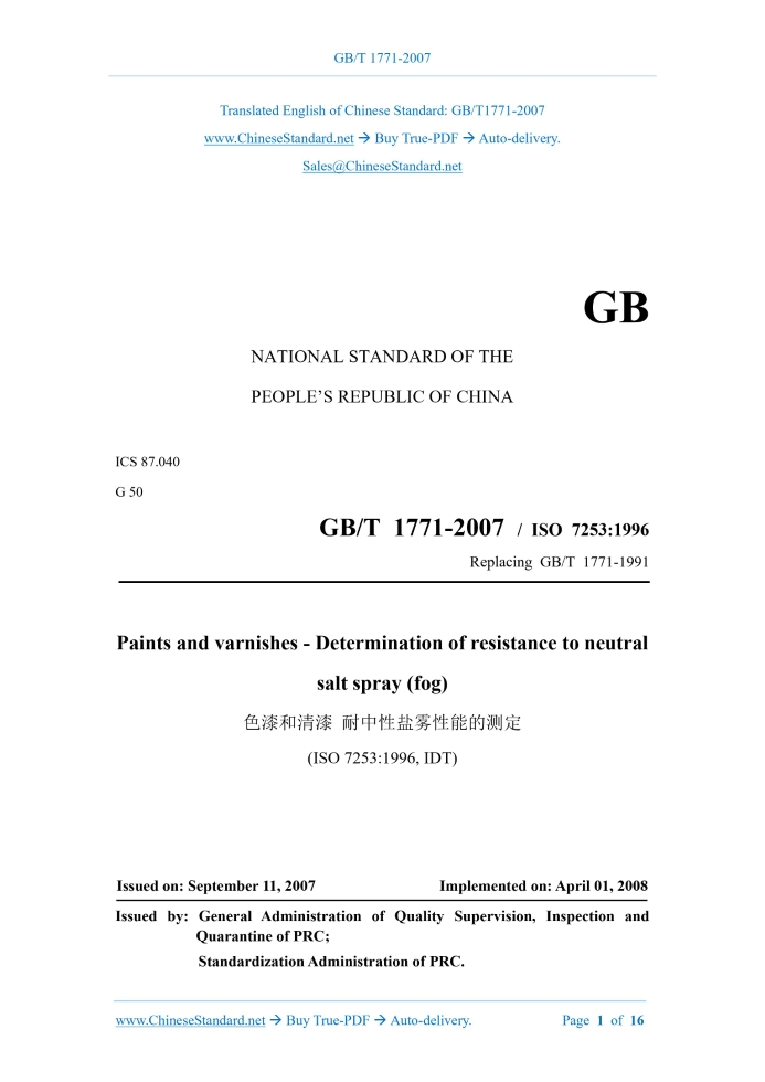GB/T 1771-2007: Paints and Varnishes -- Determination of resistance to neutral salt spray (fog) Delivery: 9 seconds. True-PDF full-copy in English & invoice will be downloaded + auto-delivered via email. See step-by-step procedure Status: Obsolete GB/T 1771: Historical versions