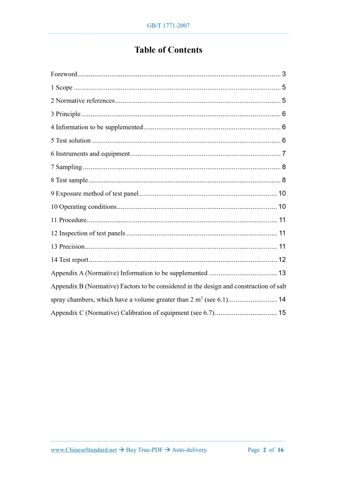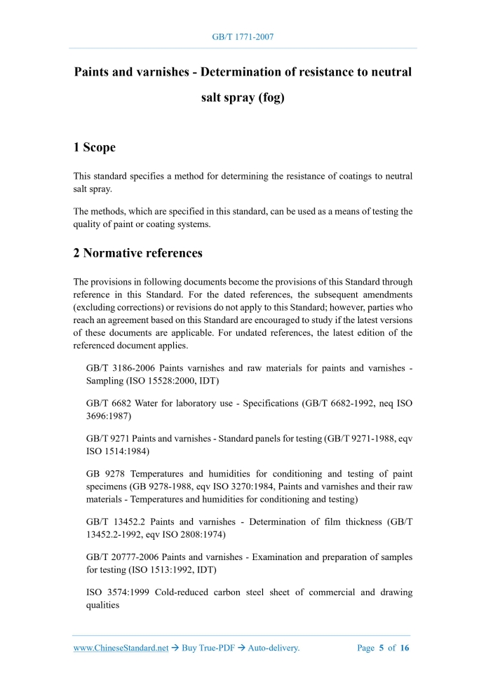 GB/T 1771-2007: Paints and Varnishes -- Determination of resistance to neutral salt spray (fog)---This is an excerpt. Full copy of true-PDF in English version (including equations, symbols, images, flow-chart, tables, and figures etc.), auto-downloaded/delivered in 9 seconds, can be purchased online: https://www.ChineseStandard.net/PDF.aspx/GBT1771-2007NATIONAL STANDARD OF THE PEOPLE’S REPUBLIC OF CHINA ICS 87.040 G 50 GB/T 1771-2007 / ISO 7253:1996 Replacing GB/T 1771-1991 Paints and varnishes - Determination of resistance to neutral salt spray (fog) (ISO 7253:1996, IDT) ISSUED ON: SEPTEMBER 11, 2007 IMPLEMENTED ON: APRIL 01, 2008 Issued by: General Administration of Quality Supervision, Inspection and Quarantine of PRC; Standardization Administration of PRC. Table of ContentsForeword ... 3 1 Scope ... 5 2 Normative references ... 5 3 Principle ... 6 4 Information to be supplemented ... 6 5 Test solution ... 6 6 Instruments and equipment ... 7 7 Sampling ... 8 8 Test sample ... 8 9 Exposure method of test panel ... 10 10 Operating conditions ... 10 11 Procedure ... 11 12 Inspection of test panels ... 11 13 Precision ... 11 14 Test report ... 12 Appendix A (Normative) Information to be supplemented ... 13 Appendix B (Normative) Factors to be considered in the design and construction of salt spray chambers, which have a volume greater than 2 m3 (see 6.1) ... 14 Appendix C (Normative) Calibration of equipment (see 6.7) ... 15 Paints and varnishes - Determination of resistance to neutral salt spray (fog)1 ScopeThis standard specifies a method for determining the resistance of coatings to neutral salt spray. The methods, which are specified in this standard, can be used as a means of testing the quality of paint or coating systems.2 Normative referencesThe provisions in following documents become the provisions of this Standard through reference in this Standard. For the dated references, the subsequent amendments (excluding corrections) or revisions do not apply to this Standard; however, parties who reach an agreement based on this Standard are encouraged to study if the latest versions of these documents are applicable. For undated references, the latest edition of the referenced document applies. GB/T 3186-2006 Paints varnishes and raw materials for paints and varnishes - Sampling (ISO 15528:2000, IDT) GB/T 6682 Water for laboratory use - Specifications (GB/T 6682-1992, neq ISO 3696:1987) GB/T 9271 Paints and varnishes - Standard panels for testing (GB/T 9271-1988, eqv ISO 1514:1984) GB 9278 Temperatures and humidities for conditioning and testing of paint specimens (GB 9278-1988, eqv ISO 3270:1984, Paints and varnishes and their raw materials - Temperatures and humidities for conditioning and testing) GB/T 13452.2 Paints and varnishes - Determination of film thickness (GB/T 13452.2-1992, eqv ISO 2808:1974) GB/T 20777-2006 Paints and varnishes - Examination and preparation of samples for testing (ISO 1513:1992, IDT) ISO 3574:1999 Cold-reduced carbon steel sheet of commercial and drawing qualities ISO 4628-1:2003 Paints and varnishes - Evaluation of degradation of paint coatings - Designation of intensity, quantity and size of common types of defect - Part 1: General principles and rating schemes ISO 4628-2:2003 Paints and varnishes - Evaluation of degradation of coatings - Designation of quantity and size of defects, and of intensity of uniform changes in appearance - Part 2: Assessment of degree of blistering ISO 4628-3:2003 Paints and varnishes - Evaluation of degradation of coatings - Designation of quantity and size of defects, and of intensity of uniform changes in appearance - Part 3: Assessment of degree of rusting ISO 4628-4:2003 Paints and varnishes - Evaluation of degradation of coatings - Designation of quantity and size of defects, and of intensity of uniform changes in appearance - Part 4: Assessment of degree of cracking ISO 4628-5:2003 Paints and varnishes - Evaluation of degradation of coatings - Designation of quantity and size of defects, and of intensity of uniform changes in appearance - Part 5: Assessment of degree of flaking3 PrincipleExpose the painted test panels to neutral salt spray. The results of salt spray exposure are assessed, using principles or standards, which are pre-agreed by the parties concerned.4 Information to be supplementedFor any particular application, the test methods specified in this standard need to be complemented by supplementary information, the items of which are listed in Appendix A.5 Test solution5.1 Preparation of test solution: Dissolve sodium chloride in water, which has a purity of at least grade 3, as specified in GB/T 6682, AND a mass concentration of (50 ± 5) g/L. Sodium chloride shall be white, which has a mass fraction of ≥ 99.5%; it is basically free of copper and nickel; the mass fraction of sodium iodide shall be ≤ 0.1%. 5.2 The pH of the test solution (5.1) shall be adjusted, so that the pH of the spray solution, which is collected in the test chamber (see Chapter 6), is between 6.5 and 7.2. When it exceeds the range, it can be adjusted, by adding analytically pure hydrochloric acid or sodium bicarbonate solution. Note: It shall be noted that the pH value may change, due to the loss of carbon dioxide in the test solution, during spraying. This change can be avoided, by reducing the carbon dioxide content of the solution, for example, by heating the solution to above 35 °C OR using freshly boiled water, before adding the solution to the instrument. 5.3 The test solution shall be filtered, before being injected into the storage tank of the instrument, to prevent solid matter from clogging the nozzle.6 Instruments and equipmentThe equipment is a salt spray test chamber, which shall include the following components. 6.1 The salt spray chamber shall be made of OR lined with materials, which are resistant to corrosion by salt water solutions. It shall be provided with a cover, to prevent condensation from dripping onto 