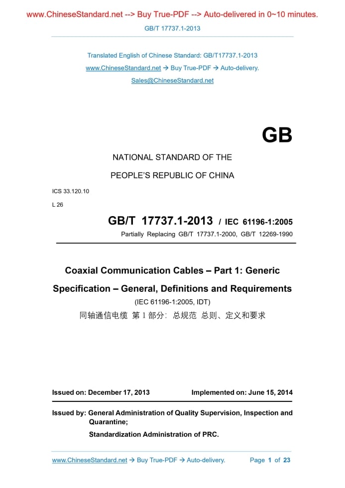 GB/T 17737.1-2013: Coaxial communication cables -- Part 1: Generic specification -- General, definitions and requirements Delivery: 9 seconds. True-PDF full-copy in English & invoice will be downloaded + auto-delivered via email. See step-by-step procedure Status: Valid GB/T 17737.1: Historical versions