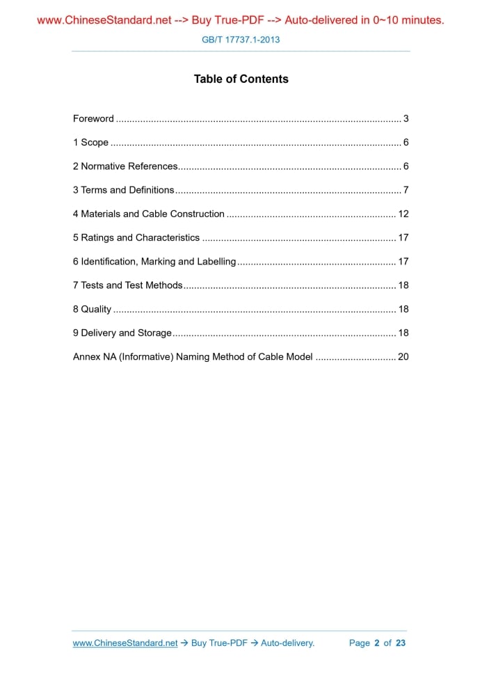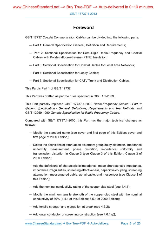 Similar standardsGB/T 17737.1-2013: Coaxial communication cables -- Part 1: Generic specification -- General, definitions and requirements---This is an excerpt. Full copy of true-PDF in English version (including equations, symbols, images, flow-chart, tables, and figures etc.), auto-downloaded/delivered in 9 seconds, can be purchased online: https://www.ChineseStandard.net/PDF.aspx/GBT17737.1-2013 Coaxial communication cables.Part 1. Generic specification.General, definitions and requirements ICS 33.120.10 L26 National Standards of People's Republic of China Partially replace GB/T 17737.1-2000, GB/T 12269-1990 Coaxial communication cables - Part 1. General specification General rules, definitions and requirements Coaxialcommunicationcables-Part 1. Genericspecification- General, definitionsandrequirements (IEC 61196-1.2005, IDT) Released on.2013-12-17 2014-06-15 implementation General Administration of Quality Supervision, Inspection and Quarantine of the People's Republic of China China National Standardization Administration issued ForewordGB/T 17737 "Coax Communication Cable" is divided into the following parts. --- Part 1. General rules, definitions and requirements; --- Part 2. Polytetrafluoroethylene (PTFE) insulated semi-rigid RF coaxial cable sub-specification; --- Part 3. The specification for coaxial cable for local area networks; --- Part 4. Leakage cable sub-specification; --- Part 5. CATV trunk and distribution cables are divided into specifications. This part is the first part of GB/T 17737. This part is drafted in accordance with the rules given in GB/T 1.1-2009. This part replaces GB/T 17737.1-2000 "RF Cables Part 1. General Specifications, Definitions, Requirements and Tests Law and GB/T 12269-1990 "General Specification for Radio Frequency Cables". Compared with GB/T 17737.1-2000, the main technical changes in this section are as follows. ---Modified the name of the standard (see cover and front page,.2000 version cover and home page); --- Removed attenuation distortion, group delay distortion, impedance uniformity measurement, phase distortion, impedance uniformity and transmission distortion in Chapter 3. Definition (see Chapter 3, Chapter 3 of the.2000 edition); --- Increased characteristic impedance, average characteristic impedance, impedance non-uniformity, shielding efficiency, capacitive coupling, shielding attenuation, self-supporting cable, Definition of overhead cables and suspension lines (see Chapter 3); --- Increased the nominal conductivity level of copper clad steel wire (see 4.4.1); --- Revised the minimum tensile strength of the copper-clad steel wire with a nominal conductivity of 30% (see 4.4.1,.2000 version 5.5.1); --- Increased tensile strength and elongation at break (see 4.5.2); --- Increased the structure of the outer conductor or shield [see g. in 4.6.1]; --- Added cable model naming method (see Appendix NA). Compared with GB/T 12269-1990, the main technical changes in this section are as follows. --- Revised the contents of "Model, Term Explanation and Definition" (see Appendix NA, Chapter 3 of the.1990 edition); ---Modified the contents of the "cable structure" (see Chapter 4, Chapter 5 of the.1990 edition). This part uses the translation method equivalent to IEC 61196-1.2005 "Coaxial Communication Cables Part 1. General Specifications, Definitions and Claim". This section has made the following editorial changes. --- Added informative Appendix NA to provide guidance for model naming of domestic products; --- Removed the duplicate b) in 6.3. The documents of our country that have a consistent correspondence with the international documents referenced in this part are as follows. GB/T 2951.11-2008 General Test Methods for Insulating and Sheathing Materials for Cables and Cables - Part 11. General Test Method Mechanical properties test for thickness and dimensions measurement (IEC 60811-1-1.2001, IDT) GB/T 2951.41-2008 General Test Methods for Insulating and Sheathing Materials for Cables and Cables - Part 41. Polyethylene and Poly Specific test methods for propylene mixtures - Environmental stress cracking test - Melt index measurement method - Direct combustion method Carbon black and/or mineral filler content in olefins, thermogravimetric analysis (TGA), carbon black content, microscopic evaluation of polyethylene Medium carbon black dispersion (IEC 60811-4-1..2004, IDT) Please note that some elements of this standard may involve patents. The issuing organization of this standard does not assume responsibility for identifying these patents. This part was proposed by the Ministry of Industry and Information Technology of the People's Republic of China. This part is under the jurisdiction of the National High-Tech Cable and Connector Standardization Technical Committee for Electronic Equipment (SAC/TC190). This section was drafted. The 23rd Research Institute of China Electronics Technology Group Corporation. The main drafters of this section. Zhang Jianping, Wu Xifei, Wu Zhengping. The previous versions of this section partially replace the standard are. ---GB/T 17737.1-1999, GB/T 17737.1-2000, GB/T 12269-1990. Coaxial communication cables - Part 1. General specification General rules, definitions and requirements1 ScopeThis part of GB/T 17737 specifies the general rules, definitions and requirements for the design and test methods of coaxial communication cables. This section applies to coaxial communication cables used in radio communication equipment and electronic devices using similar technologies.2 Normative referencesThe following documents are indispensable for the application of this document. For dated references, only dated versions apply to this article. Pieces. For undated references, the latest edition (including all amendments) applies to this document. GB/T 2421.1-2008 Overview and guidelines for environmental testing of electrical and electronic products (IEC 60068-1.1988, IDT) GB/T 2951.12-2008 - General test methods for ins