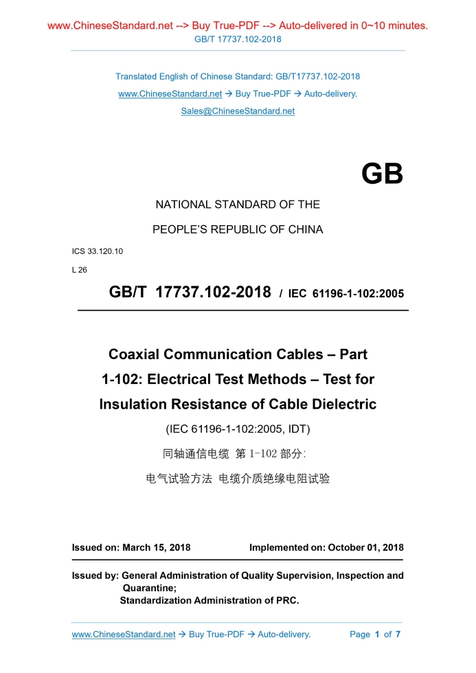 GB/T 17737.102-2018: Coaxial communication cables -- Part 1-102: Electrical test methods -- Test for insulation resistance of cable dielectric Delivery: 9 seconds. True-PDF full-copy in English & invoice will be downloaded + auto-delivered via email. See step-by-step procedure Status: Valid