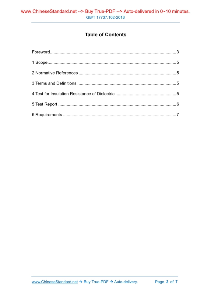 Similar standardsGB/T 17737.102-2018: Coaxial communication cables -- Part 1-102: Electrical test methods -- Test for insulation resistance of cable dielectric---This is an excerpt. Full copy of true-PDF in English version (including equations, symbols, images, flow-chart, tables, and figures etc.), auto-downloaded/delivered in 9 seconds, can be purchased online: https://www.ChineseStandard.net/PDF.aspx/GBT17737.102-2018 Coaxial communication cables--Part 1-102. Electrical test methods--Test for insulation resistance of cable dielectric ICS 33.120.10 L26 National Standards of People's Republic of China Coaxial communication cable Part 1-102. Electrical test methods Cable dielectric insulation resistance test Coaxialcommunicationcables-Part 1-102. Electricaltestmethods- (IEC 61196-1-102.2005, IDT) Published on.2018-03-15 2018-10-01 implementation General Administration of Quality Supervision, Inspection and Quarantine of the People's Republic of China China National Standardization Administration issued ForewordGB/T 17737 "Coax Cable" has been or is planned to release the following parts. --- Part 1. General rules, definitions and requirements; ---Part 1-100. General requirements for electrical test methods; --- Part 1-101. Electrical test method Conductor DC resistance test; --- Part 1-102. Electrical test method cable dielectric insulation resistance test; --- Part 1-1-3. Electrical test method for cable capacitance test; --- Part 1-1-4. Electrical test method for the capacitance stability test of cables; --- Part 1-105. Electrical test method for withstand voltage test of cable media; ---Parts 1-106. Electrical test method - Withstand voltage test for cable sheathing; --- Part 1-107. Electrical test method cable trembling charge level (mechanical induction noise) test; --- Part 1-108. Electrical test methods for characteristic impedance, phase delay, group delay, electrical length and propagation speed test; --- Part 1-110. Electrical test method continuity; --- Part 1-111. Stability test of phase constants of electrical test methods; --- Part 1-112. Electrical test method return loss (impedance consistency) test; --- Part 1-113. Electrical test method attenuation constant test; --- Part 1-114. Electrical test method inductance; --- Part 1-115. Electrical test method impedance uniformity (pulse/step function return loss) test; --- Part 1-161. Electrical test method TDR method to measure characteristic impedance; --- Part 1-119. Electrical test methods - RF rated power; --- Part 1-122. Electrical test method Crosstalk test between coaxial cables; This part is part 1-102 of GB/T 17737. This part is drafted in accordance with the rules given in GB/T 1.1-2009. This part uses the translation method equivalent to IEC 61196-1-102.2005 "Coaxial Communication Cables Part 1-102. Electrical Test Methods Cable dielectric insulation resistance test. This section has made the following editorial changes. --- Will "l--- cable length, the unit is kilometers (km)." Corrected to "l--- cable length, the unit is meters (m)." (see 4.5). Please note that some of the contents of this document may involve patents. The issuing organization of this document is not responsible for identifying these patents. This part was proposed by the Ministry of Industry and Information Technology of the People's Republic of China. This part is under the jurisdiction of the National High-Tech Cable and Connector Standardization Technical Committee for Electronic Equipment (SAC/TC190). This section was drafted. The 23rd Research Institute of China Electronics Technology Group Corporation. The main drafters of this section. Yin Haicheng, Fang Xu, Tian Xin. Coaxial communication cable Part 1-102. Electrical test methods Cable dielectric insulation resistance test1 ScopeThis part of GB/T 17737 applies to coaxial communication cables. It specifies the test method for determining the insulation resistance of a coaxial cable.2 Normative referencesThe following documents are indispensable for the application of this document. For dated references, only dated versions apply to this article. Pieces. For undated references, the latest edition (including all amendments) applies to this document. Coaxial communication cables - Part 1. General rules, definitions and requirements (IEC 61196-1.2005, IDT)3 Terms and definitionsThe terms and definitions defined in GB/T 17737.1-2013 apply to this document.4 dielectric insulation resistance test4.1 Principle The purpose of this test is to determine the DC insulation resistance of the medium between the inner conductor of the cable and the outer conductor (or shield), or to determine the cable guide. DC insulation resistance of the medium between the body and the additional shield or metal component. 4.2 Test equipment Test equipment includes. ---DC power supply. greater than 80Vd.c., no more than 500Vd.c. ---Megohmmeter. The range is not less than 2 × 105MΩ. 4.3 Sample preparation The test shall be carried out on the delivery length of the finished cable, after pretreatment at a temperature of 15 ° C to 35 ° C and checking the continuity of the conductor. Both ends of the conductor should be stripped of insulation. 4.4 steps Unless otherwise specified, the insulation resistance shall be measured between the inner and outer conductors and/or between the outer conductor and the additional metal component. If the cable is in question Not specified in the specification, the test voltage should be 500V and the charging time should be at least 1min. 4.5 Results The insulation resistance is expressed in MΩ·km. When the length of the sample is not 1000m, the measured value shall be corrected as follows. R=Rm· In the formula. R --- corrected insulation resistance in megaohm kilometers (MΩ·km); Rm---Measurement of insulation resistance in megaohms (MΩ); l --- Cable length in meters (m).5 test reportThe test report should give the following test conditions. --- Temperature, in degrees Celsius (°