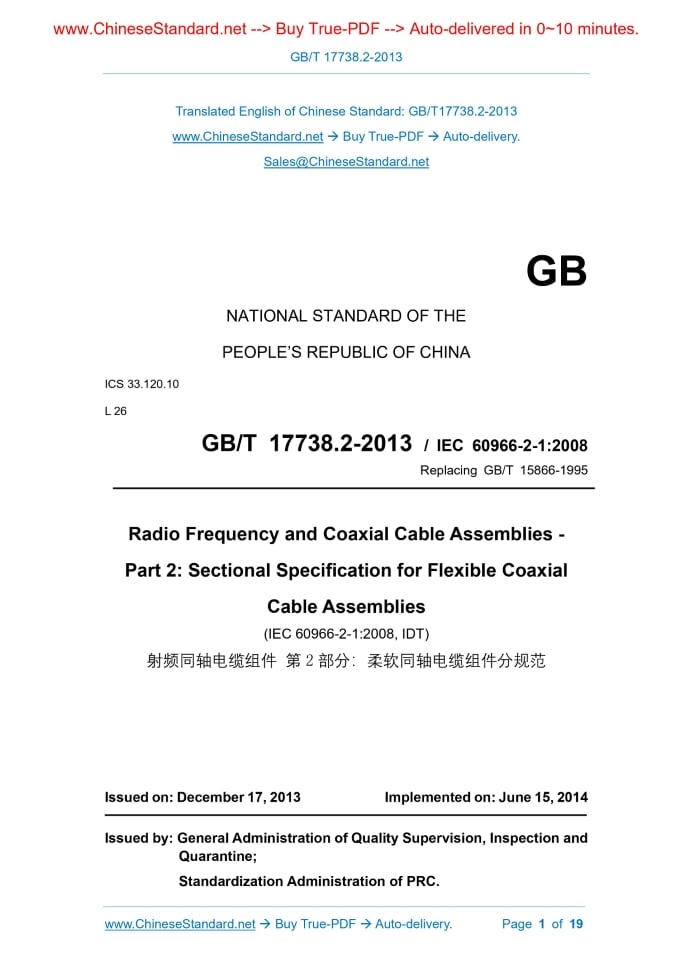 GB/T 17738.2-2013: Radio frequency and coaxial cable assemblies -- Part 2: Sectional specification for flexible coaxial cable assemblies Delivery: 9 seconds. True-PDF full-copy in English & invoice will be downloaded + auto-delivered via email. See step-by-step procedure Status: Valid