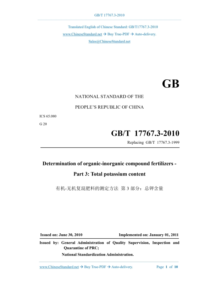GB/T 17767.3-2010: Determination of organic-inorganic compound fertilizers -- Part 3: Total potassium content Delivery: 9 seconds. True-PDF full-copy in English & invoice will be downloaded + auto-delivered via email. See step-by-step procedure Status: Valid GB/T 17767.3: Historical versions