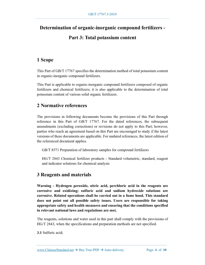 Similar standardsGB/T 17767.3-2010: Determination of organic-inorganic compound fertilizers -- Part 3: Total potassium content---This is an excerpt. Full copy of true-PDF in English version (including equations, symbols, images, flow-chart, tables, and figures etc.), auto-downloaded/delivered in 9 seconds, can be purchased online: https://www.ChineseStandard.net/PDF.aspx/GBT17767.3-2010 GB NATIONAL STANDARD OF THE PEOPLE’S REPUBLIC OF CHINA ICS 65.080 G 20 Replacing GB/T 17767.3-1999 Determination of organic-inorganic compound fertilizers - Part 3: Total potassium content ISSUED ON: JUNE 30, 2010 IMPLEMENTED ON: JANUARY 01, 2011 Issued by: General Administration of Quality Supervision, Inspection and Quarantine of PRC; National Standardization Administration. Table of ContentsForeword ... 3 1 Scope ... 4 2 Normative references ... 4 3 Reagents and materials ... 4 4 Instruments and equipment ... 5 5 Preparation of specimen solution ... 5 6 Analytical procedures ... 6 Determination of organic-inorganic compound fertilizers - Part 3: Total potassium content1 ScopeThis Part of GB/T 17767 specifies the determination method of total potassium content in organic-inorganic compound fertilizers. This Part is applicable to organic-inorganic compound fertilizers composed of organic fertilizers and chemical fertilizers; it is also applicable to the determination of total potassium content of various solid organic fertilizers.2 Normative referencesThe provisions in following documents become the provisions of this Part through reference in this Part of GB/T 17767. For the dated references, the subsequent amendments (excluding corrections) or revisions do not apply to this Part; however, parties who reach an agreement based on this Part are encouraged to study if the latest versions of these documents are applicable. For undated references, the latest edition of the referenced document applies. GB/T 8571 Preparation of laboratory samples for compound fertilizers HG/T 2843 Chemical fertilizer products - Standard volumetric, standard, reagent and indicator solutions for chemical analysis3 Reagents and materialsWarning - Hydrogen peroxide, nitric acid, perchloric acid in the reagents are corrosive and oxidizing; sulfuric acid and sodium hydroxide solutions are corrosive. Related operations shall be carried out in a fume hood. This standard does not point out all possible safety issues. Users are responsible for taking appropriate safety and health measures and ensuring that the conditions specified in relevant national laws and regulations are met. The reagents, solutions and water used in this part shall comply with the provisions of HG/T 2843, when the specifications and preparation methods are not specified. 3.1 Sulfuric acid; 3.2 Hydrogen peroxide; 3.3 Nitric acid; 3.4 Perchloric acid; 3.5 Sodium tetraphenylborate solution precipitant: 15 g/L; 3.6 Sodium tetraphenylborate washing solution: 1.5 g/L; 3.7 Disodium ethylenediaminetetraacetic acid (EDTA) solution: 40 g/L; 3.8 Sodium hydroxide solution: 400 g/L; 3.9 Phenolphthalein: 5 g/L ethanol solution; dissolve 0.5 g of phenolphthalein in 100 mL of 95% (volume fraction) ethanol; 3.10 Potassium oxide standard stock solution: 1.00 mg/mL. Weigh 1.5828 g of potassium chloride which was dried at 110 °C for 2 h. Dissolve it in water; adjust the volume to 1 L volumetric flask. Mix well. 1 mL of this solution contains 1.00 mg of potassium oxide (K2O). Store it in a plastic bottle; 3.11 Potassium oxide standard solution: 100 μg/mL Pipette 25.0 mL of potassium oxide standard stock solution (3.10) into a 250 mL volumetric flask. Use water to dilute it to the mark. Mix well. 1 mL of this solution contains 100 μg of potassium oxide (K2O).4 Instruments and equipment4.1 Common laboratory instruments; 4.2 Glass crucible filter: No.4, volume 30 mL; 4.3 Electric constant temperature drying oven: temperature can be controlled at (120 ± 5) °C; 4.4 Flame photometer.5 Preparation of specimen solutionMake parallel determinations of two samples. Prepare laboratory samples according to GB/T 8571. When preparing the specimen, grind the sample until it passes through a 1 mm test sieve. If the sample is difficult to crush, grind it until it passes through a 2 mm test sieve. For specimens with potassium content (K2O) < 2%, flame photometry is used for determination; weigh 2 g of specimen. For specimens with potassium content (K2O) ≥ 2%, potassium tetraphenylborate gravimetric method is used for determination. When 2% ≤ potassium content (K2O) < 5%, weigh 4 g of specimen. When potassium content (K2O) ≥ 5%, weigh 2 g of specimen, accurate to 0.0002 g. Prepare the specimen solution by one of the following methods. 5.1 Nitric acid-perchloric acid digestion method Place the specimen in a 250 mL tall beaker. Add 20 mL of nitric acid. Shake carefully. Heat on an electric hot plate in a fume hood, until it is almost dry. Add 10 mL of perchloric acid after cooling slightly. Cover with a watch glass. Slowly heat until white smoke of perchloric acid is emitted. Continue heating until the solution is colorless or light-colored clear liquid (note that it cannot be evaporated dry!). Cool to room temperature. Transfer the digestion solution into a 250 mL volumetric flask. Use water to dilute it to the mark. Mix well. Dry filter it. Discard the first 50 mL filtrate. 5.2 Sulfuric acid-hydrogen peroxide digestion method Place the sample in a 500 mL conical flask. Add 20 mL of concentrated sulfuric acid and 3 mL ~ 5 mL of hydrogen peroxide. Shake carefully. Let it stand for 12 h ~ 15 h. Add 3 mL ~ 5 mL of hydrogen peroxide. Insert a pear-shaped funnel. Slowly heat to boiling in a fume hood with a 1500 W electric stove. Continue heating for 30 min. Remove it. If the solution is not clear, add 3 mL of hydrogen peroxide in batches after cooling slightly. Digest in batches, until the solution is colorless or light-colored clear liquid. Continue heating for 10 min. Cool to room temperature. 